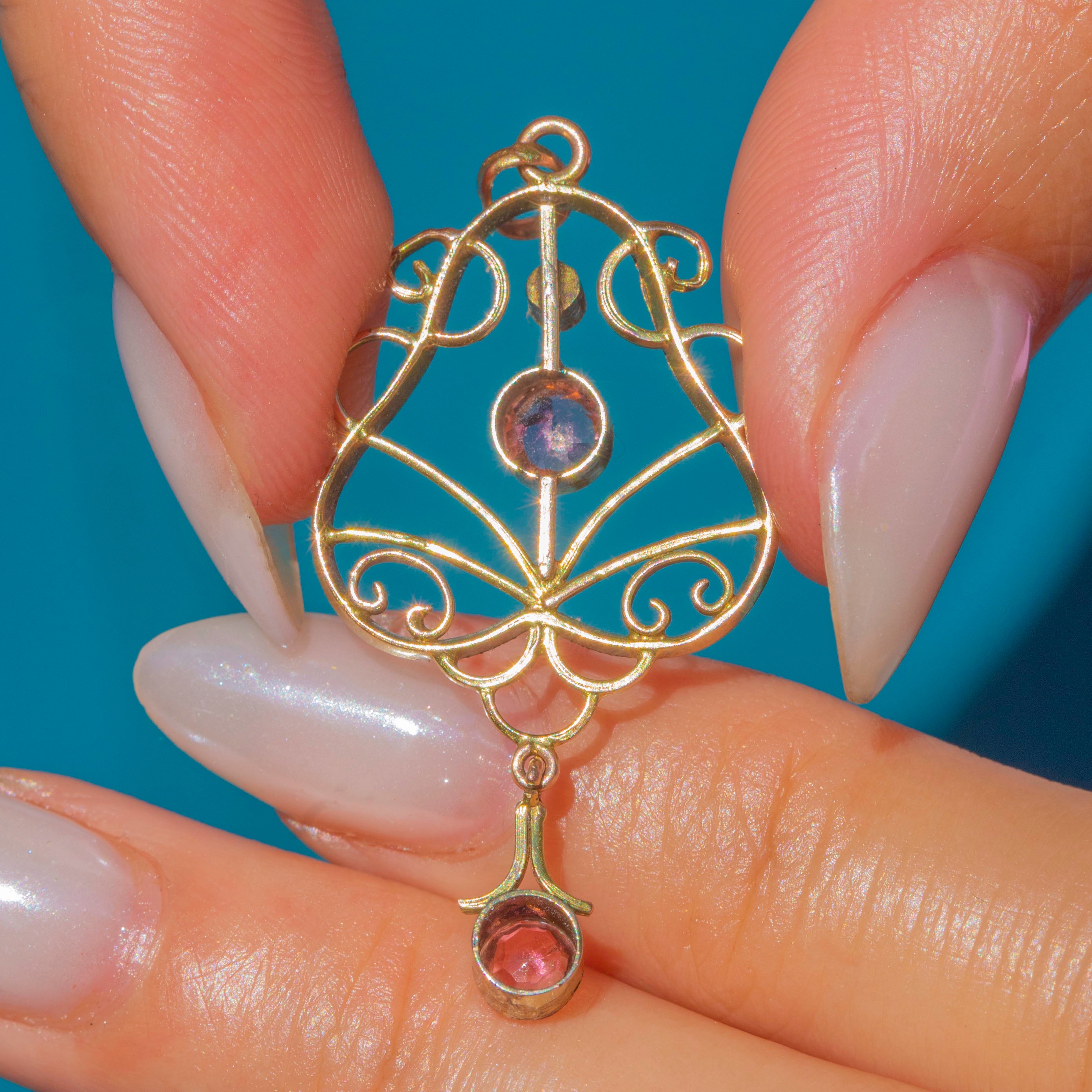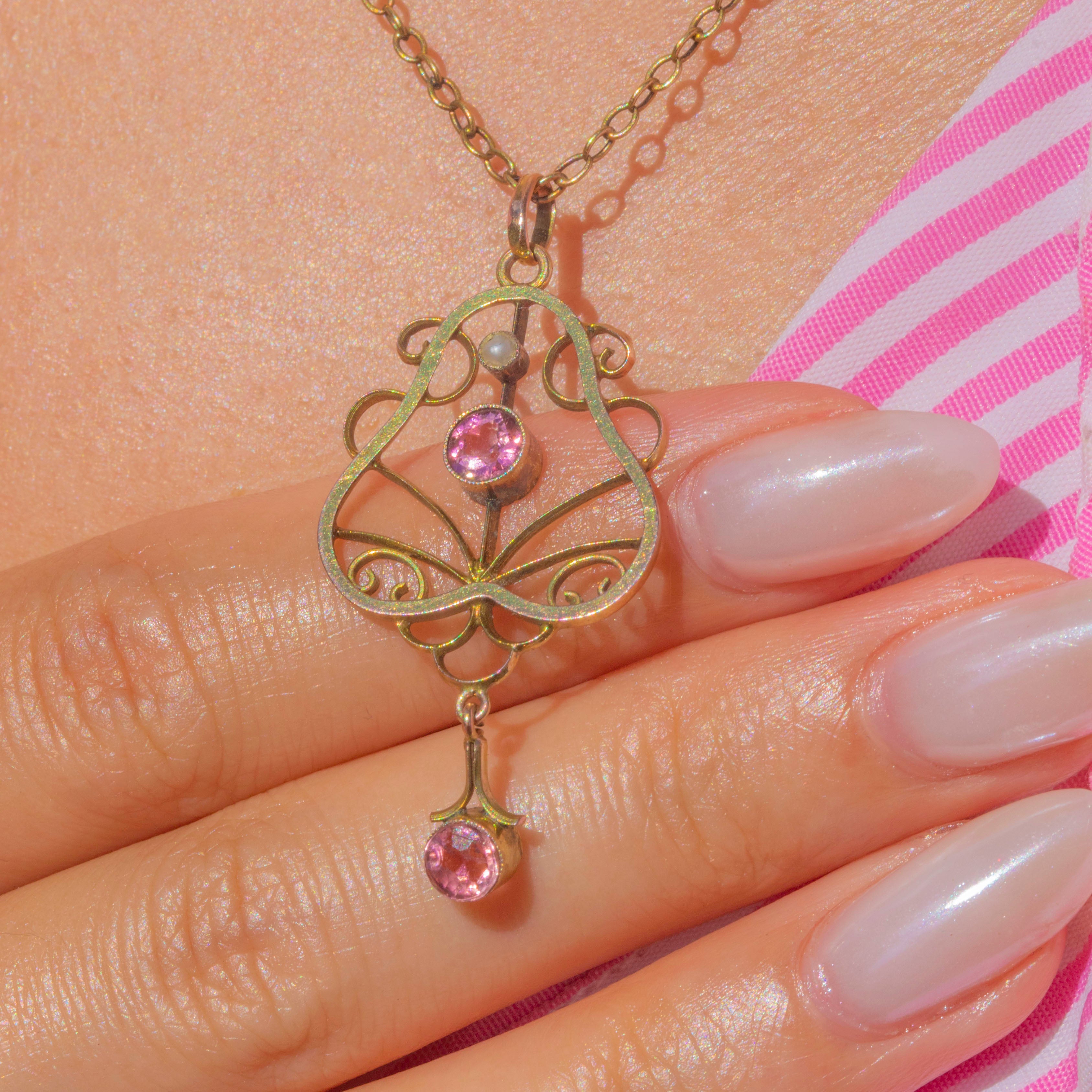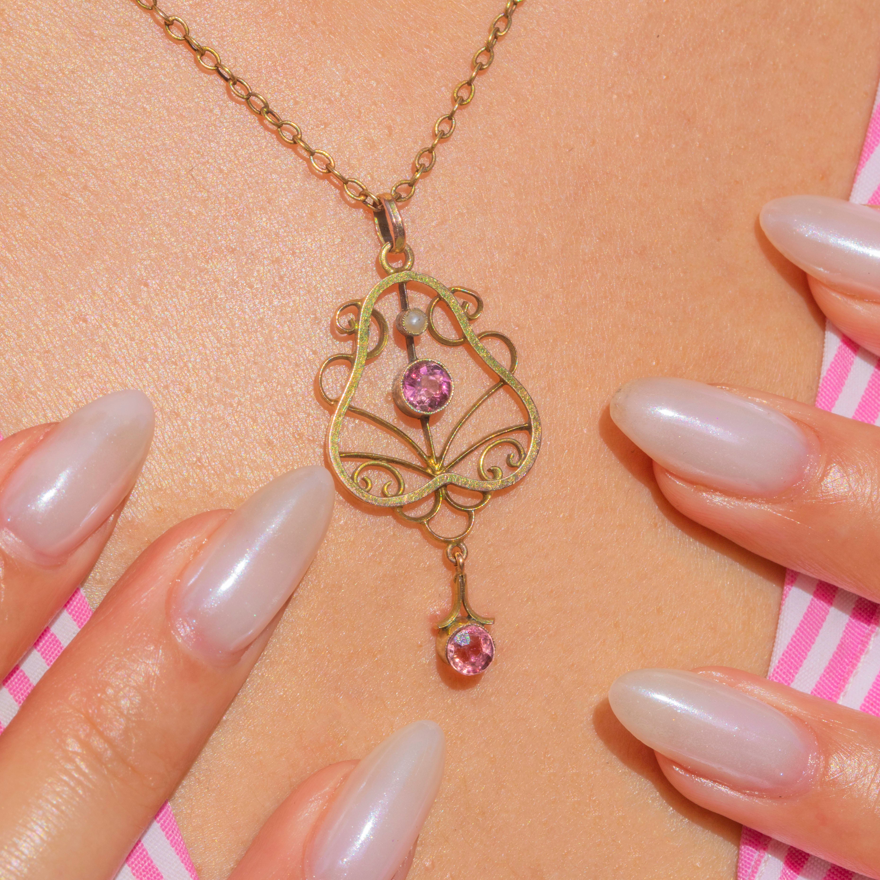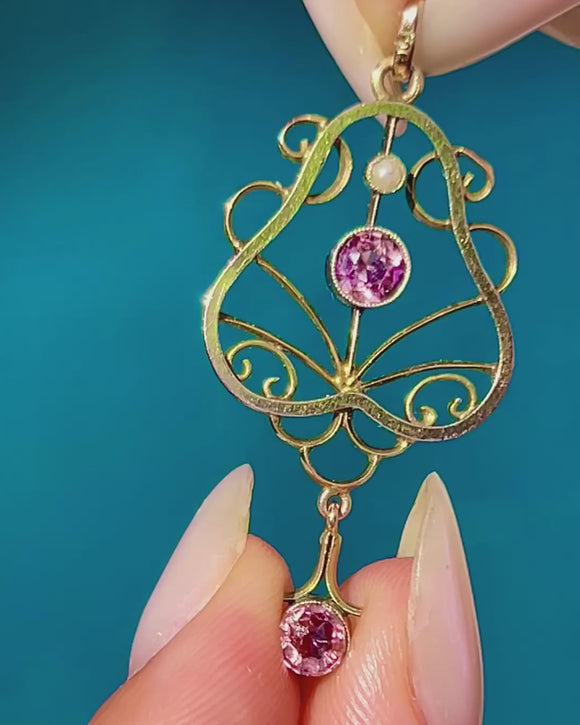 Antique 9ct Gold Pink Tourmaline Pearl Lavalier Pendant