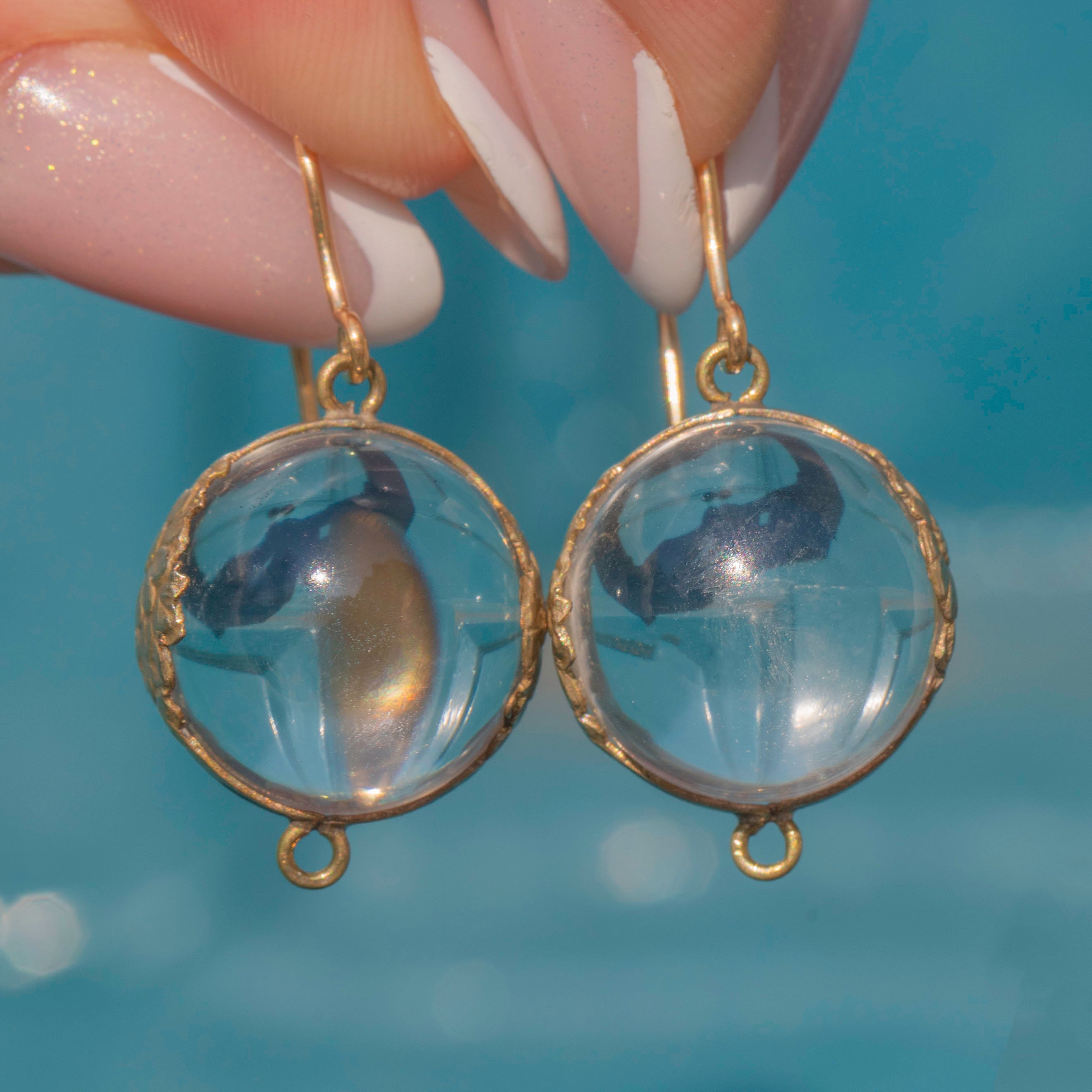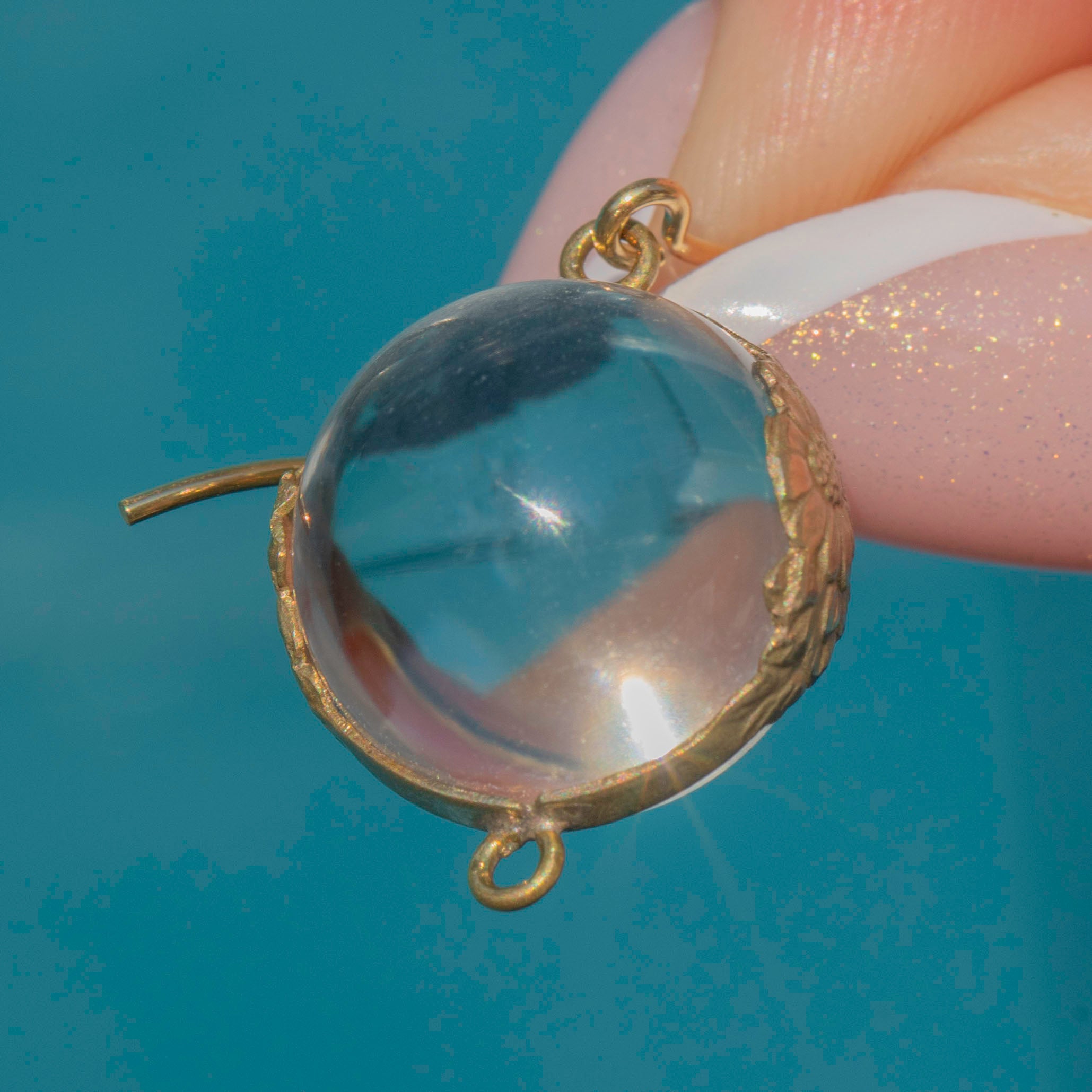 EXCELLENT/VERY GOOD: A superb pair of Antique 9ct Gold Pools of Light Rock Crystal Earrings, crafted for both elegance and versatility. Each Rock Crystal orb is beautifully smooth, free of chips or scuffs, and held firmly in its setting for lasting wear. Aside from some mild wear to the Silver floral settings, they are still wonderful which a gorgeous patina. What delight!