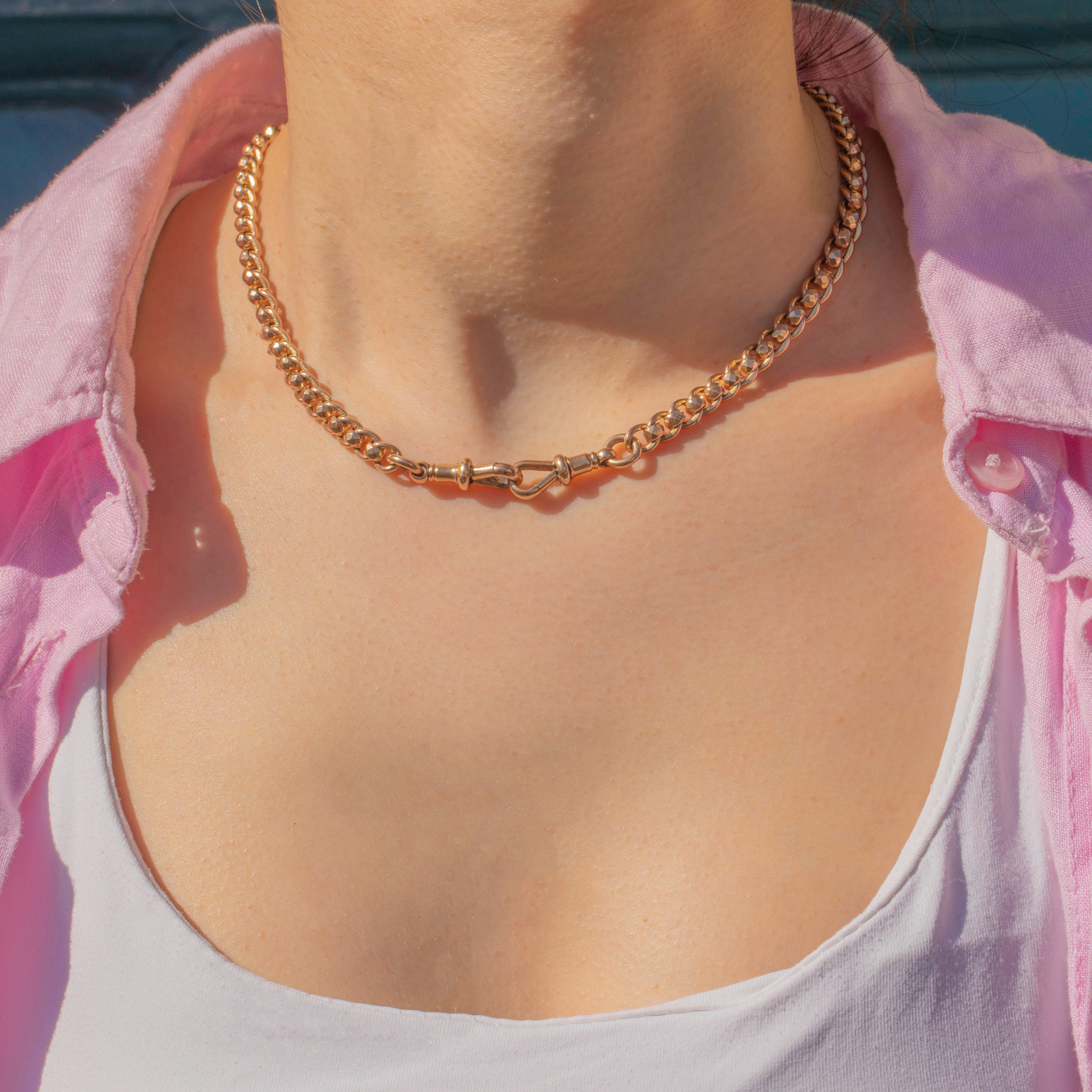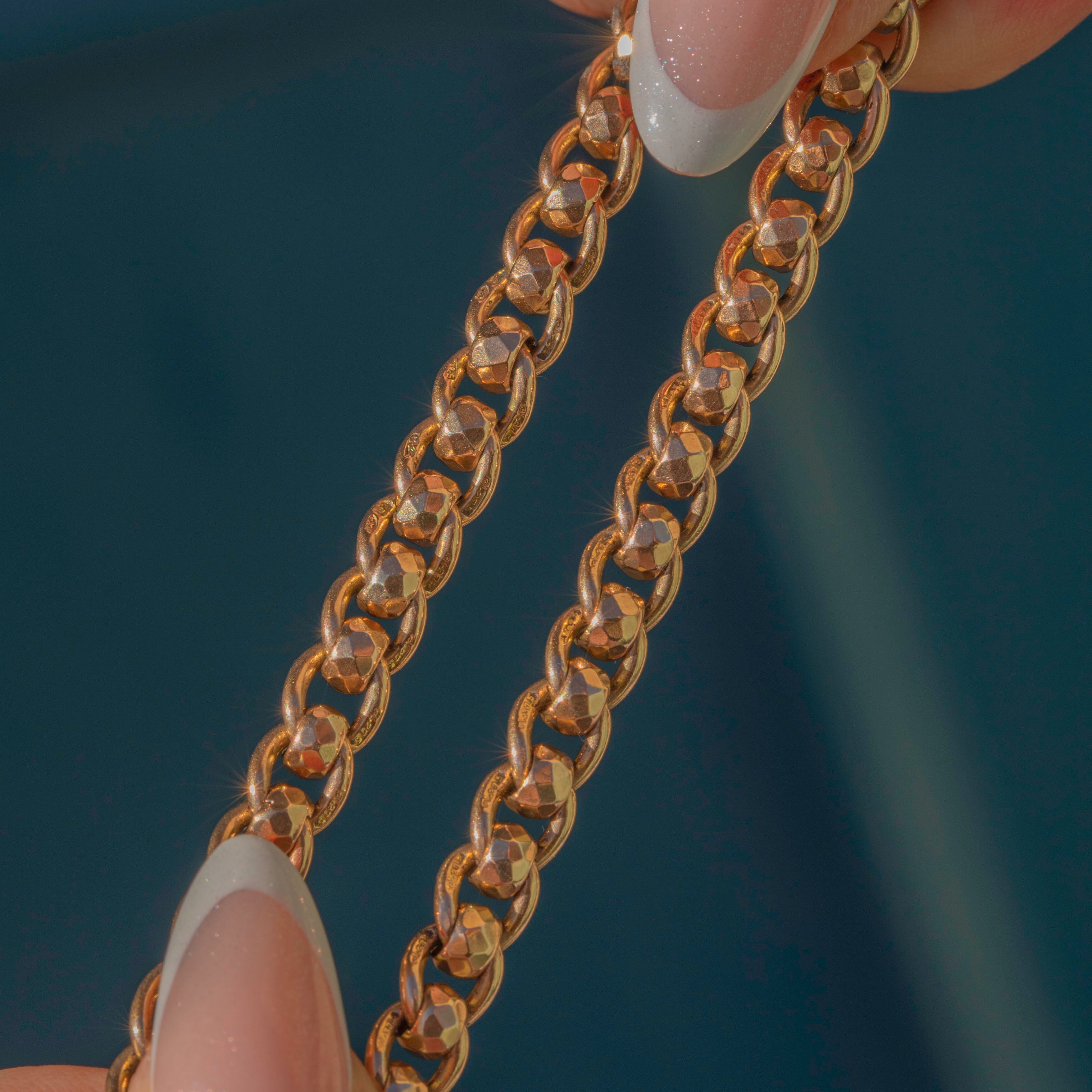 A gorgeous antique 9ct Gold rollerball Albert chain, complete with matching dog-clips. This wonderfully handcrafted Albert chain features faceted rollerball links, two matching dog-clips, a bolt-ring, and a removable travelling T-bar!