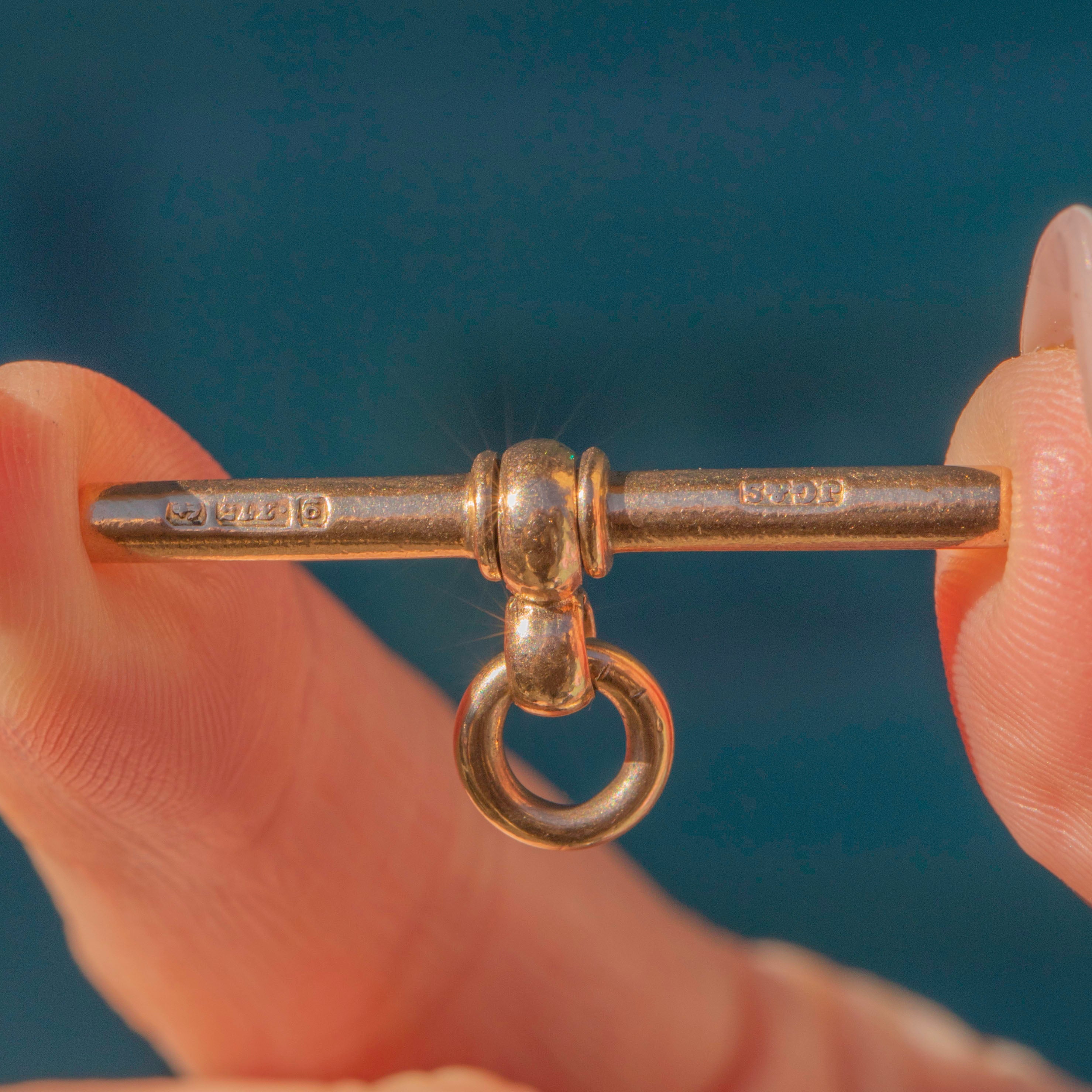 EXCELLENT. This antique 9ct Gold rollerball Albert chain is in excellent condition. The links are all secure, the rollerballs have great movement, and each link is stamped. The dog-clips are in perfect working order so you can wear it with absolute confindece. The bolt-ring opens with a gentle push and sometimes requires a gentle push to close securely. The T-bar can be removed, allowing you to pair it with one of your other pendants or charms!