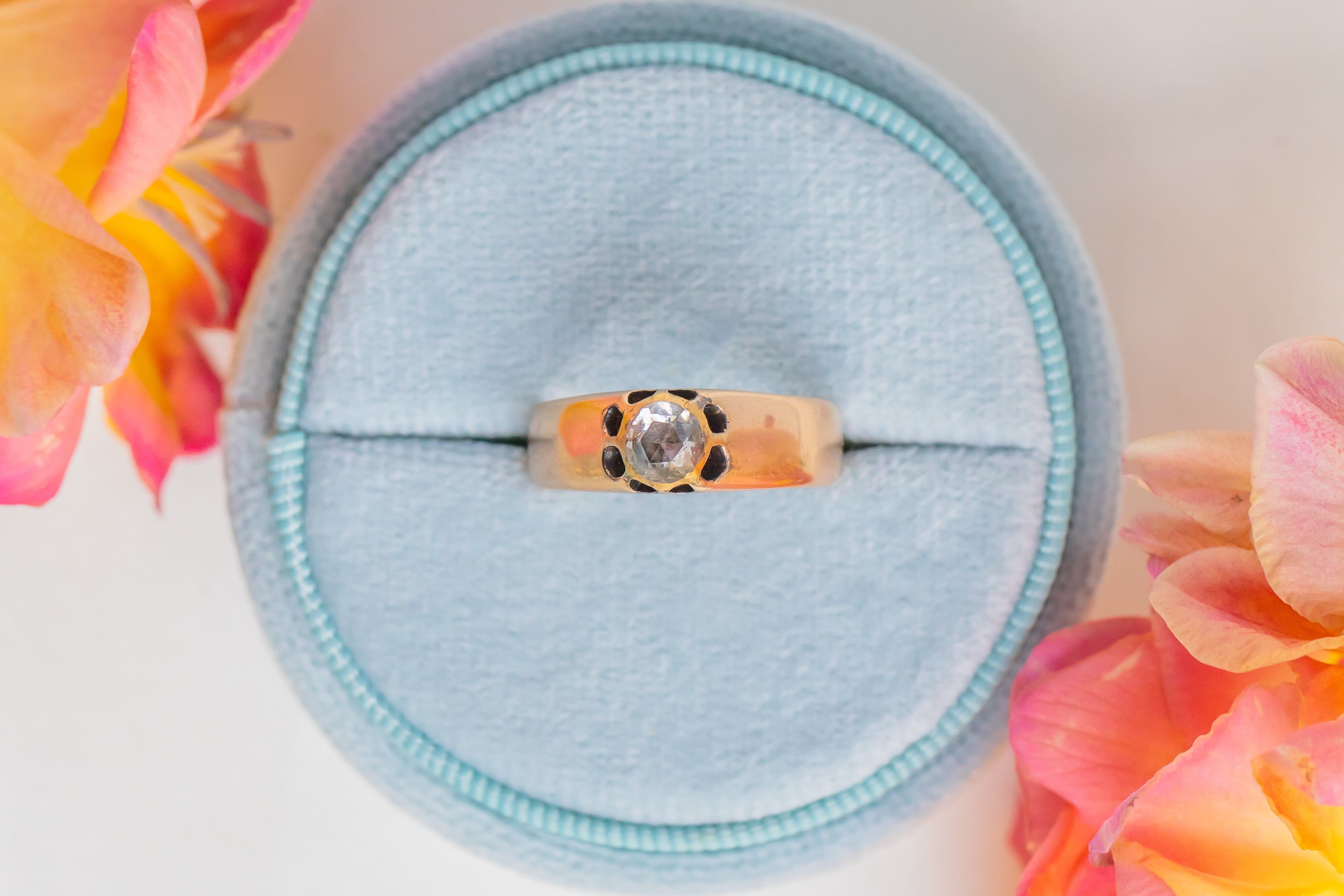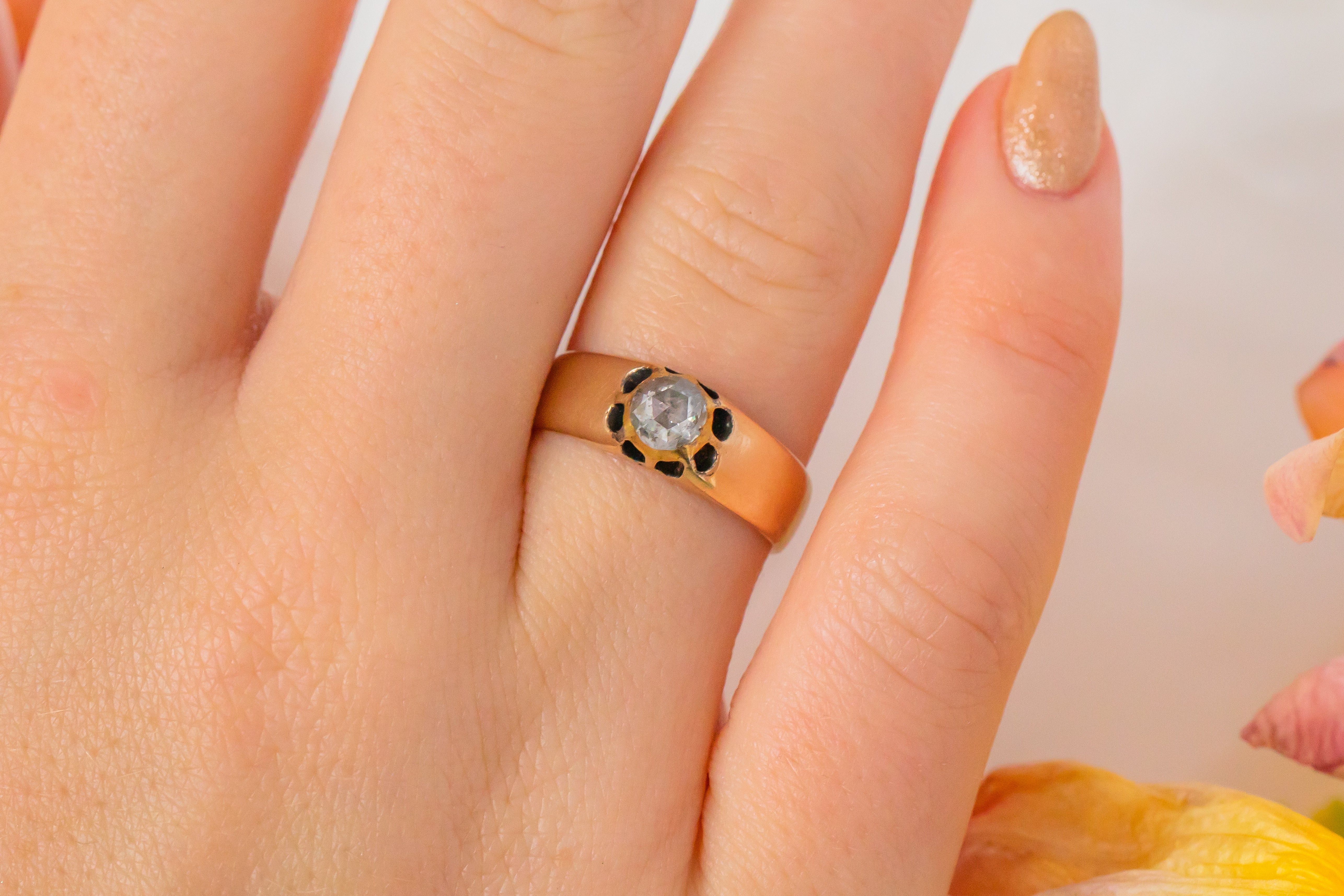 An exquisite antique 9ct Gold rose cut Diamond solitaire ring to add to your jewellery collection. Featuring a central scintillating 0.26ct rose cut Diamond in her centre, boasting a sensational salt and pepper appearance - she is a rare thing of beauty!