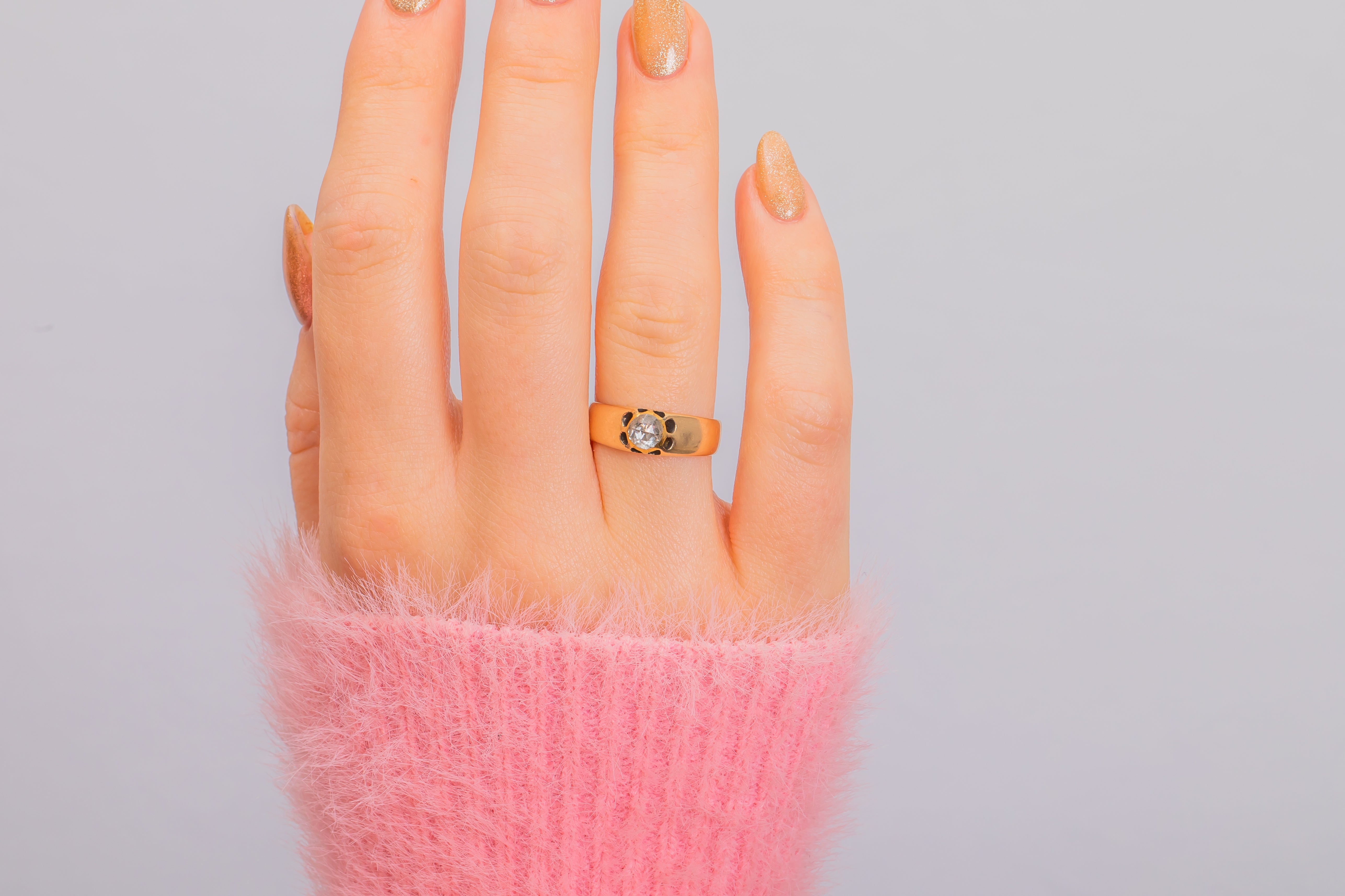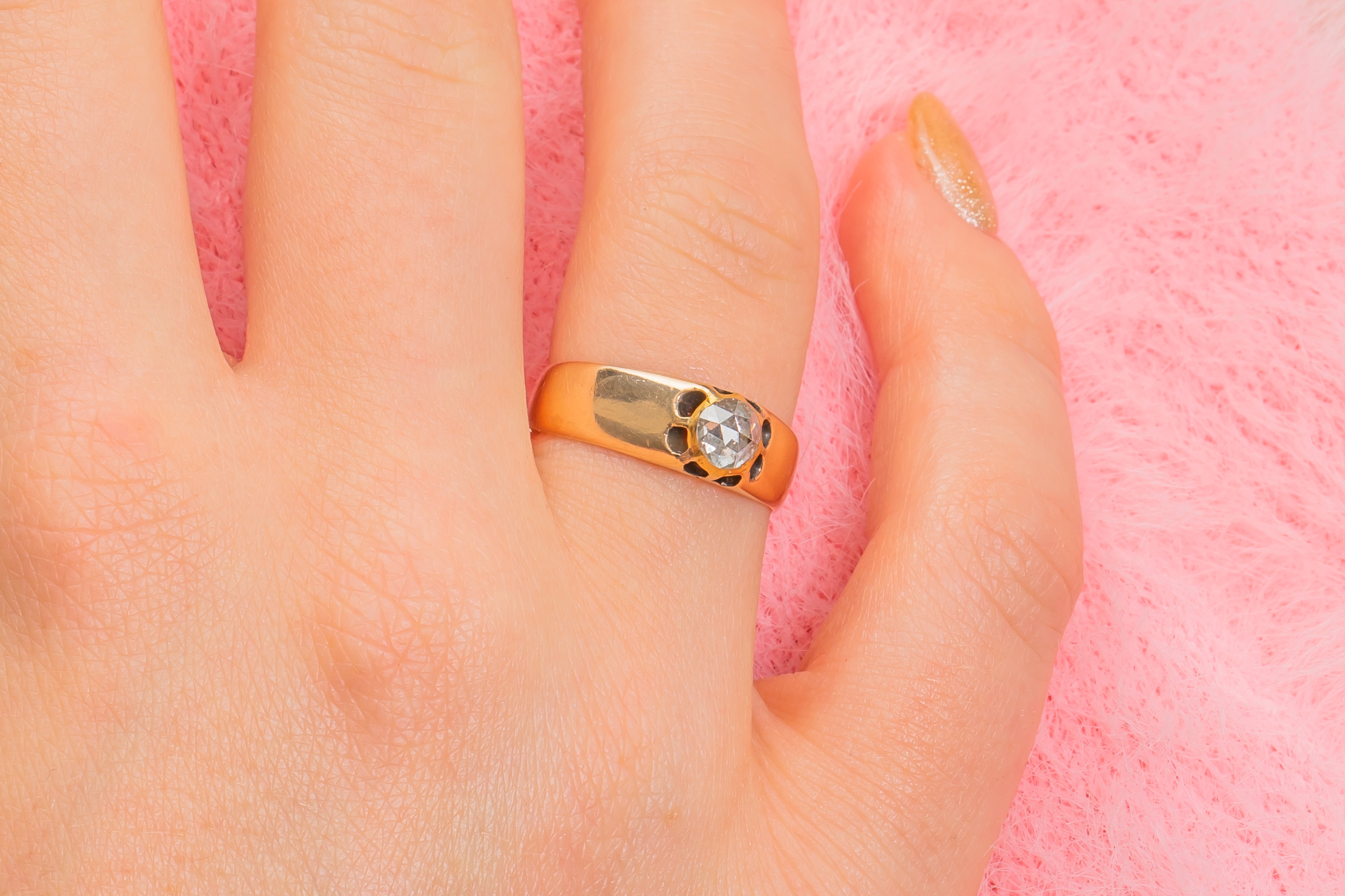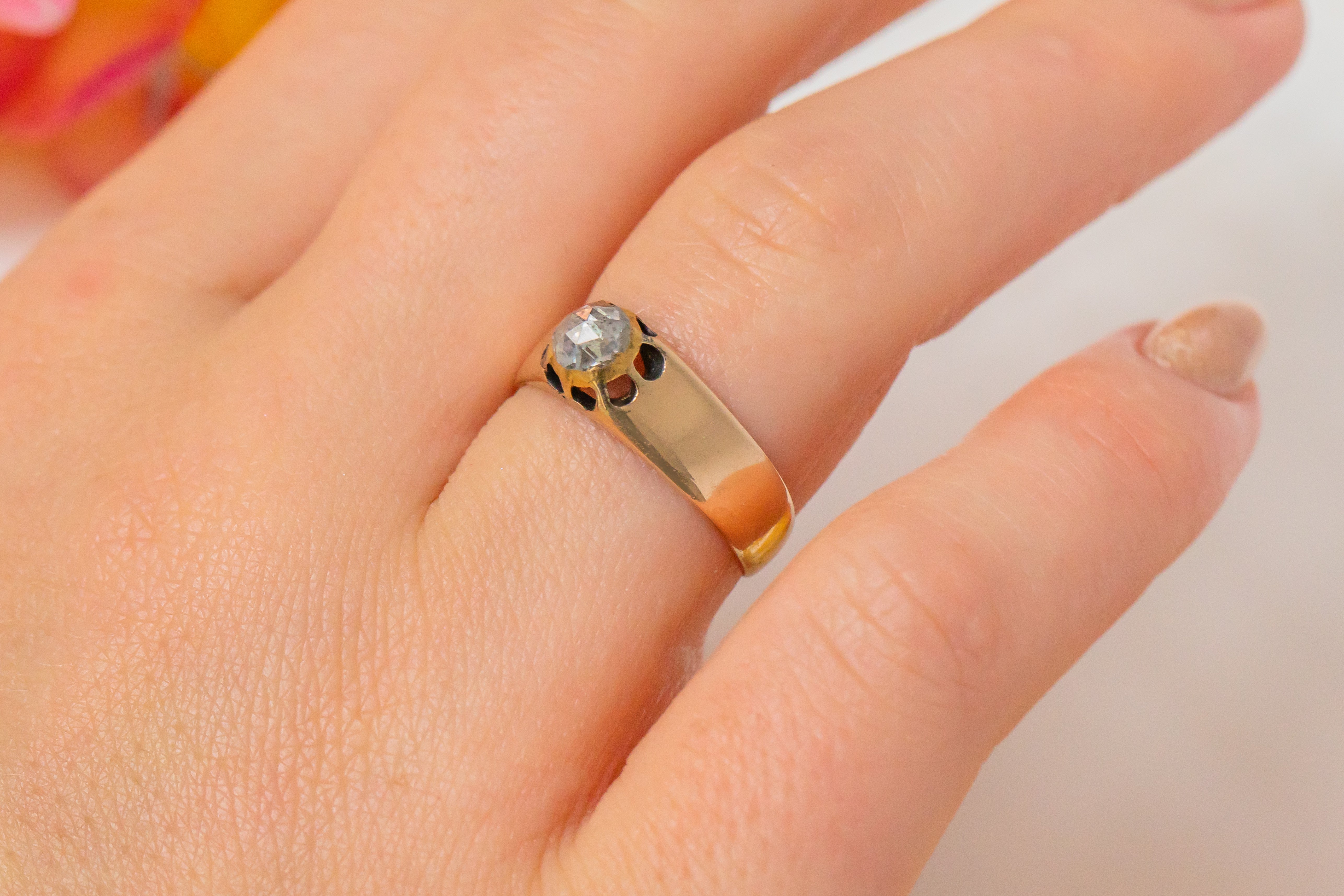 VERY GOOD. This antique 9ct Gold rose cut Diamond solitaire ring is in very good condition. The 9ct Gold shank is lovely and glossy, free from dings, dents and fleabites to note. The band is ever so slightly misshapen, wearing thinner at the back - but she is still a comfortable wear and a sturdy choice. The rare rose cut Diamond is securely set into buttery 18ct Gold settings, and has a wonderfully warm glow, her angular form lasting very well over the years. Whilst there is some light wear around the settings, this is largely underneath the gemstone and so is not noticeable when worn. Overall, a gorgeous solitaire ring with bundles of antique allure!