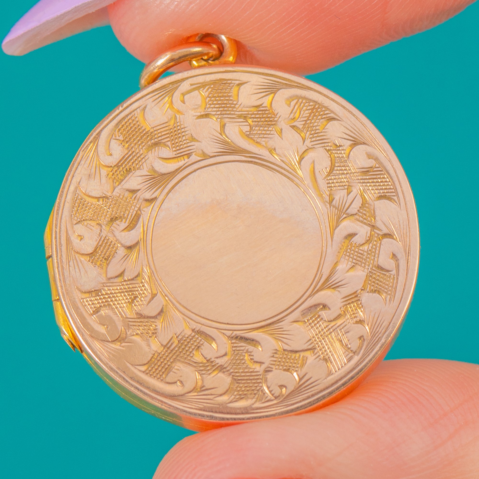 This classic round locket is richly decorated with engine-turned panels and ornate foliate engravings. A smooth central cartouche sits poised for a personal monogram, giving this piece its timeless, sentimental charm.