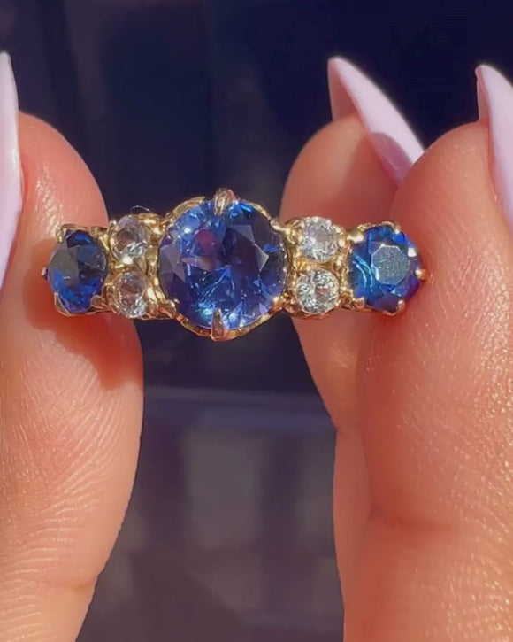 Where to start with this antique 9ct Gold Sapphire three stone ring! With a combined carat weight of 1.35ct, her three Sapphires flaunt cobalt hues with an electric blue sparkle dancing between the facets. Nestled between the Sapphires are four scintillating white Spinel, akin to bright stars in the midnight sky.