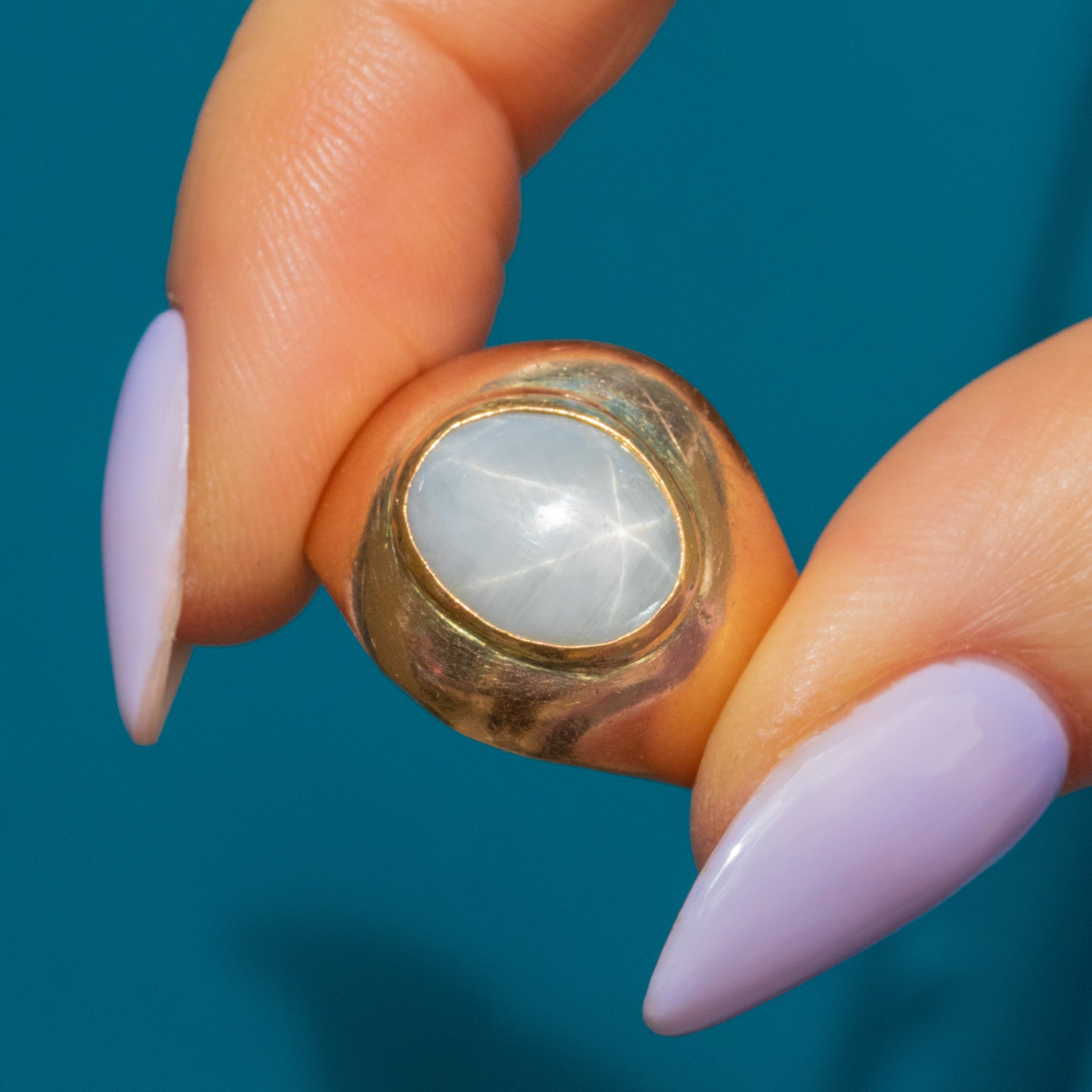 What a spectacular piece this chunky antique 9ct Gold star Sapphire signet ring is! With a 3.75ct galactic cabochon star Sapphire, the impressive ring face possesses a pool of pastel tones and a strong star running across her surface beneath the light!