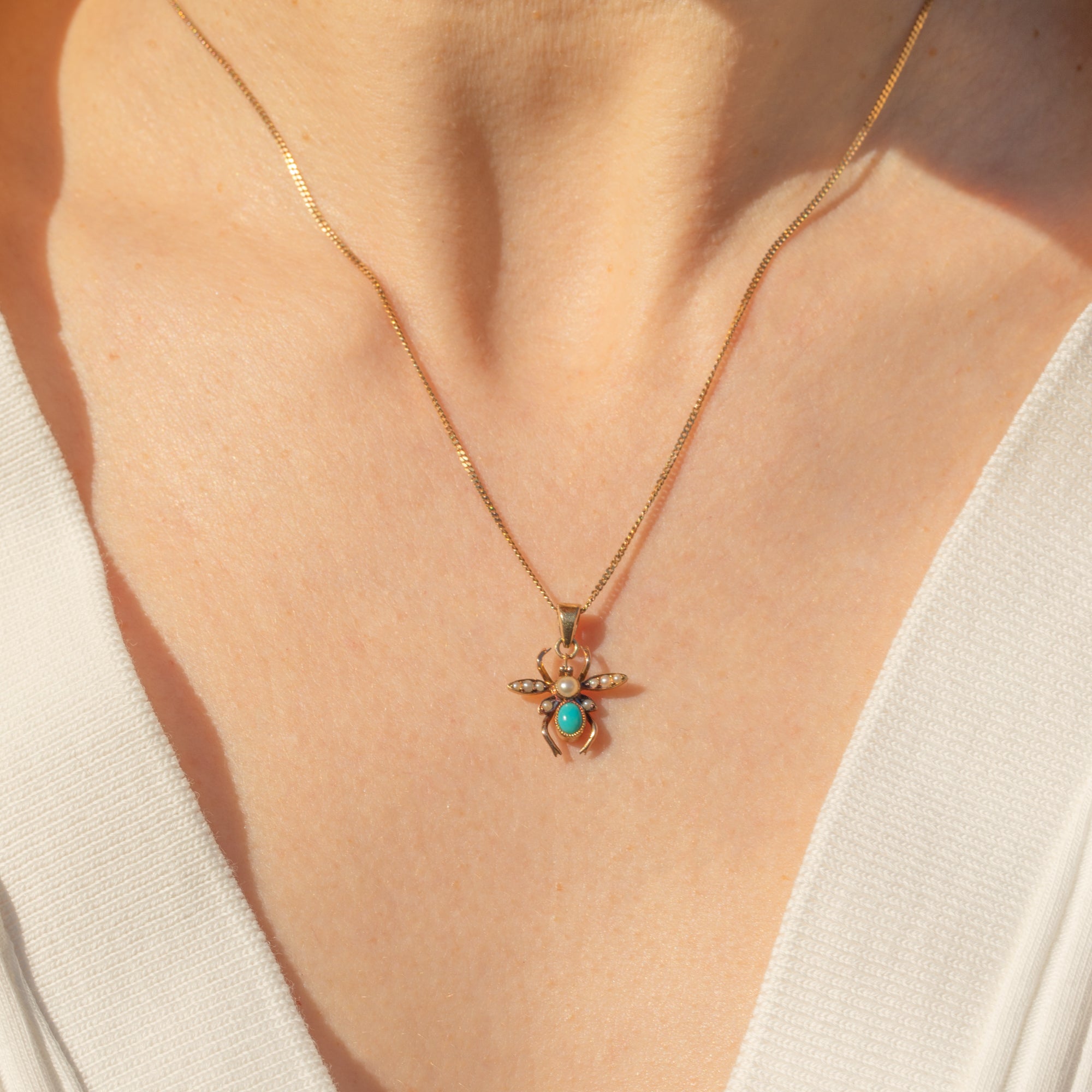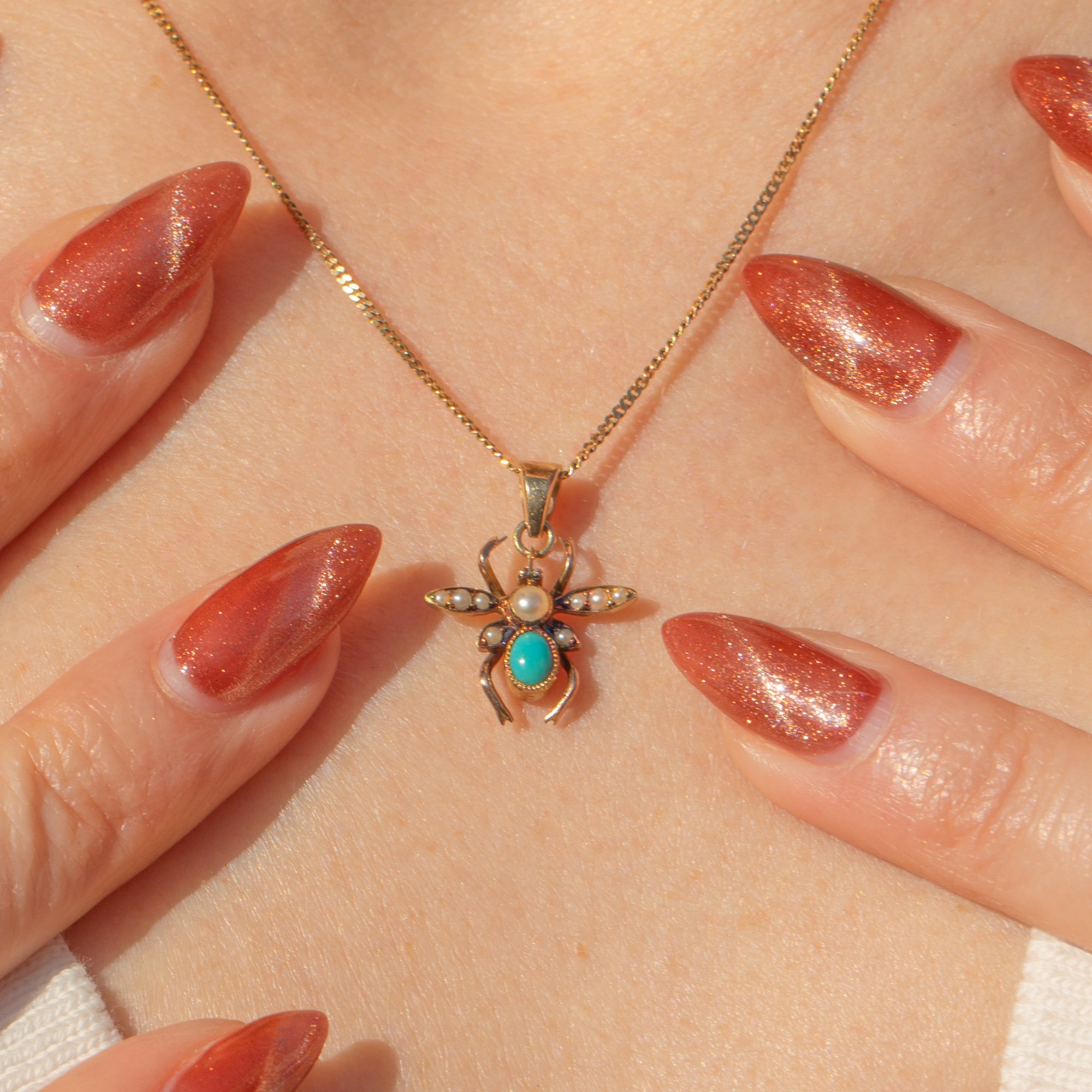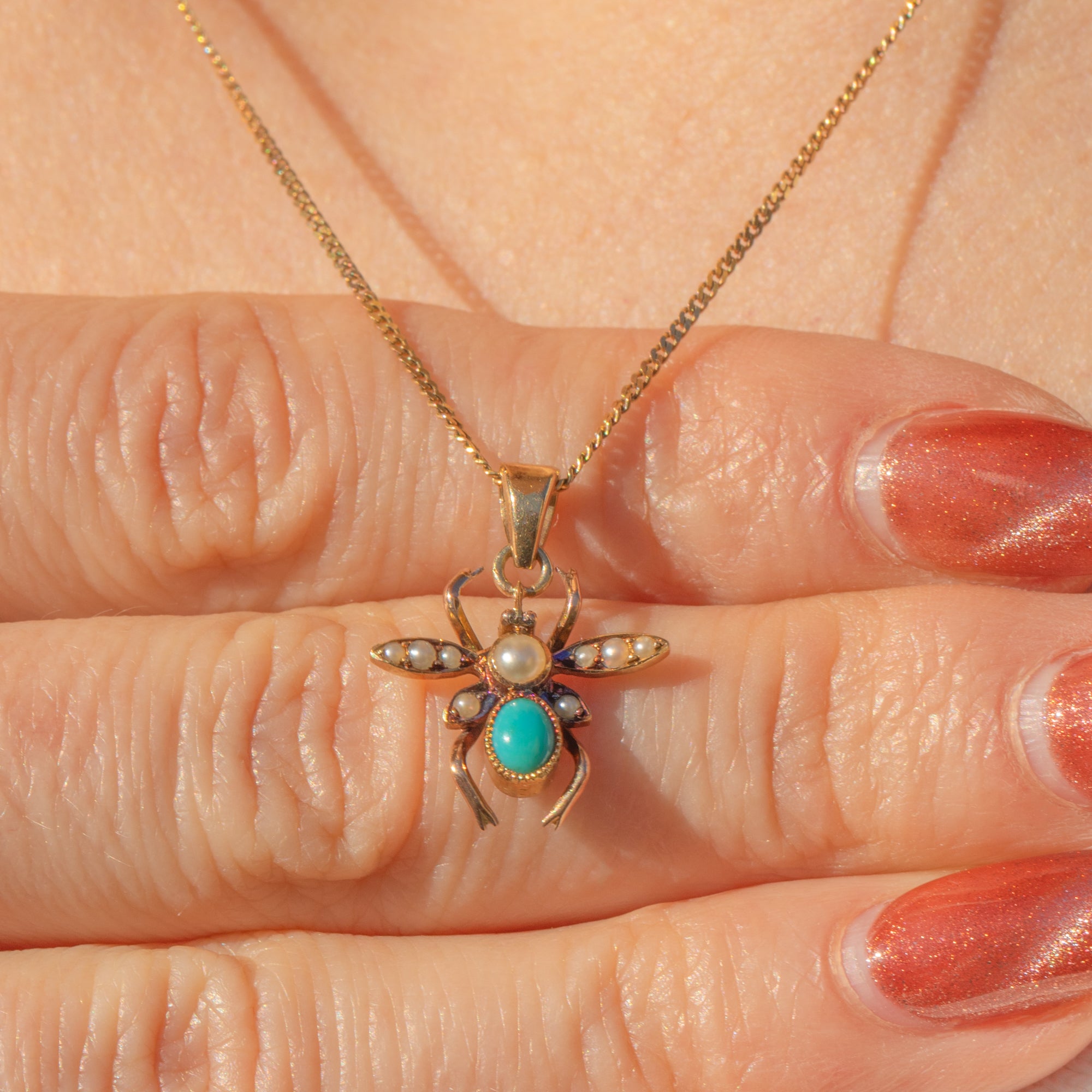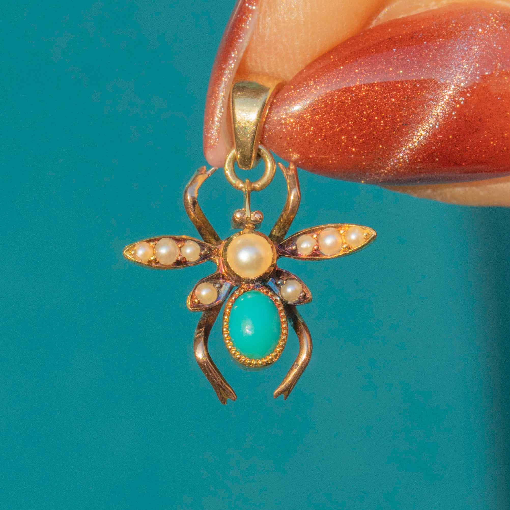 This antique 9ct Gold Turquoise Pearl fly charm is such a cool and unique piece! Crafted from 9ct Gold throughout, this fly pendant is steeped in Victorian symbolism, believed to connect the wearer to the spiritual world and ward off evil.