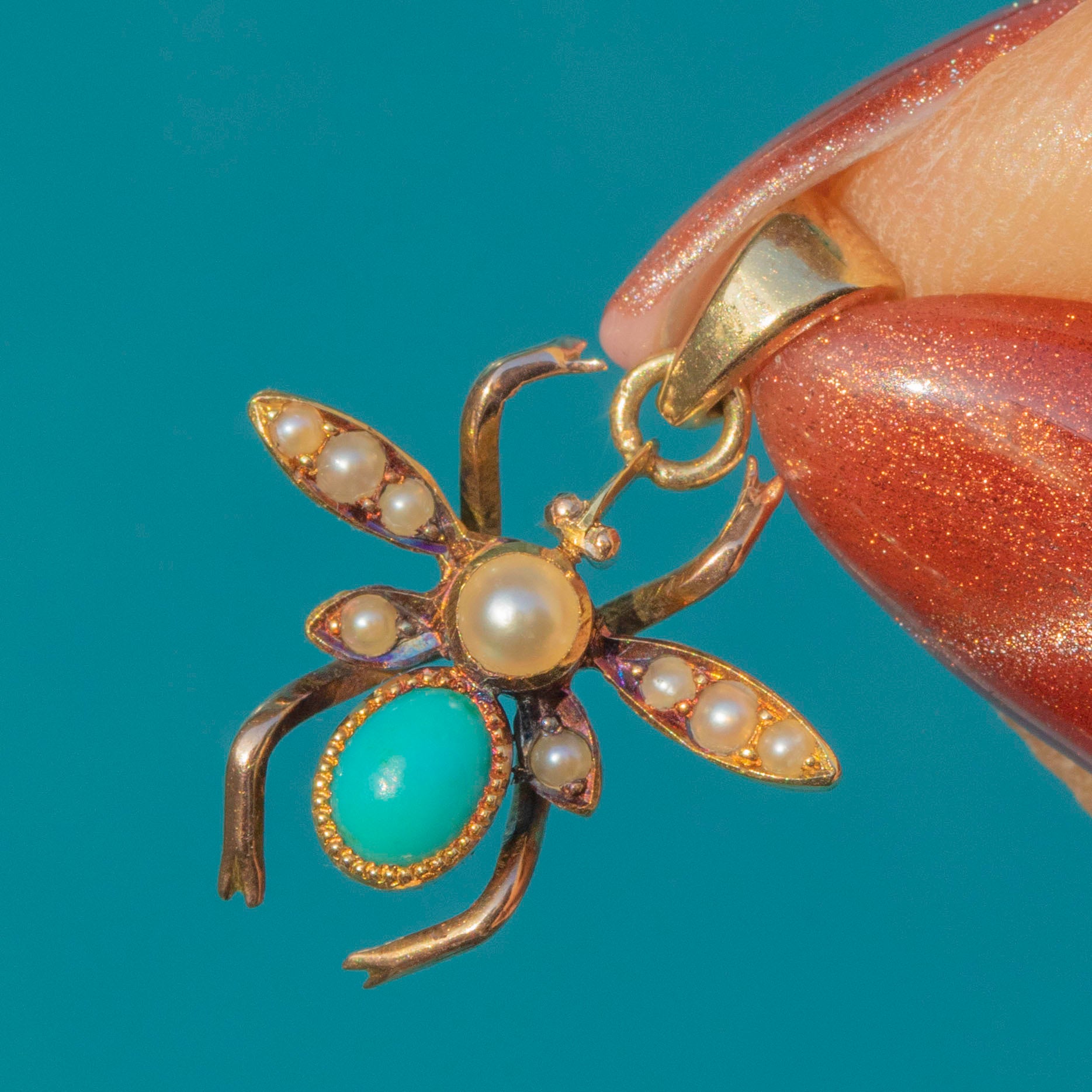 EXCELLENT: This antique 9ct Gold Turquoise Pearl fly charm is in fabulous condition throughout. The gemstones are securely set with a wonderful sheen and are completely free from chips or scuffs. The Gold is luminous, and the body of the body of the fly has remained robust.