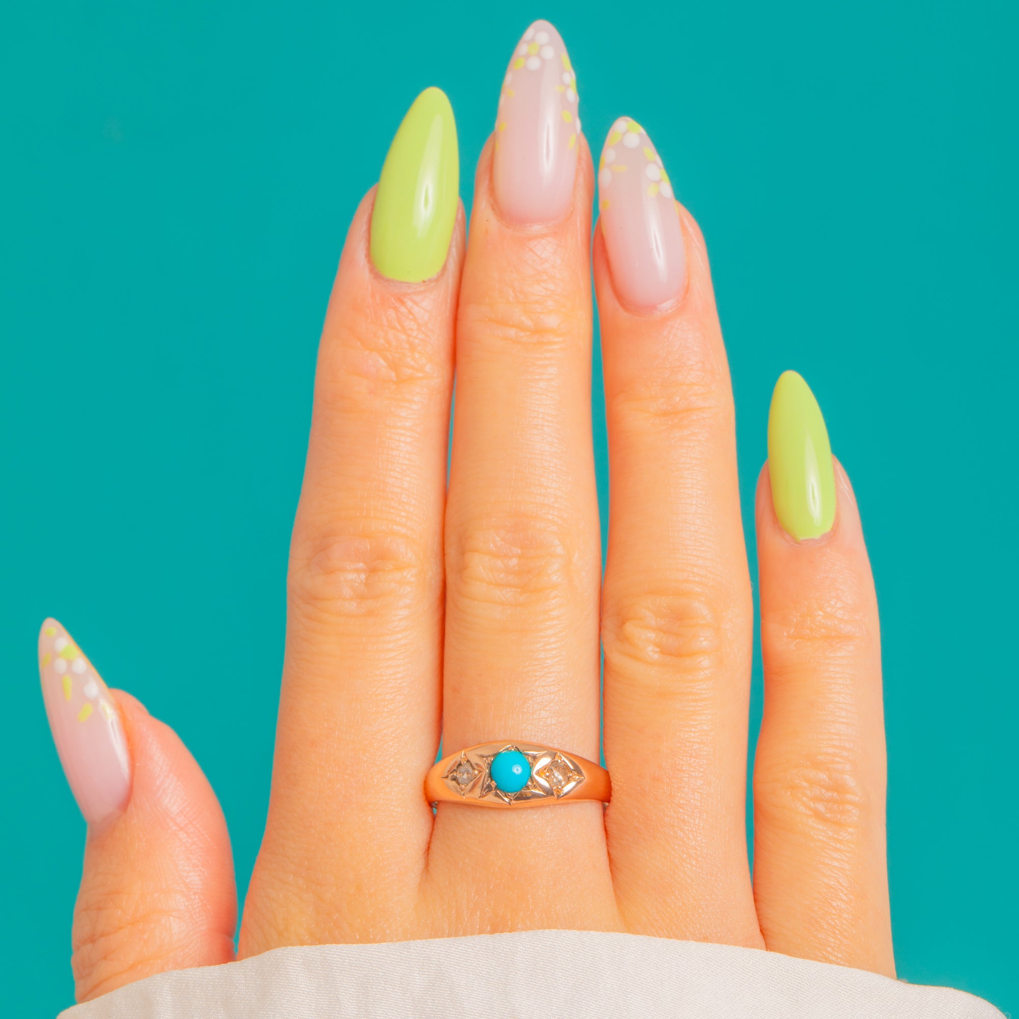 VERY GOOD: The Turquoise cabochon presents with bright colour and a smooth dome; the Diamonds are lively with no obvious chips seen. The Gold shows light surface scratches and gentle wear consistent with age, and there is a neat, visible resize to the shank. Settings are secure with minor natural patina, including slight darkening at the base of the Turquoise setting, all commensurate with age and careful wear.
