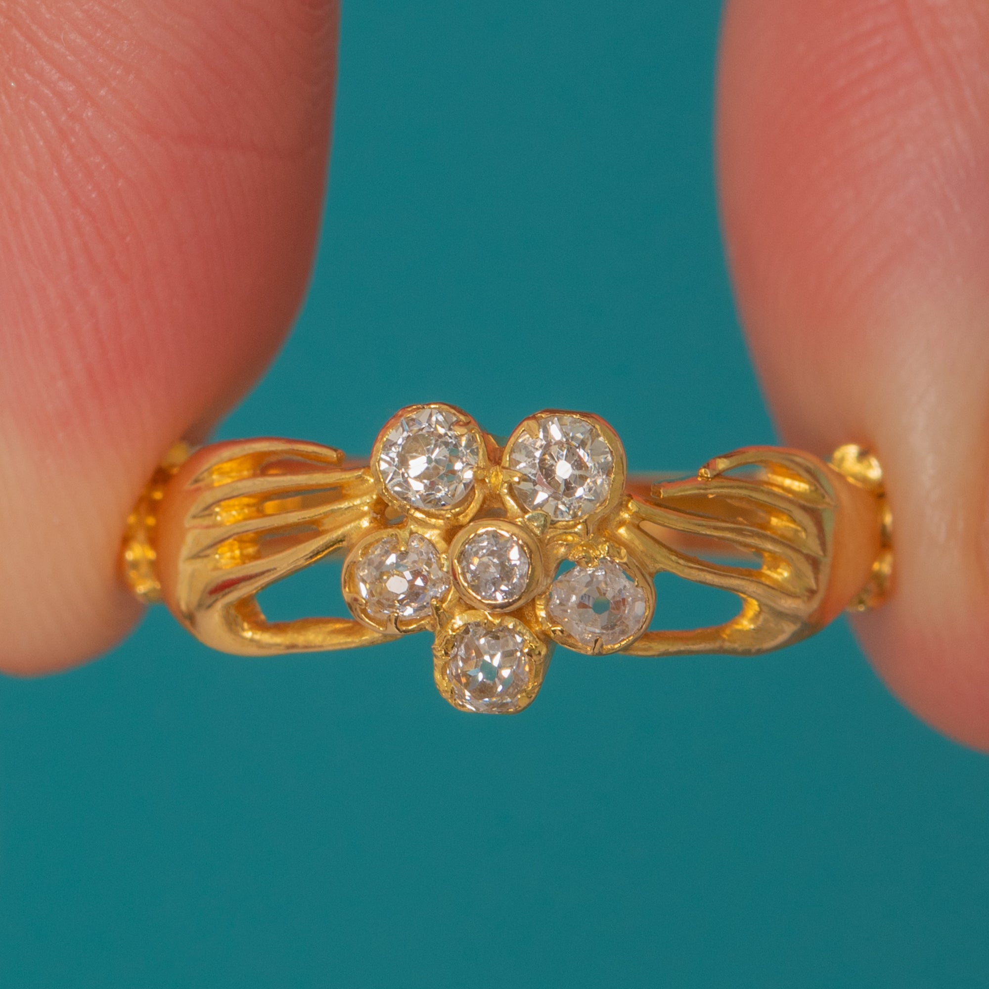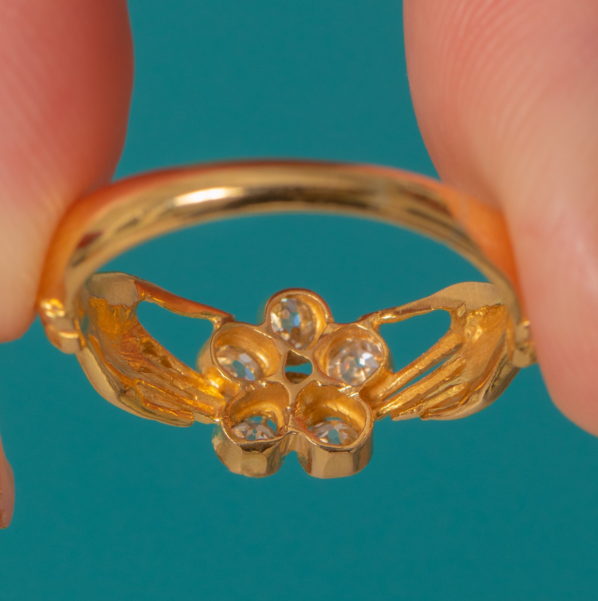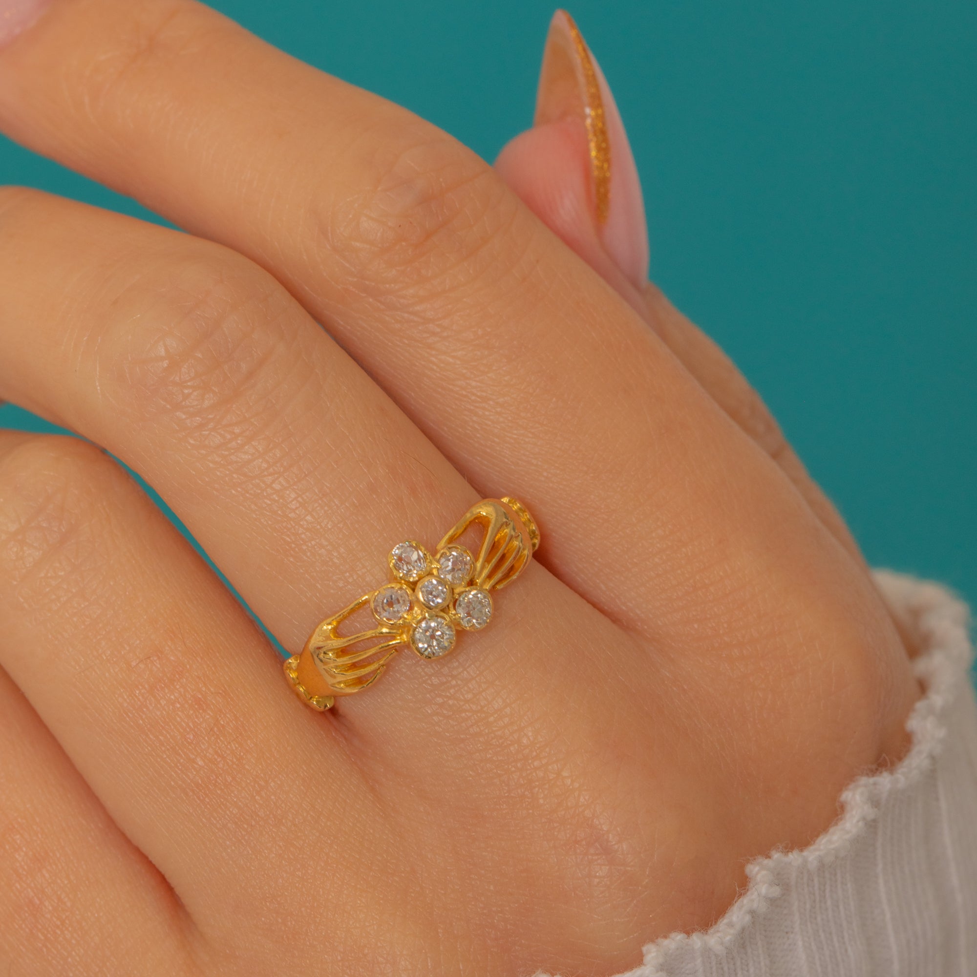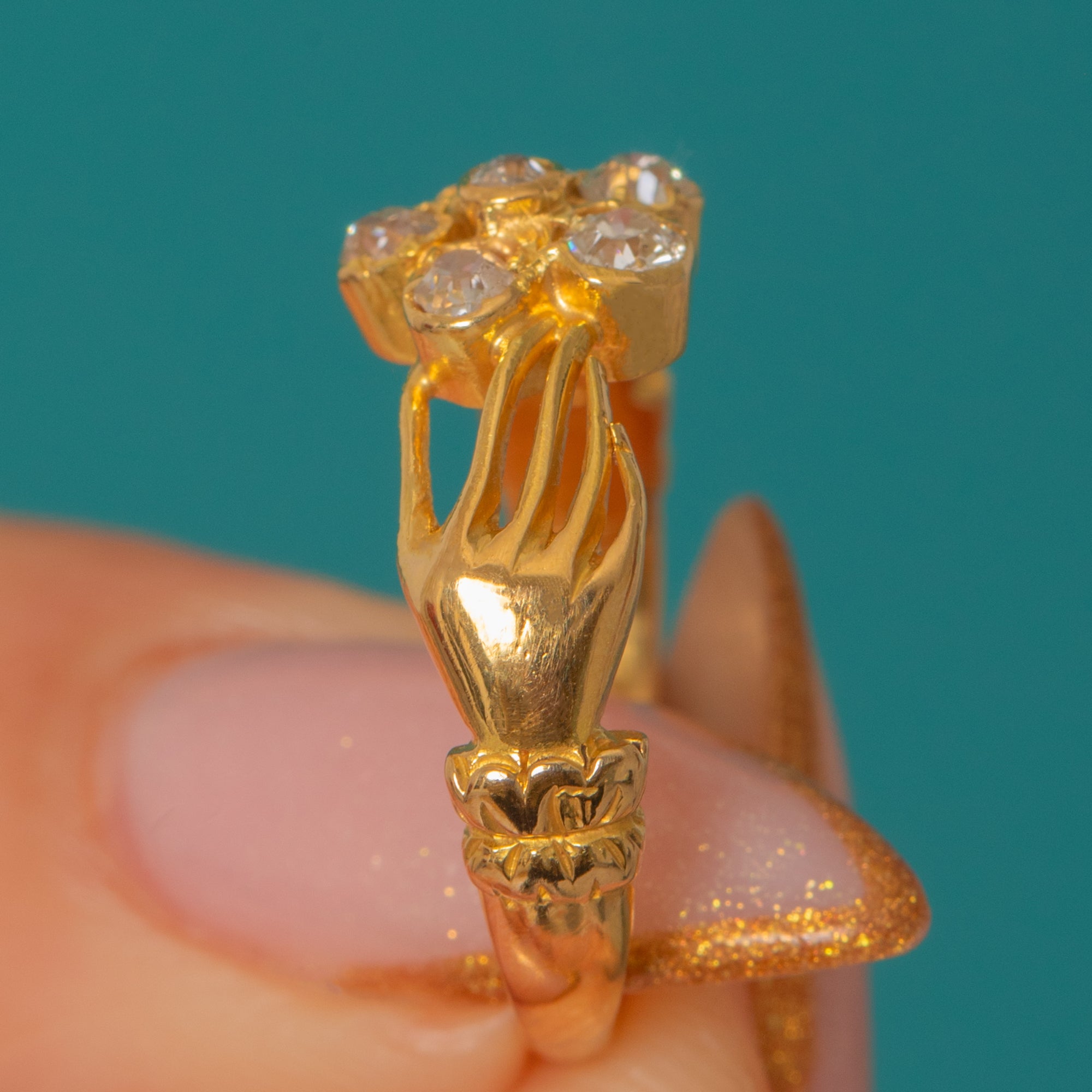 Crafted in rich 18ct Gold, the hands meet around a sparkling cluster of six antique Old Mine Cut Diamonds, forming a delicate flower at the centre.