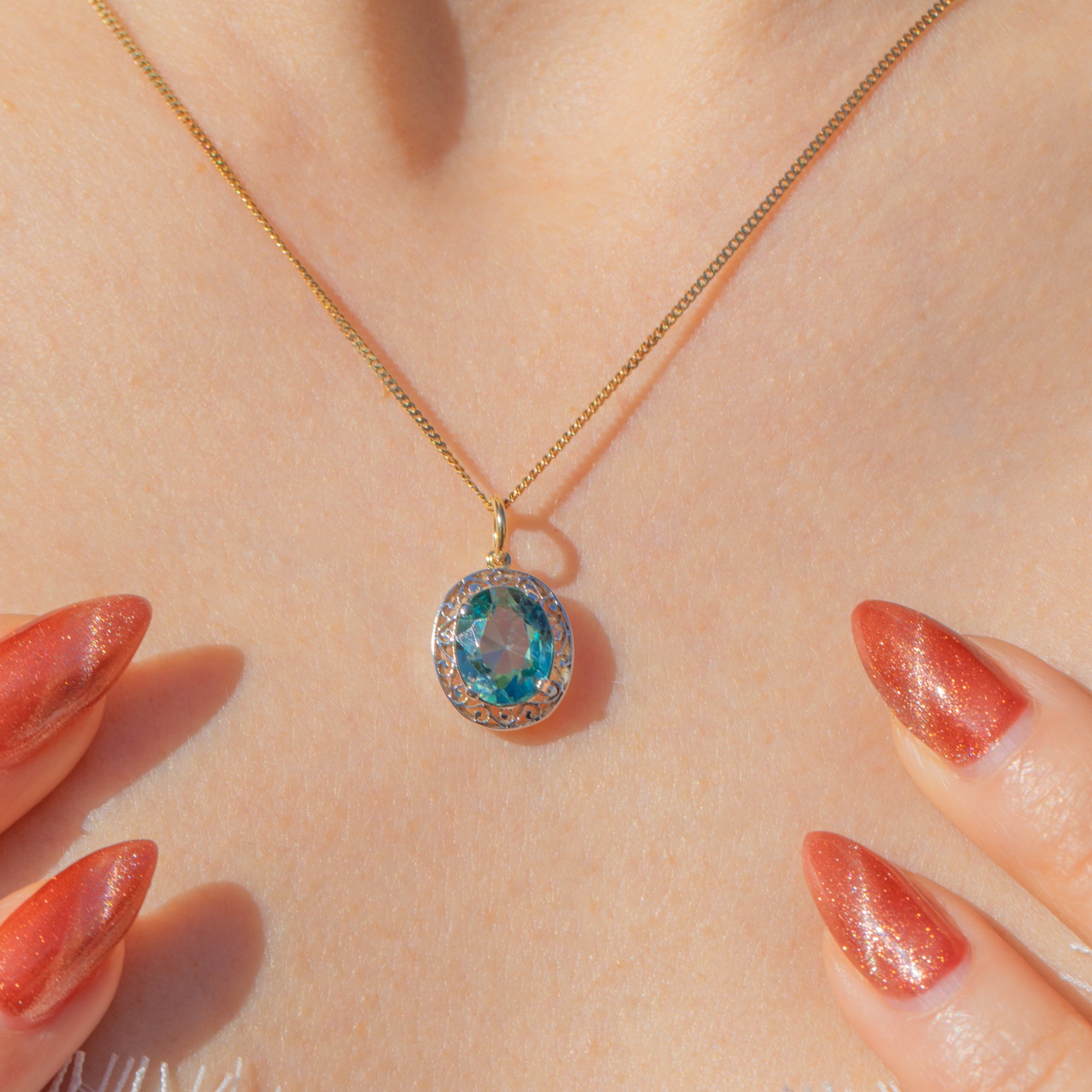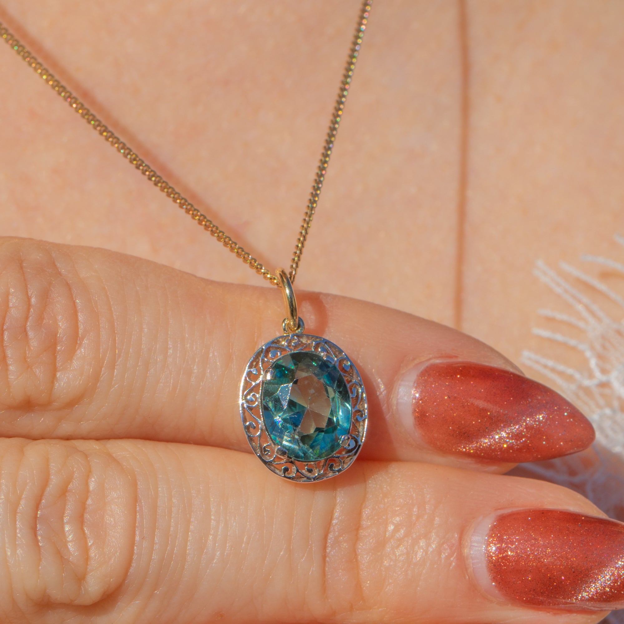 In her centre sits a 2.60ct blue Zircon, faceted wonderfully and radiating cool azure hues as she catches the light. She is steeped in antique charm, with an ornate Silver setting, providing a lovely depth and texture to this pendant.