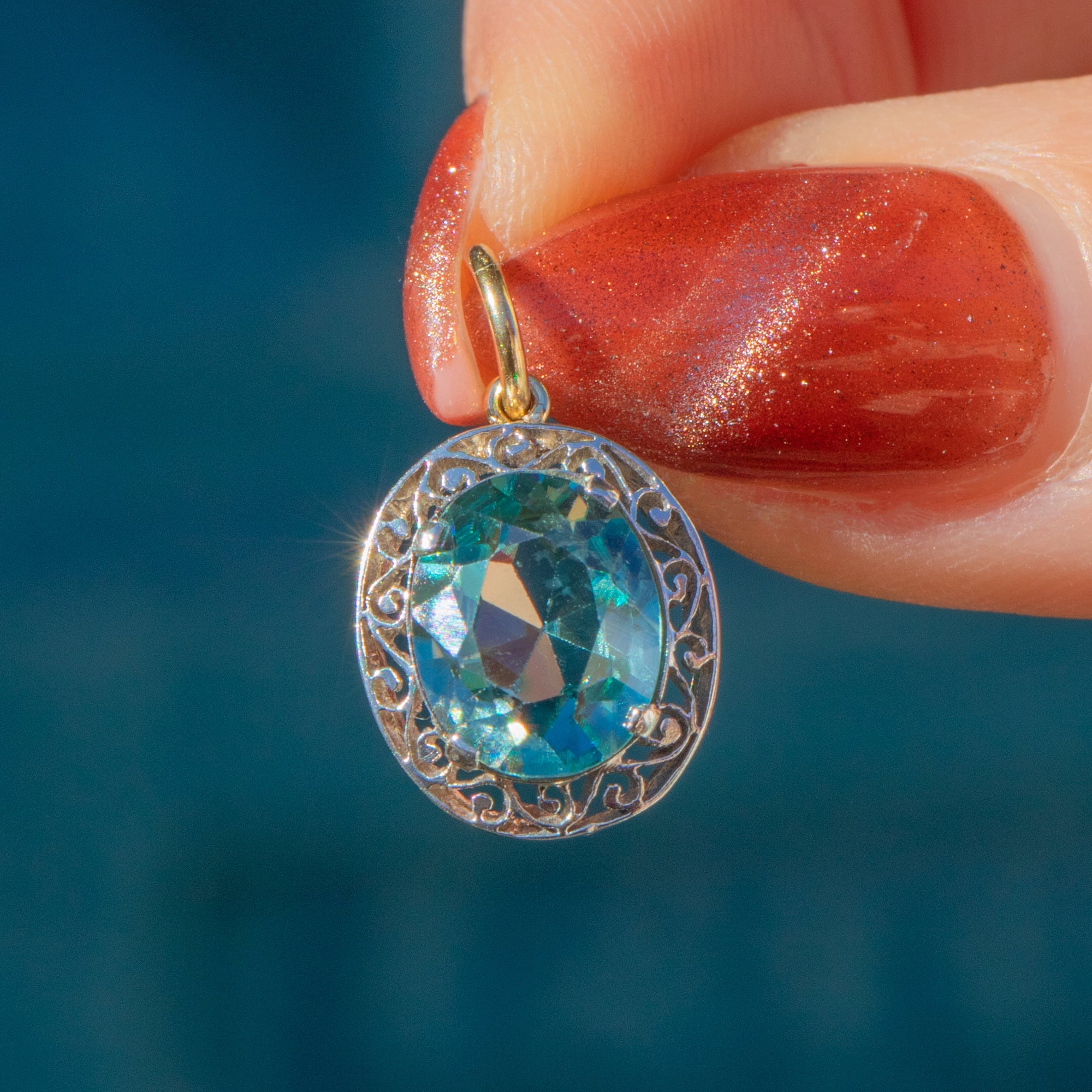 Add a pop of colour to your attire with this antique Blue Zircon filigree charm!