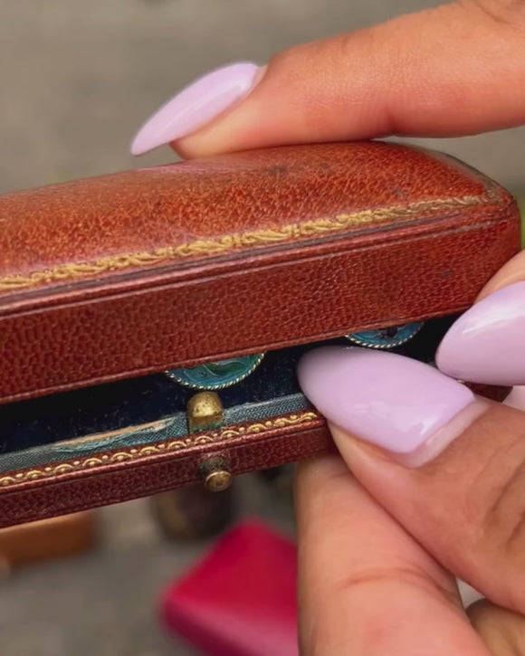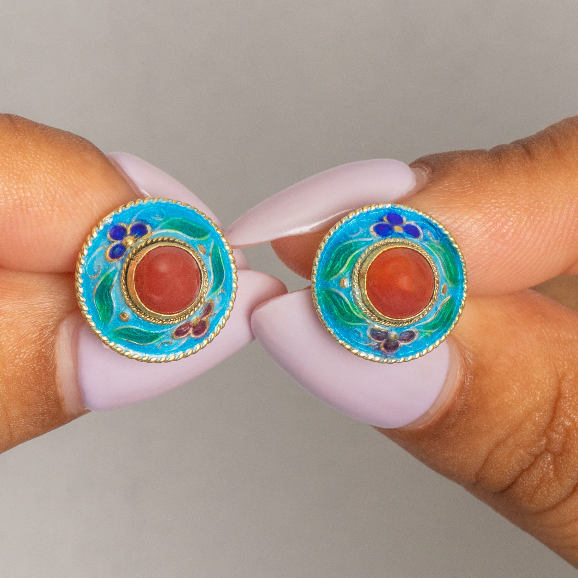 VERY GOOD-EXCELLENT. These antique Carnelian Enamel stud earrings are in wonderful condition. The whimsical Enamel details are in mint condition with a bold hue throughout. The Carnelians are smooth to the touch with no damage to note. There is a slight movement in one of the Carnelians, but rest assured she is secure and won't fall out. The Gold gilding is crisp with only slight difference in colour where the ear posts were soldered to the back. With bundles of charm, we will be sad to see them go!