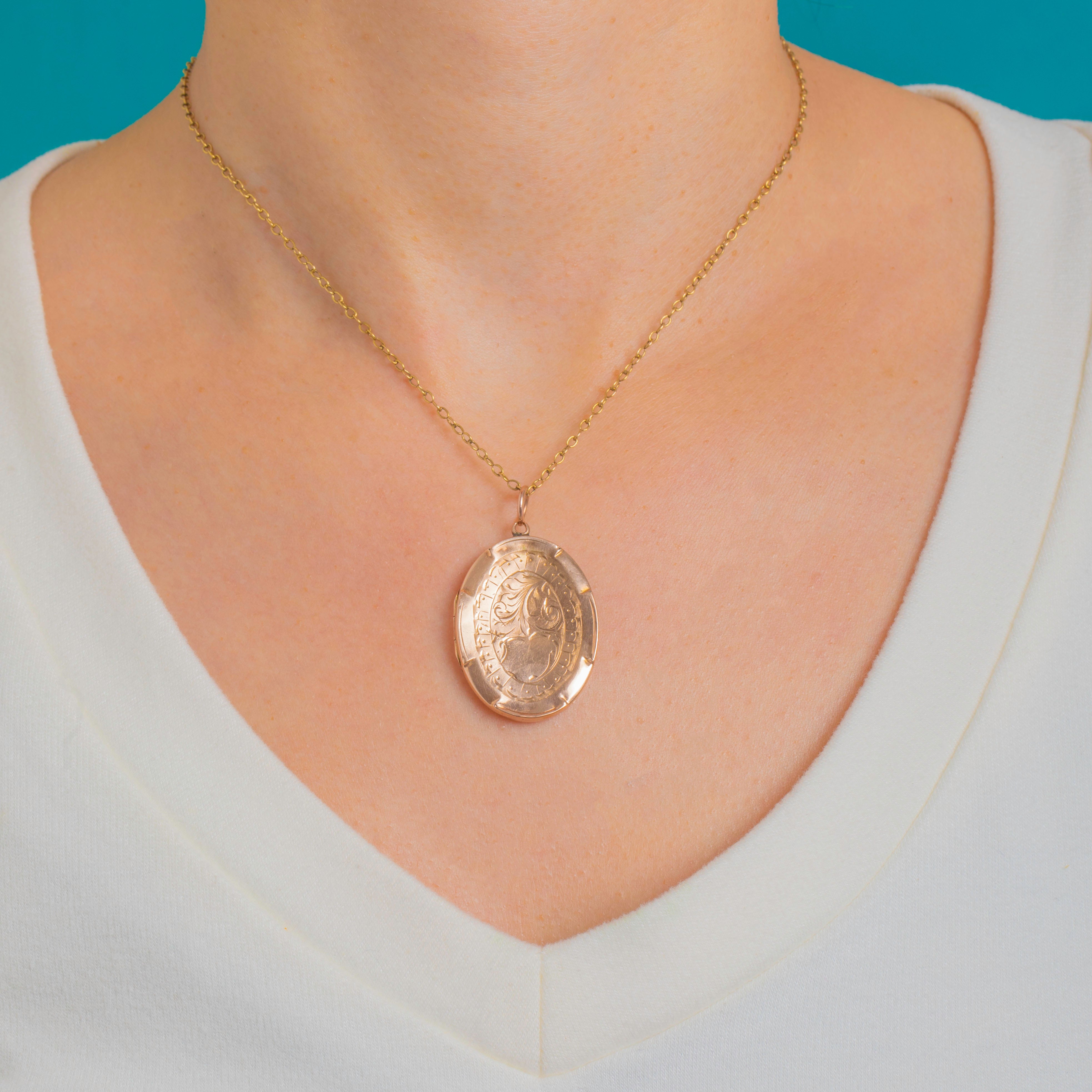 VERY GOOD: The engraved details remain crisp with a lovely rosy Gold patina. The hinge is sound and the locket clicks shut securely; one interior frame remains in place. Light surface scratches and small rim dings commensurate with age, with minor verdigris near the hinge and discreet interior impressions, none affecting wear.