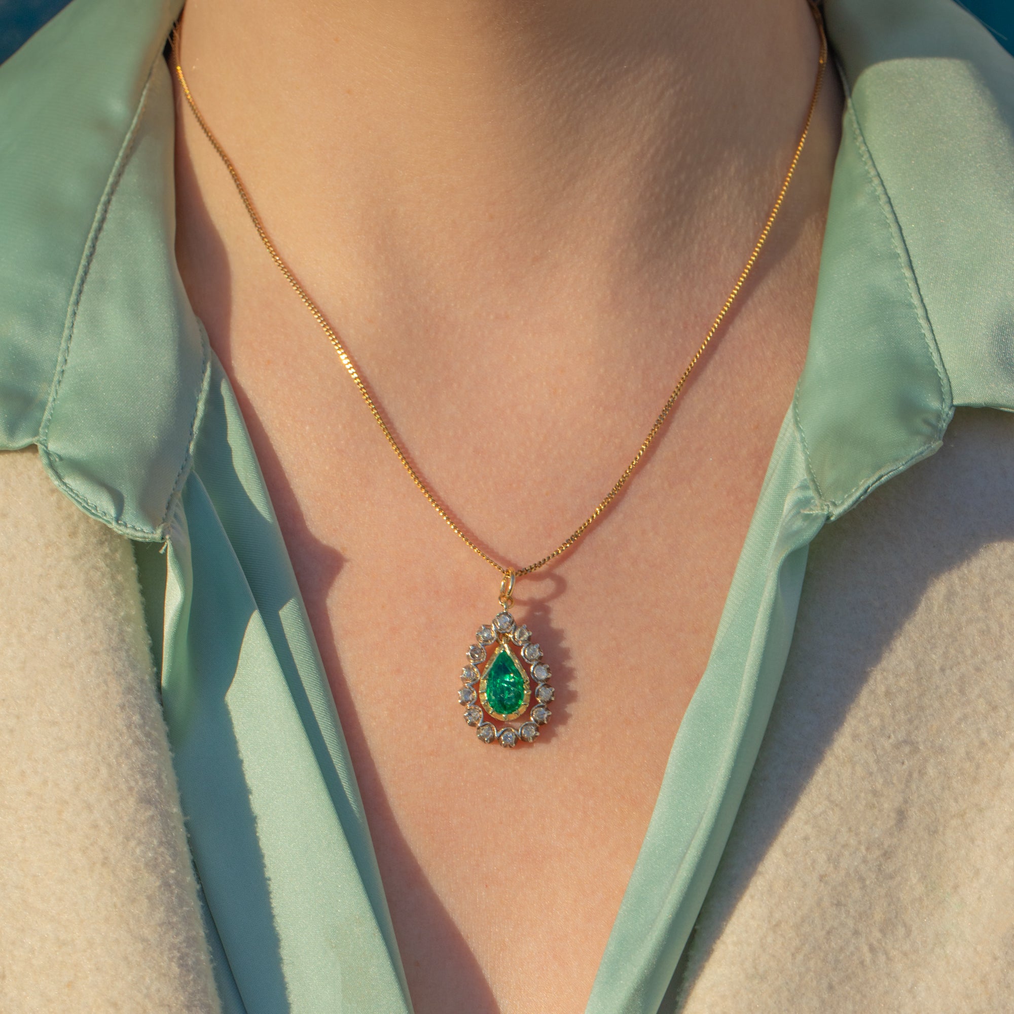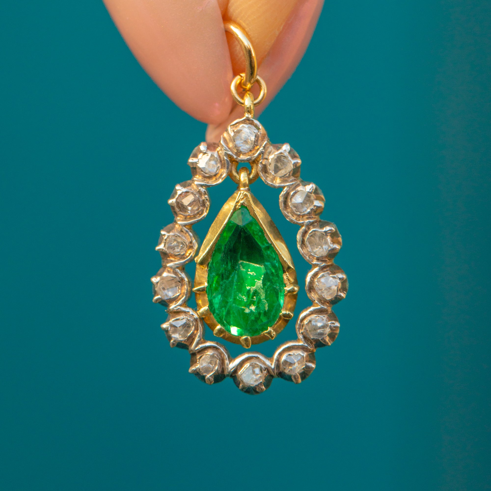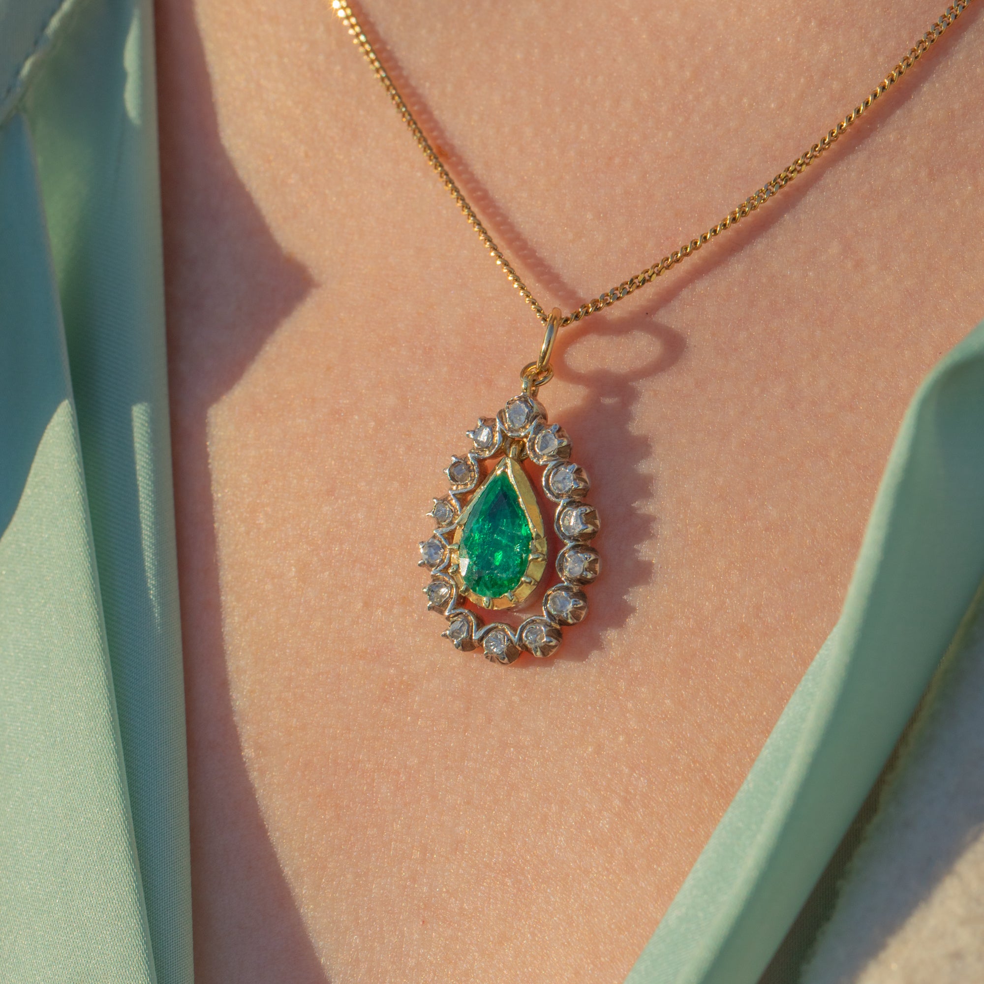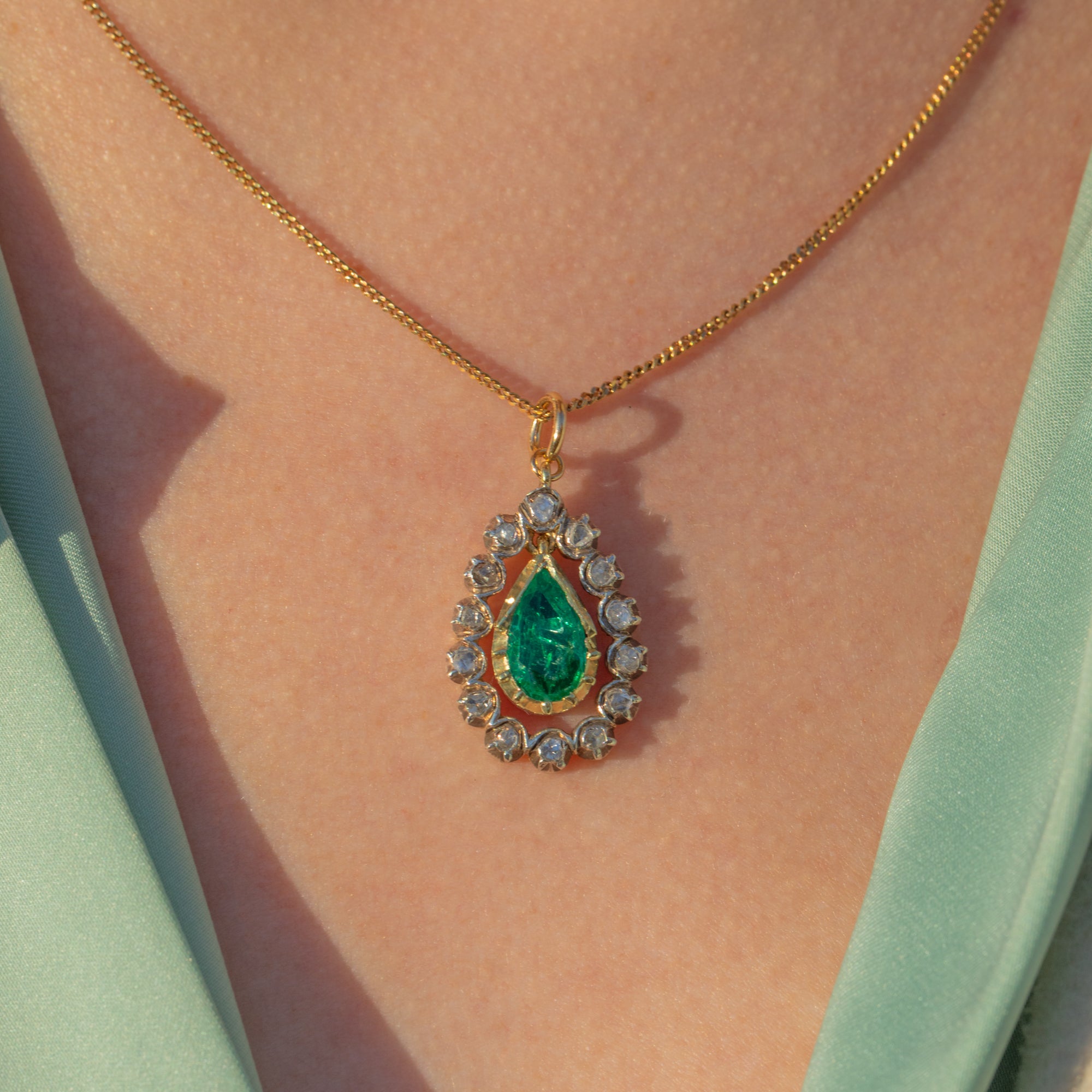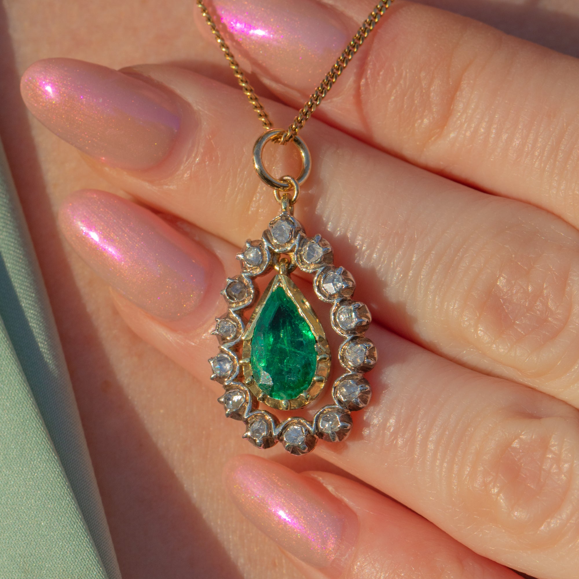 Antique Emerald Diamond Pear Drop Pendant, 1.00ct Emerald, Silver & 18ct Gold