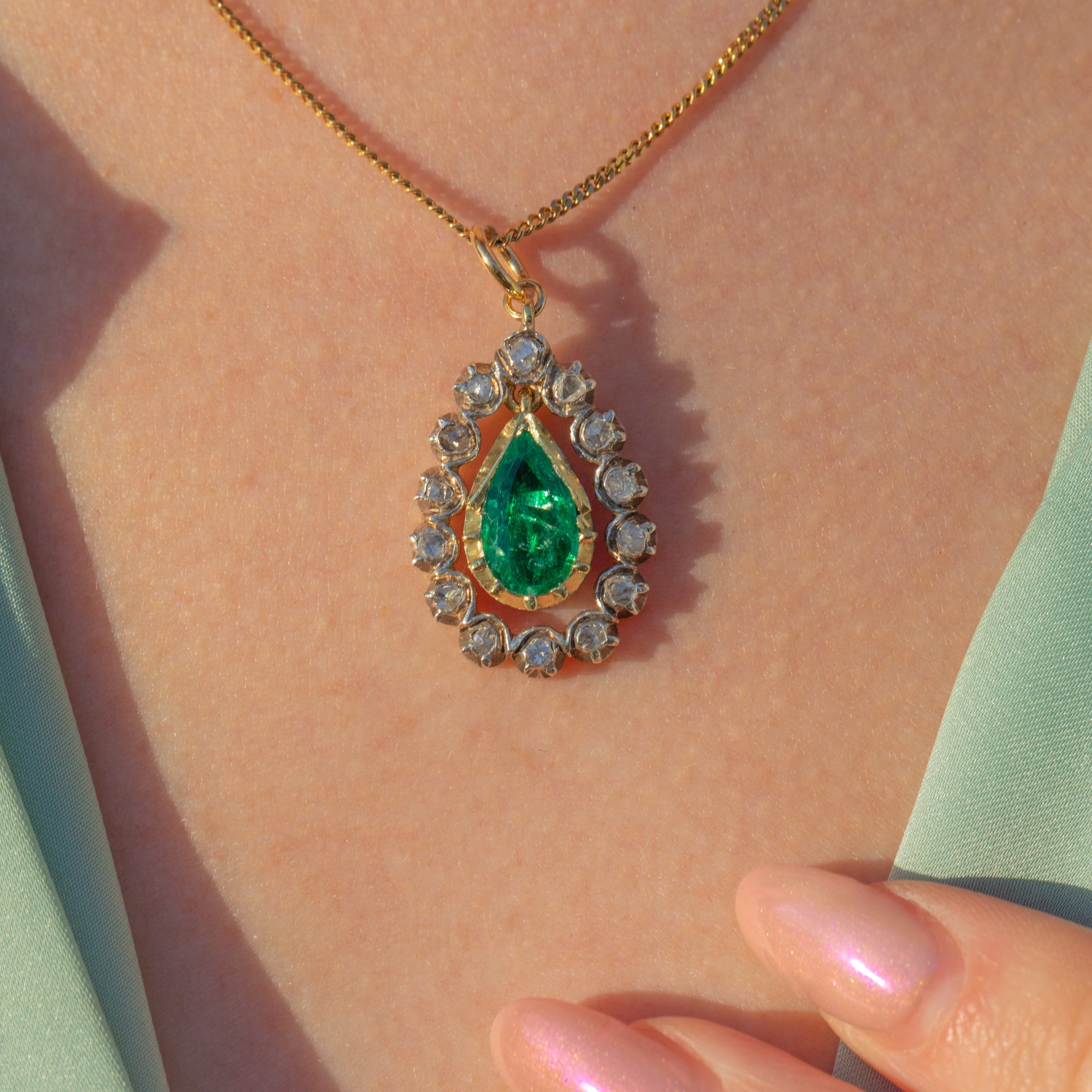 What an exquisite antique Emerald Diamond pear drop pendant! Boasting a deep green, flat-cut 1.00ct Emerald, beautifully framed by 14 old mine-cut Diamonds. What's more, this Emerald is foiled, a very rare thing to see, meaning that her verdant green is all the more vivid as a result! This Victorian piece is a feast for the senses, you can't help but let your jaw drop to the floor when you cast your eye on her!