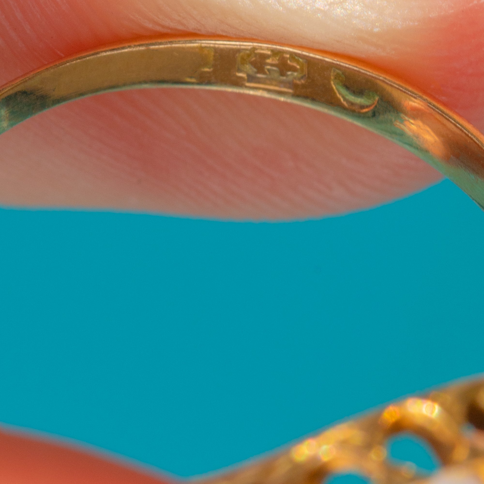EXCELLENT: Each gemstone is radiant, with no visible chips or scratches present. They are set securely within their 18ct Gold settings, and the ring's shoulder engravings have remained crisp. With little else to note, this cluster ring can be worn with utmost confidence.