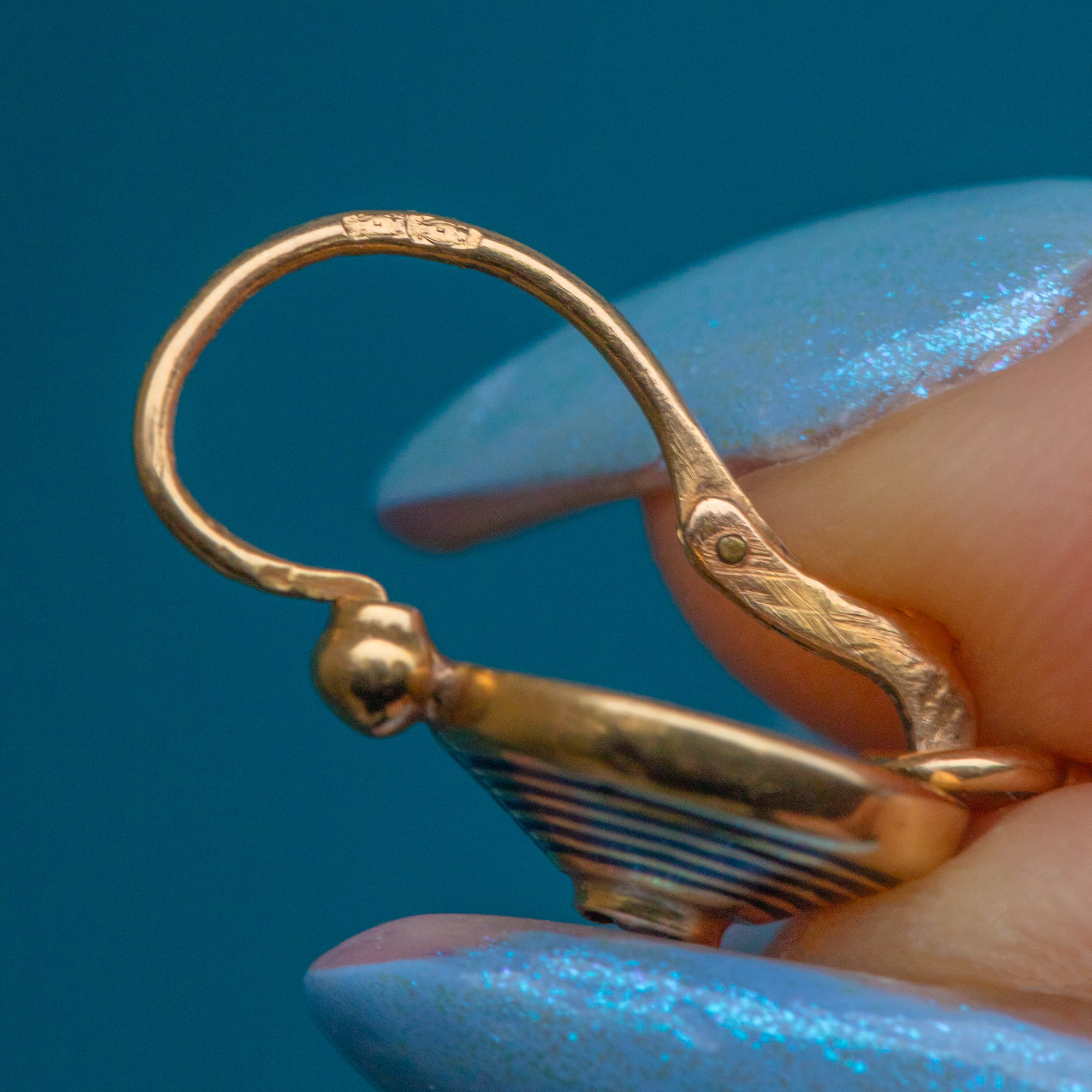 VERY GOOD-EXCELLENT. These antique French 18ct Gold black Enamel Diamond day & night earrings are in superb condition. The Gold is brightly saturated and the black Enamel is pristine and defined. Each rose-cut Diamond has crisp facets and is securely set, with no fleabites visible, and the Pearls are all present with a lovely silvery sheen. There is some general wear, to be expected from a piece of jewellery created over a century ago, and one of the ball details on one earwire has some damage, but this is barely noticeable amongst the fine details of the earrings. All the components are securely affixed with robust lever-backs that allow for confident wear!