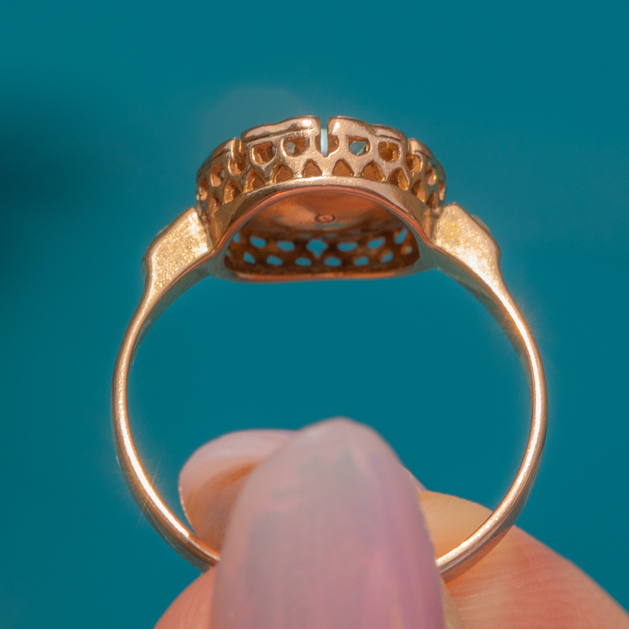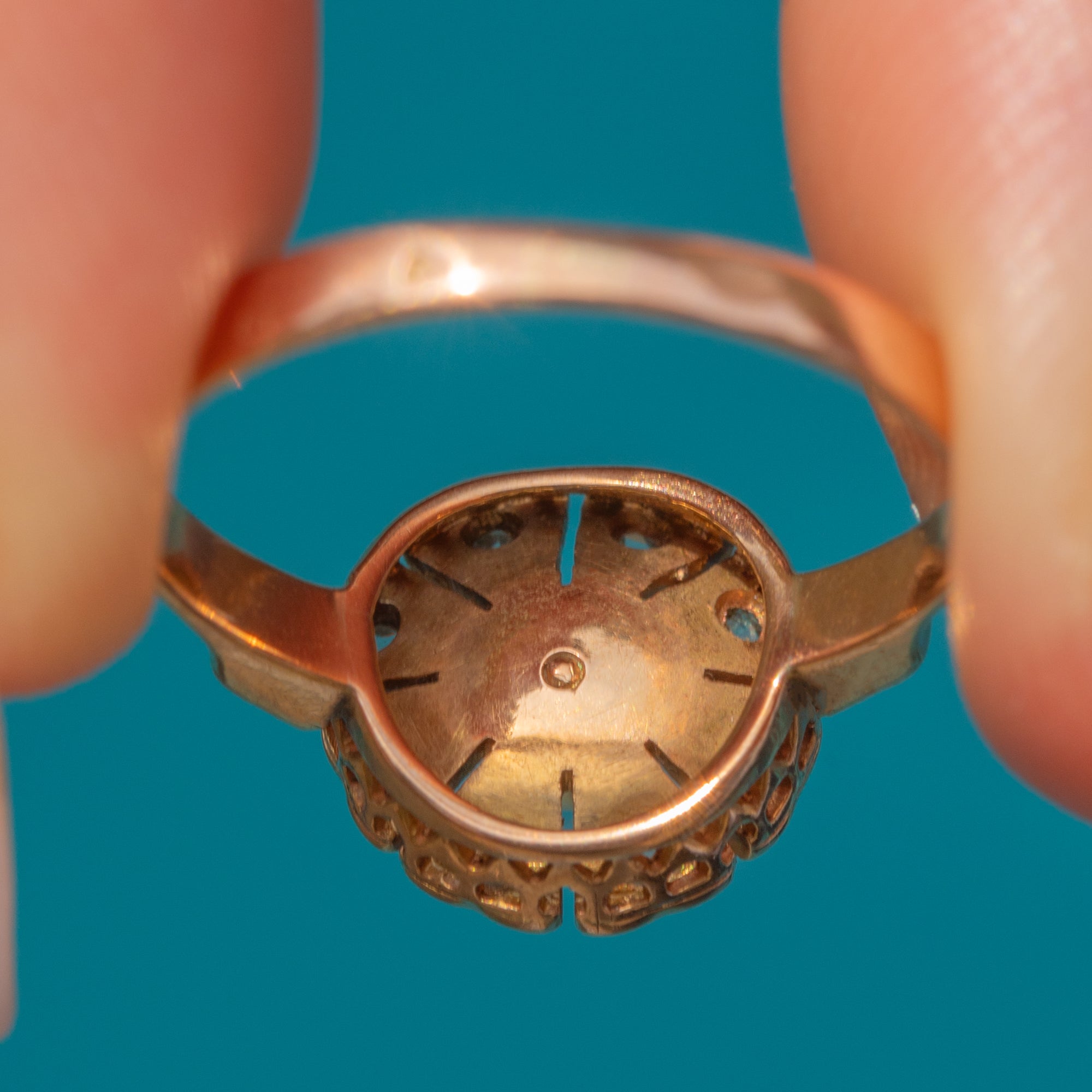 This antique ring has been crafted from rosy 18ct Gold, with its petal details and sturdy band perfectly capturing the essence of Edwardian craftsmanship. Complete with a coveted French Horse's head on the outside of the band, this floral cluster ring radiates antique allure from every angle!