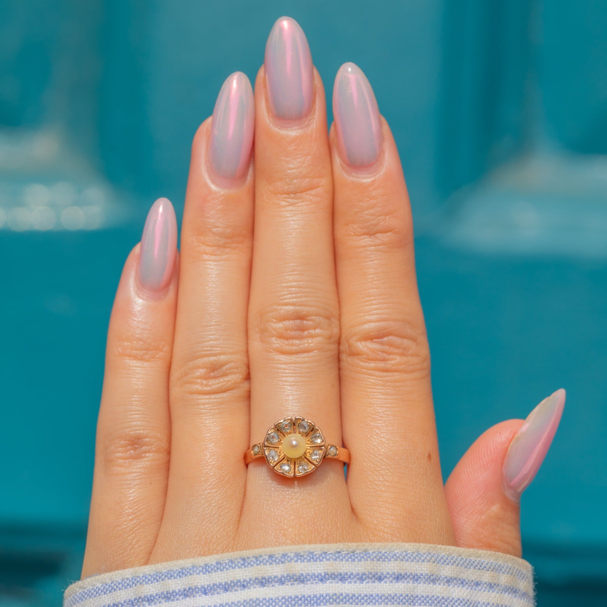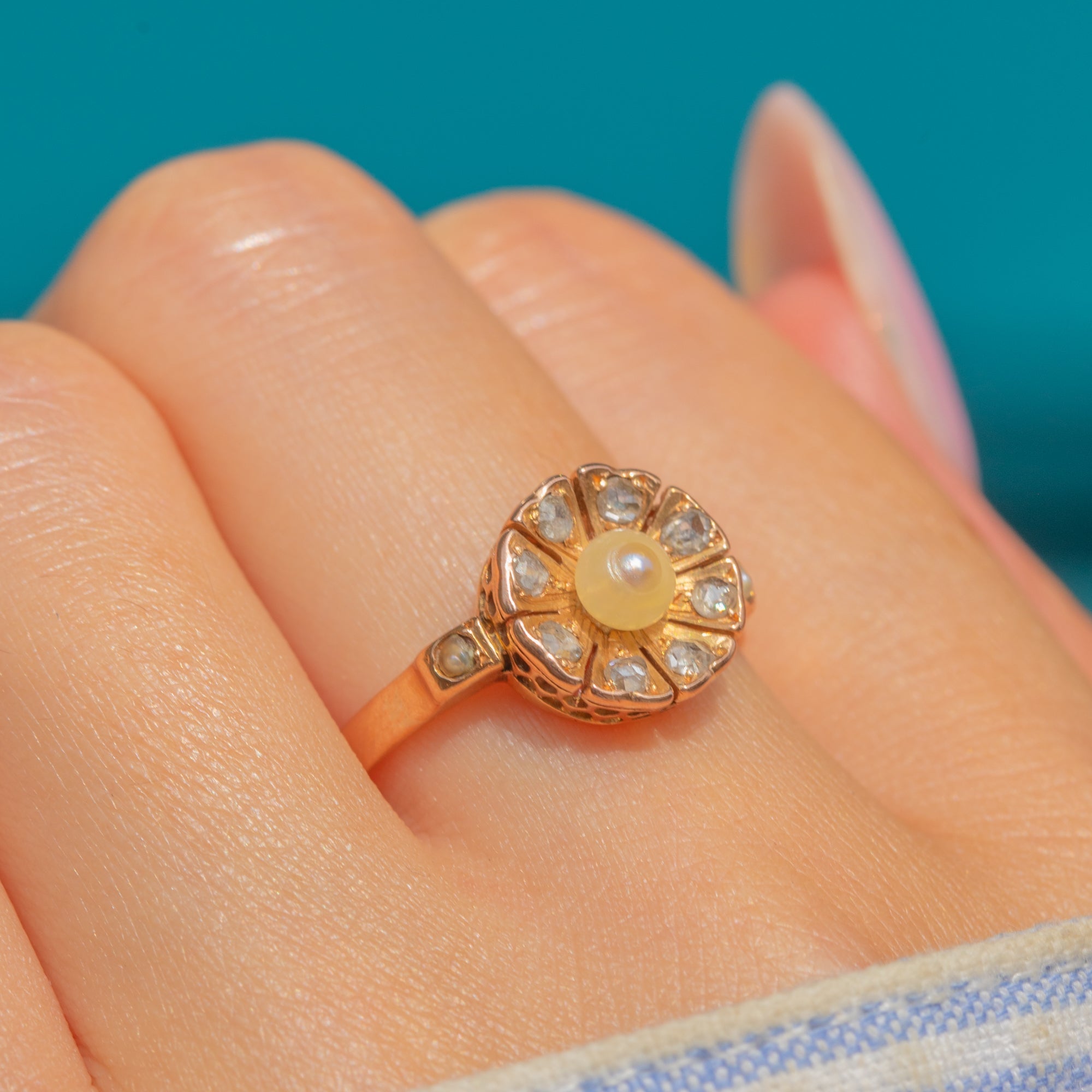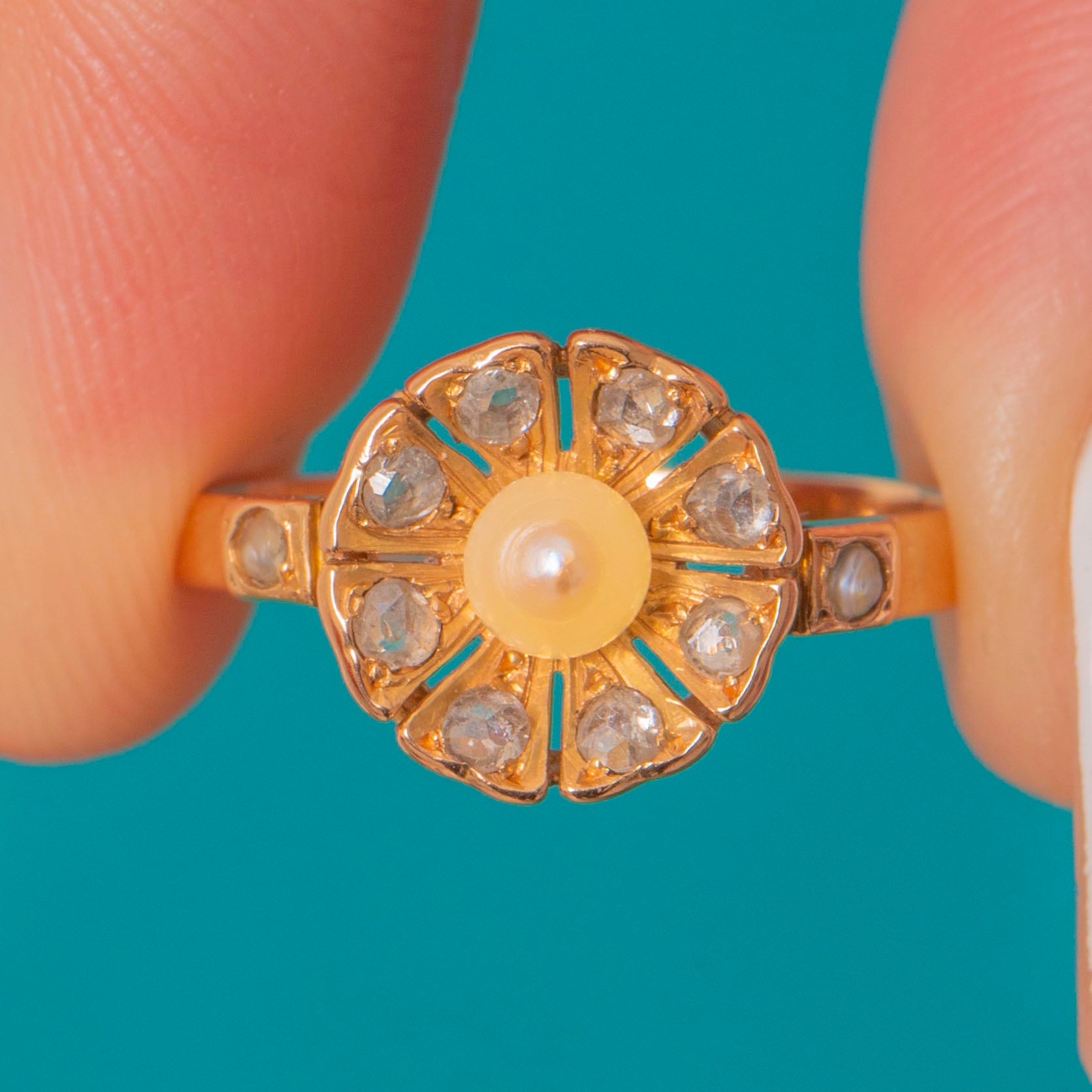 An adorable French Edwardian floral cluster ring, centred by an iridescent Pearl and adorned by a halo of scintillating rose-cut Diamonds.