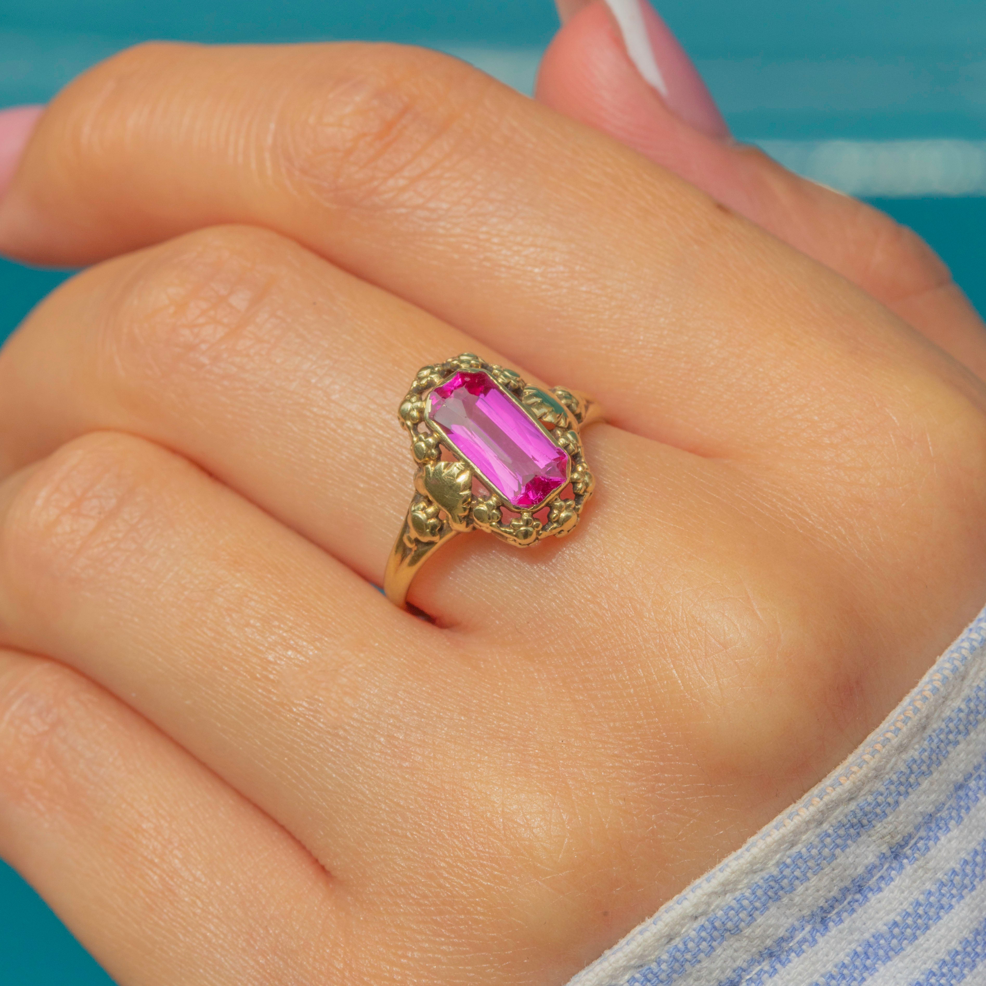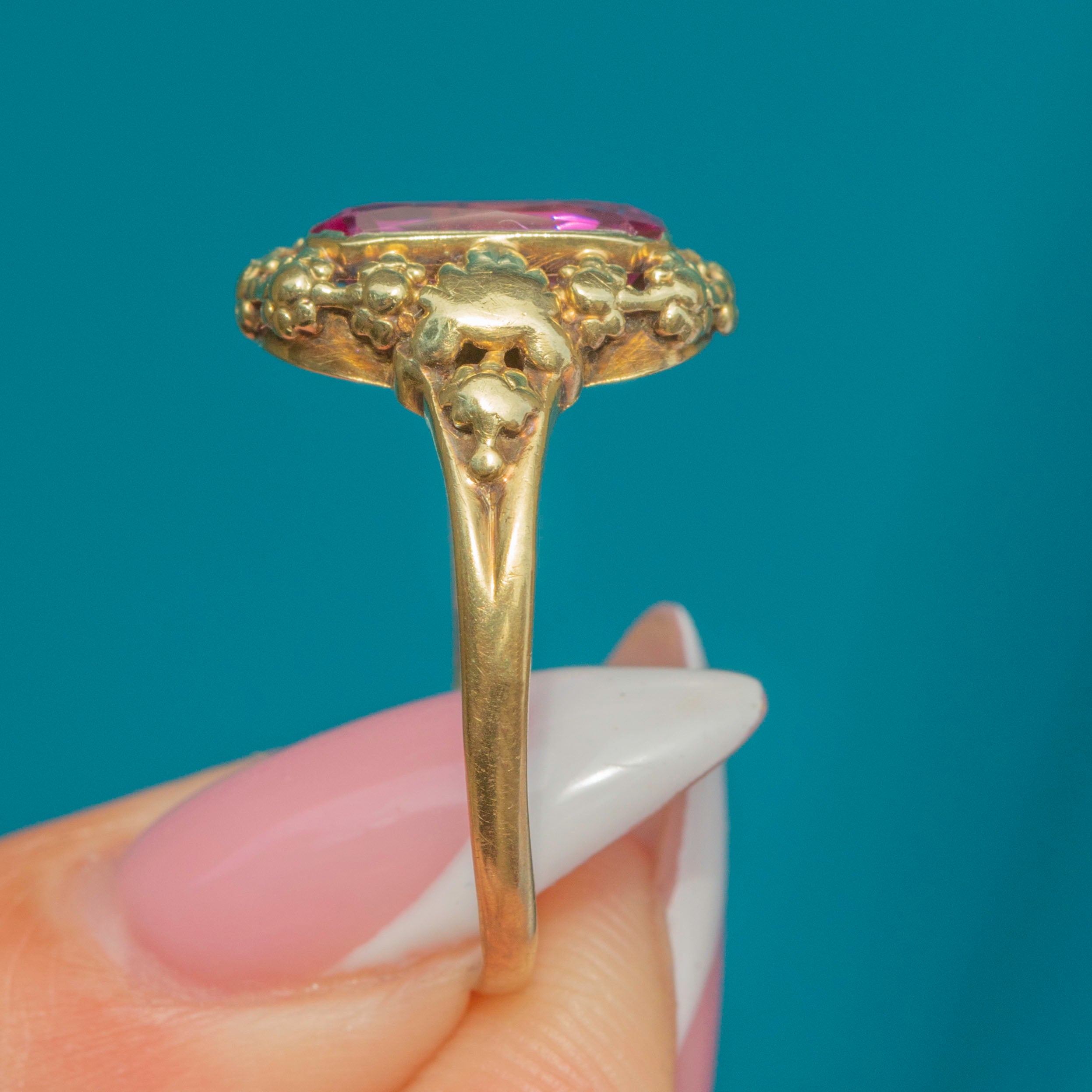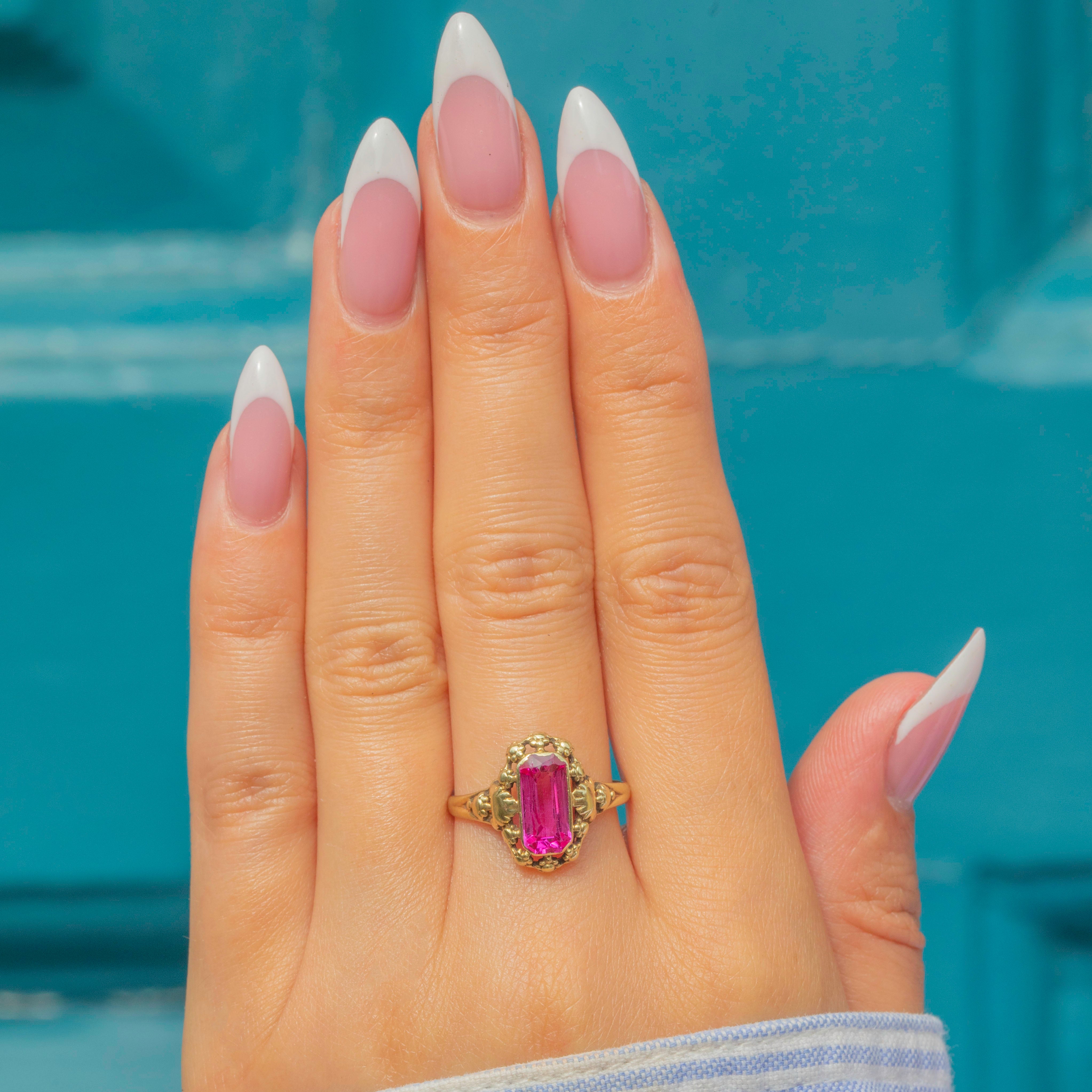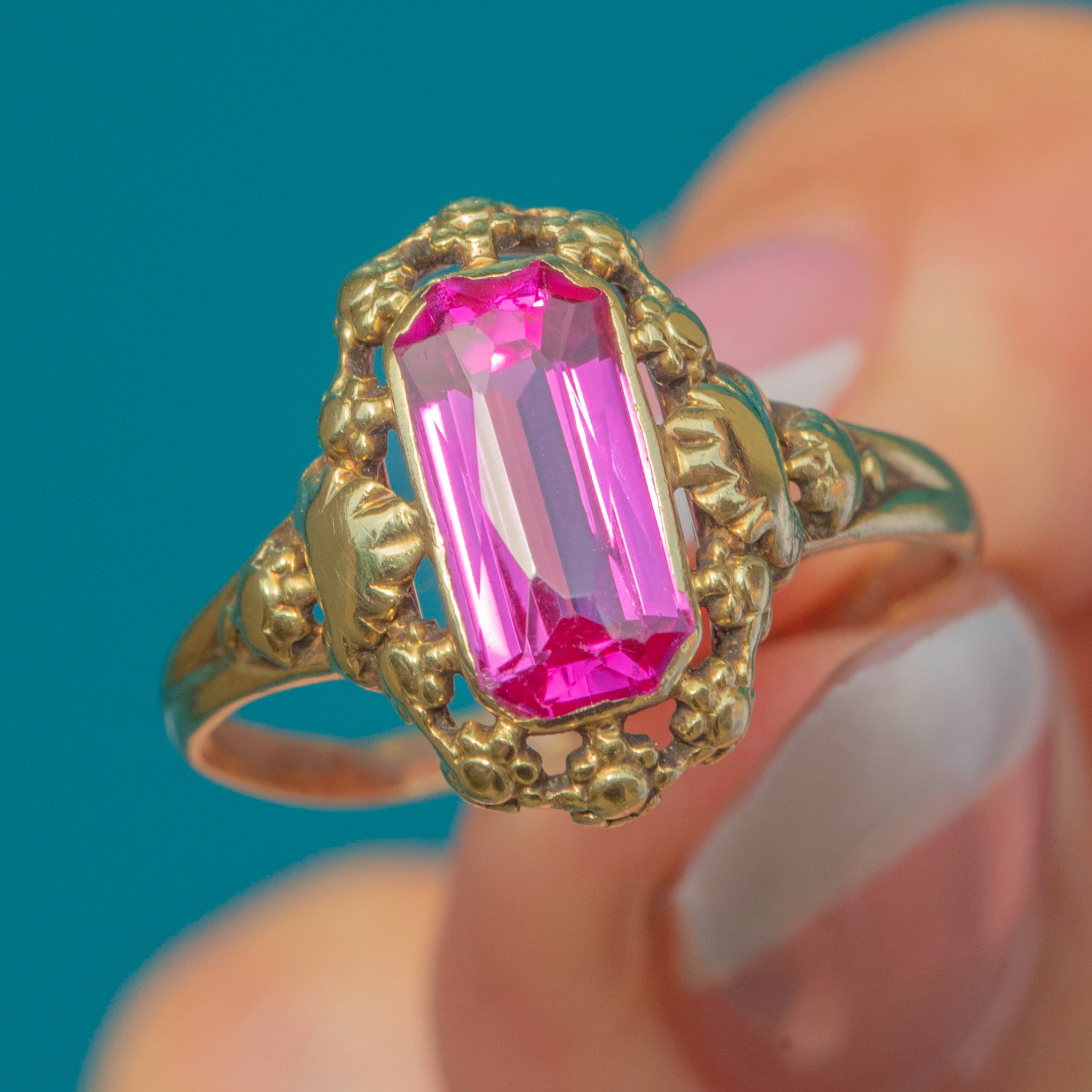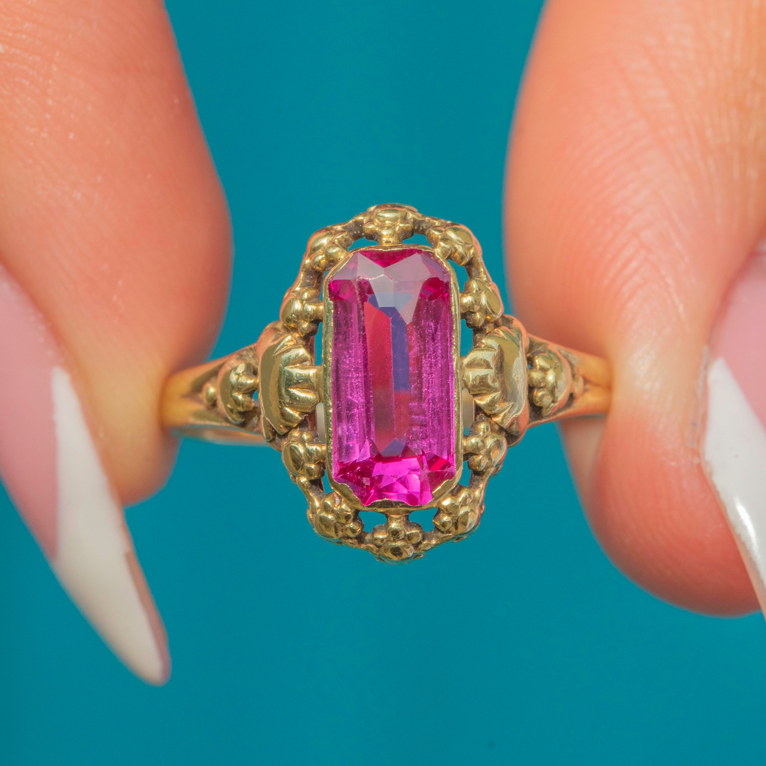 This charming antique ring features a vibrant pink paste gemstone in a sleek rectangular cut, measuring approximately 10 x 5mm. Its rich colour and crisp facets give it a lively sparkle, perfectly framed by a decorative 18ct Gold setting with delicate floral and foliate detailing.