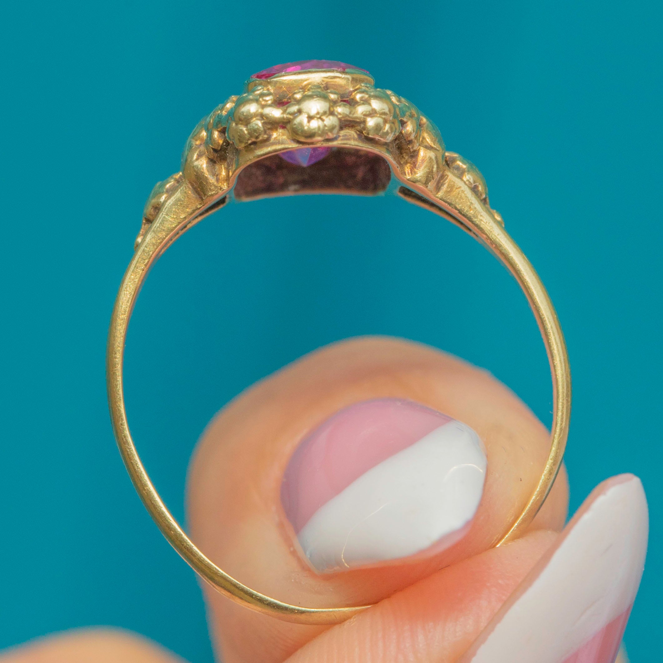 EXCELLENT: The vibrant pink paste gemstone is secure, free from chips, scratches, or damage. The 18ct Gold band shows no signs of wear, dents, or repair, and the delicate floral and foliate details on the shoulders remain crisp and well-defined. The slim band is smooth and comfortable, reflecting careful preservation. Overall, this charming ring presents beautifully, ready to wear or gift.