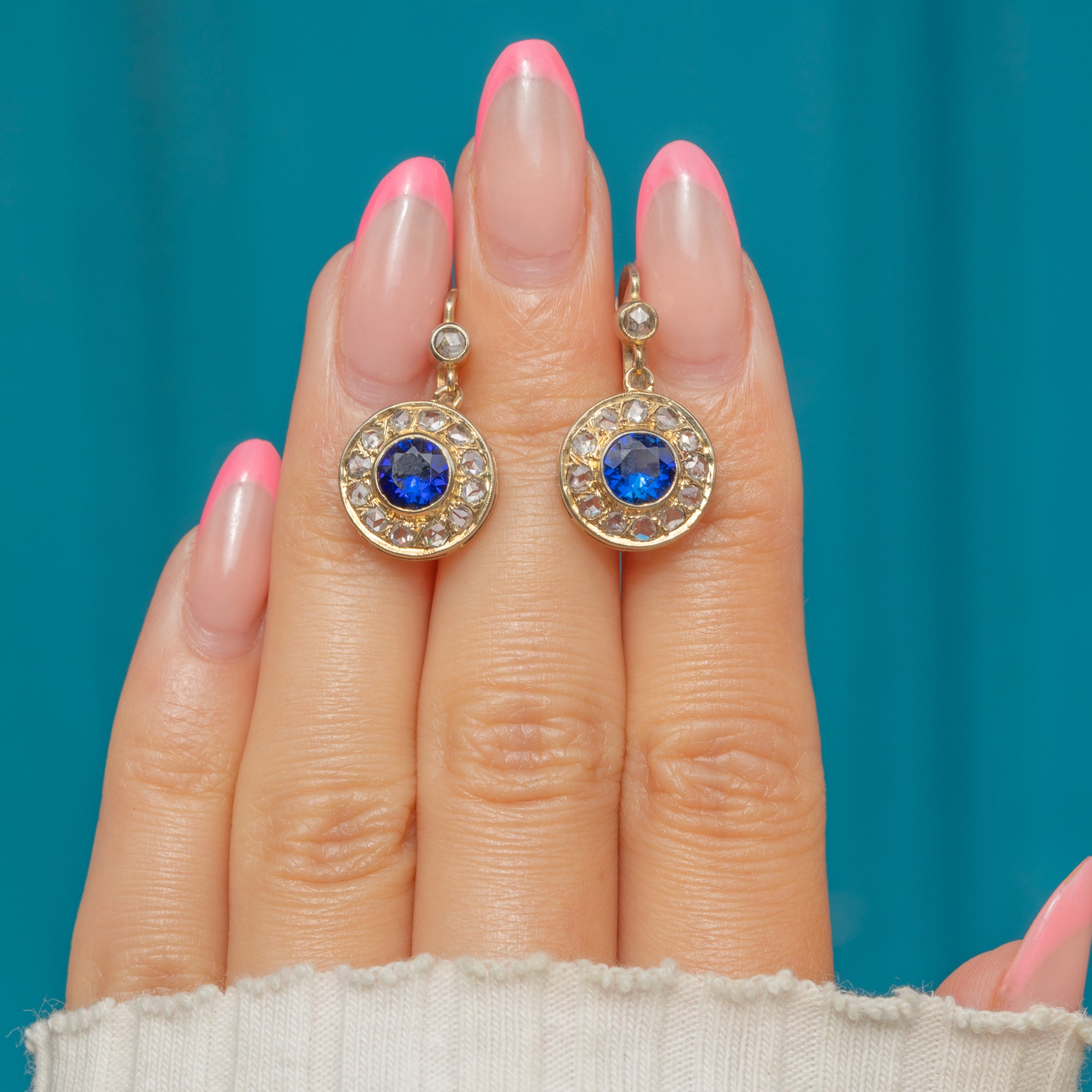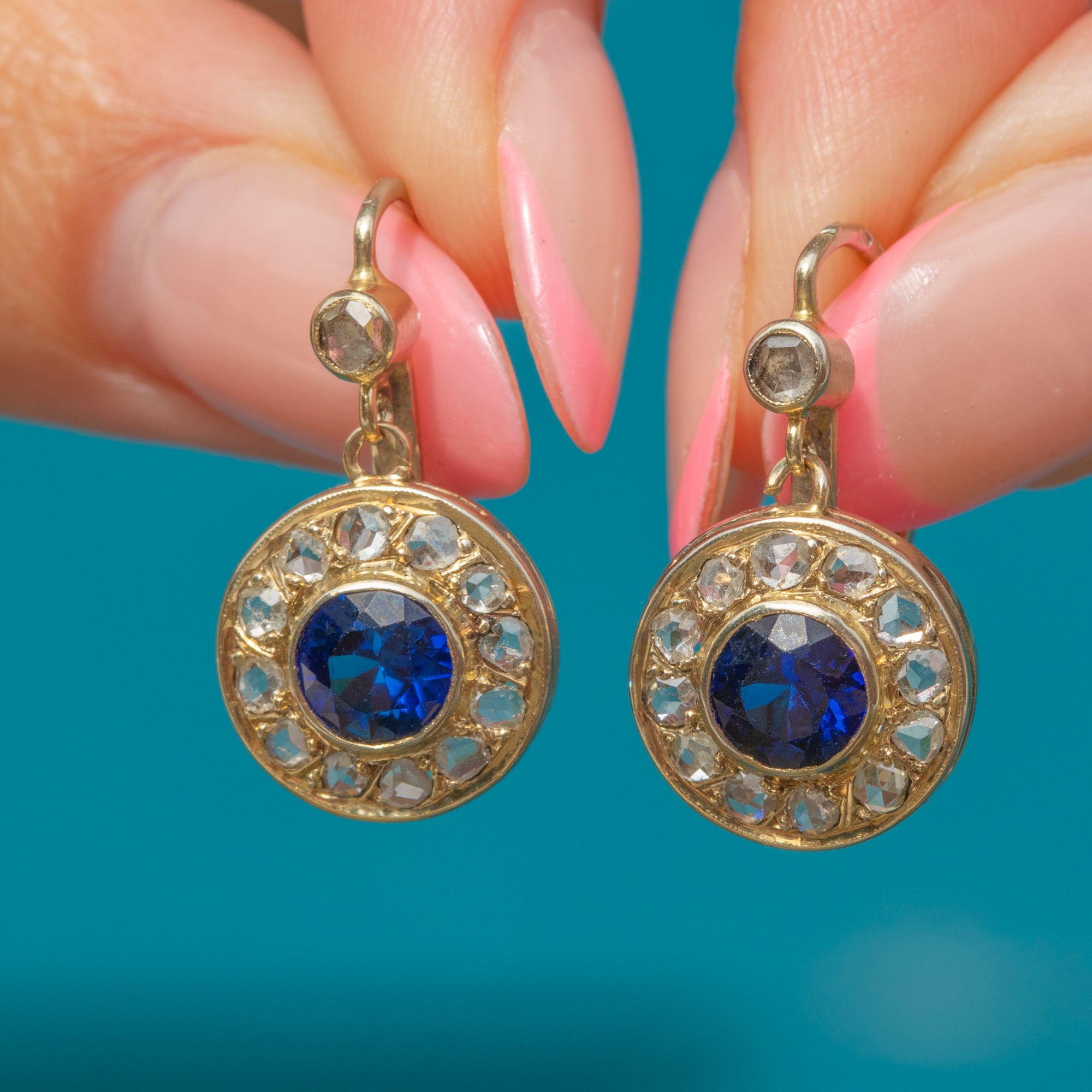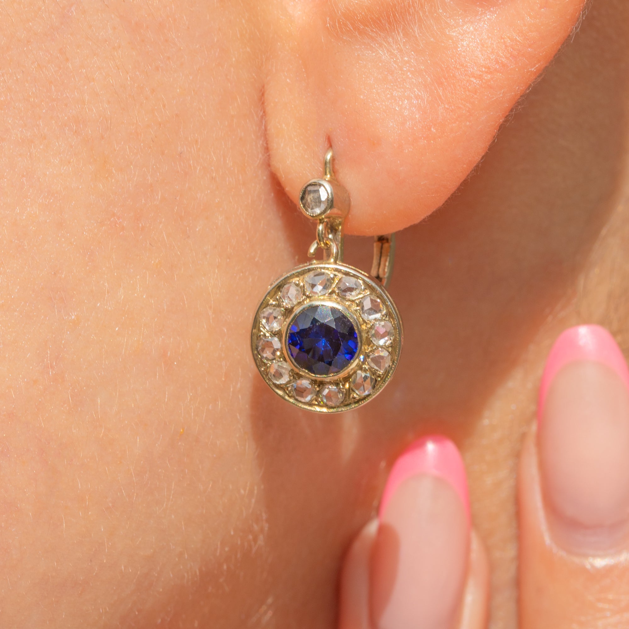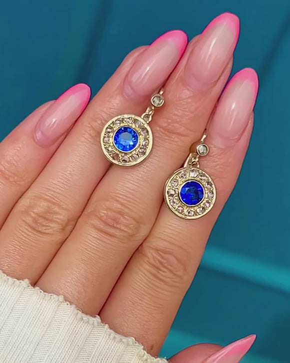Each earring suspends a vibrant royal blue Sapphire, boasting 1.25ct combined and encircled by a halo of scintillating rose-cut Diamonds, like stars to a midnight sky, all set within buttery 18ct Gold settings.