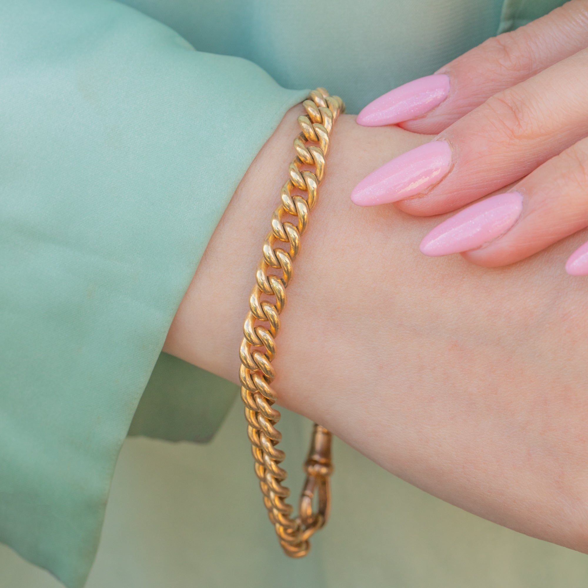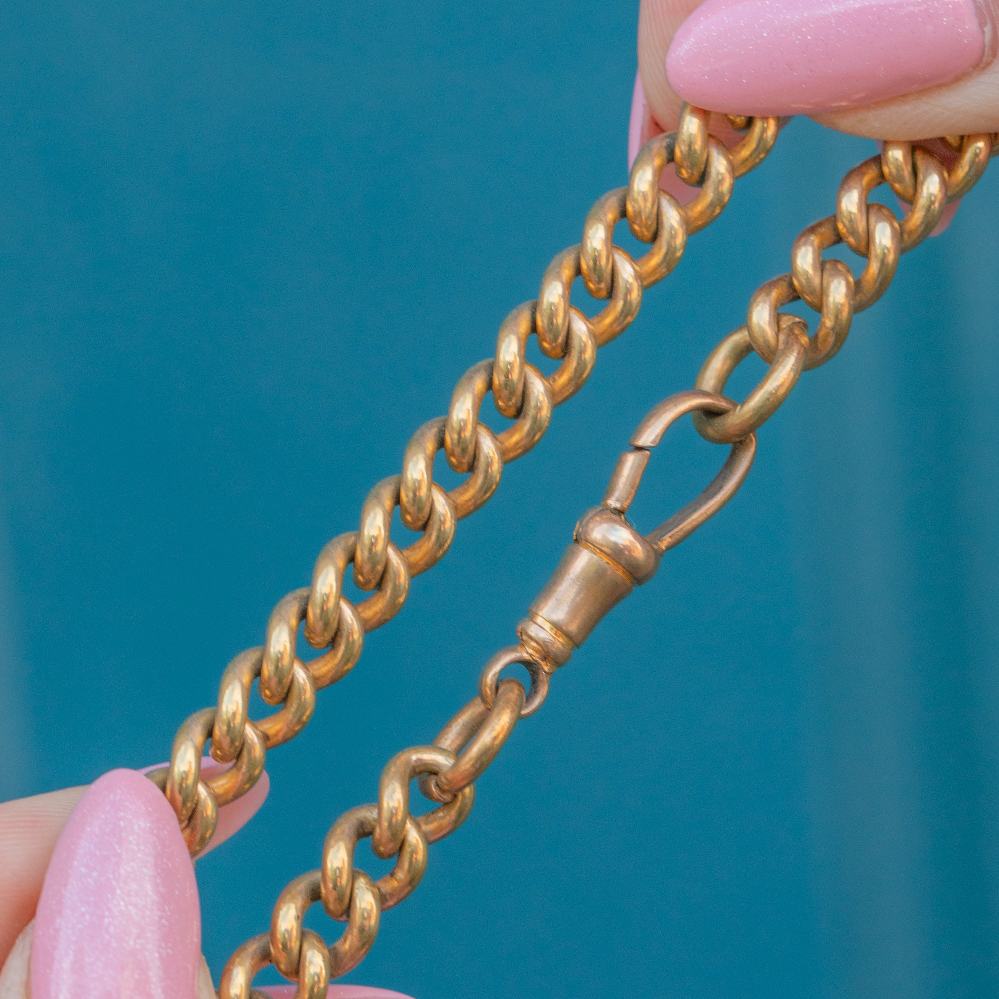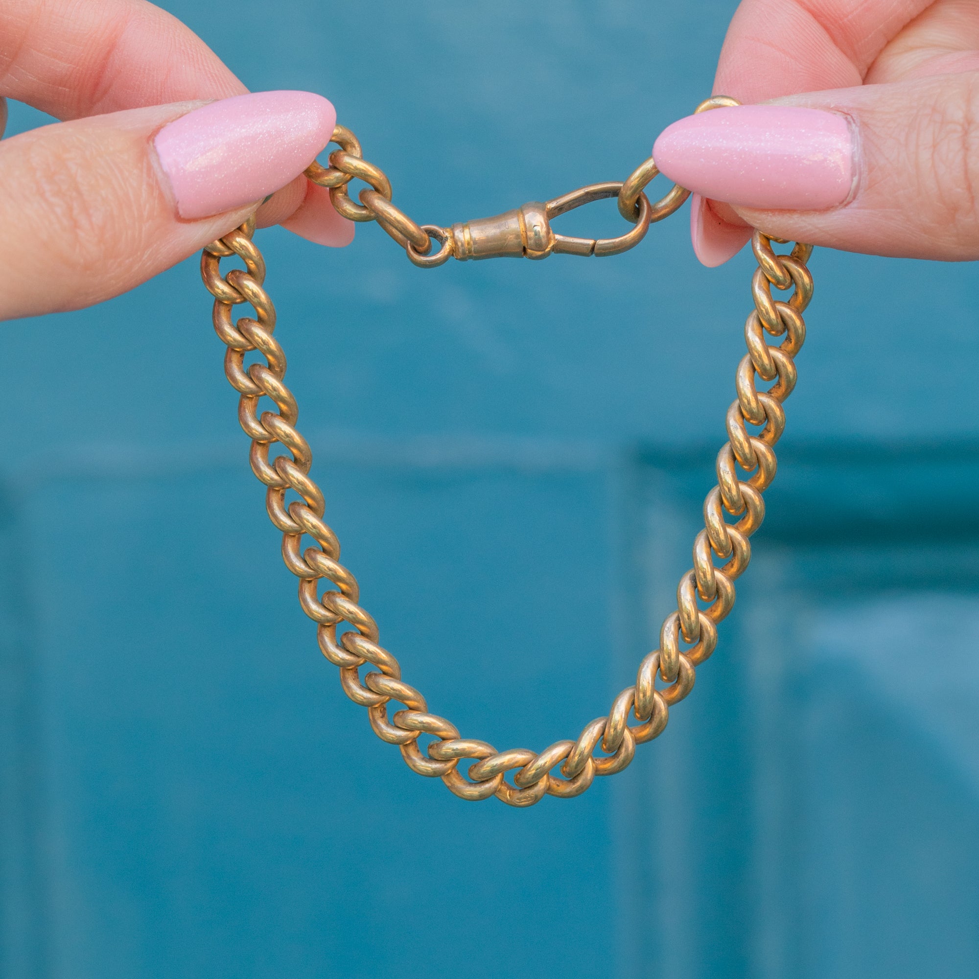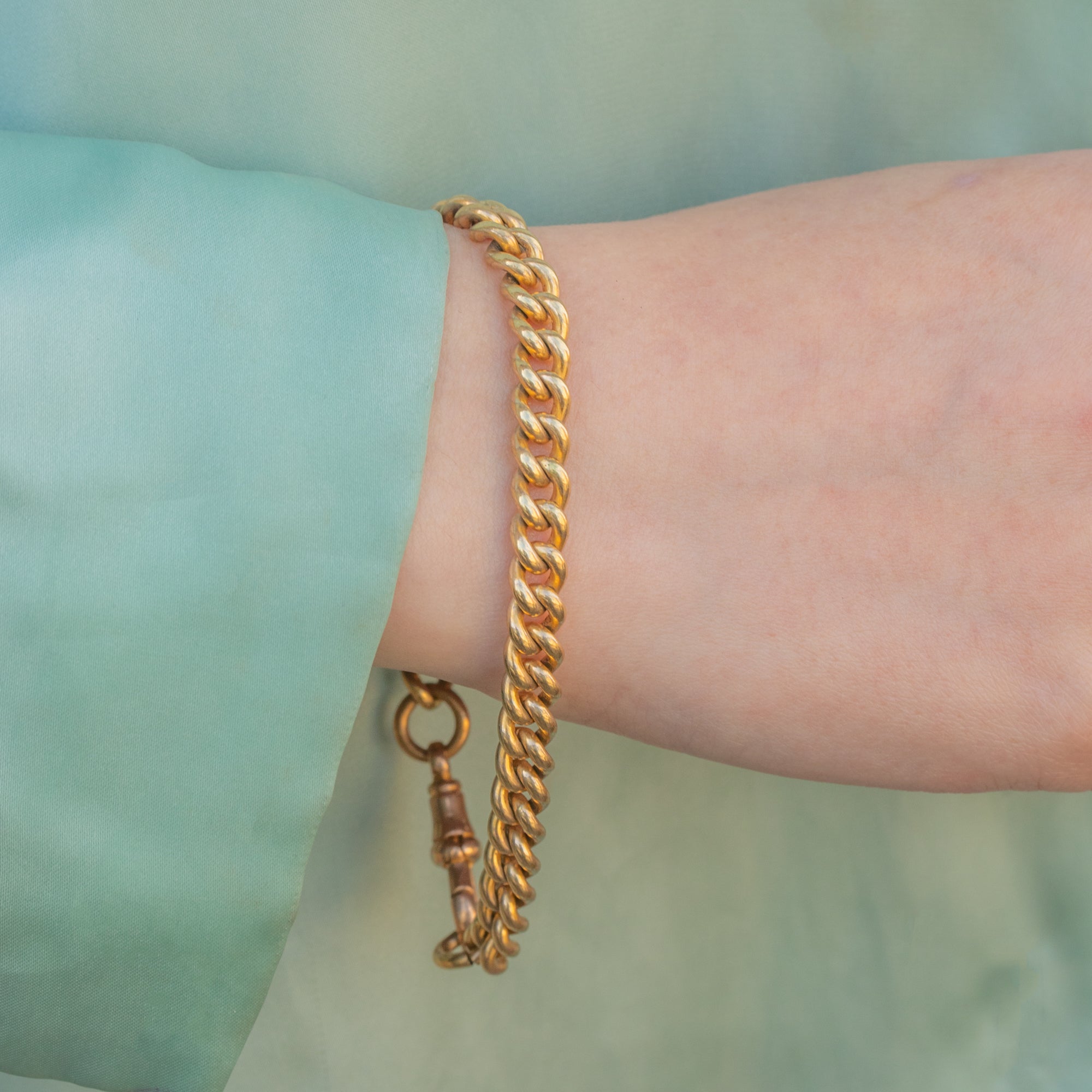 VERY GOOD. This antique Gold toned curb link bracelet is in very good condition! The links are secure, the dog-clip is in perfect working order and you can wear the bracelet confidently. The Gold tone has lasted very well, only the dog-clip has some surface wear commensurate with age.