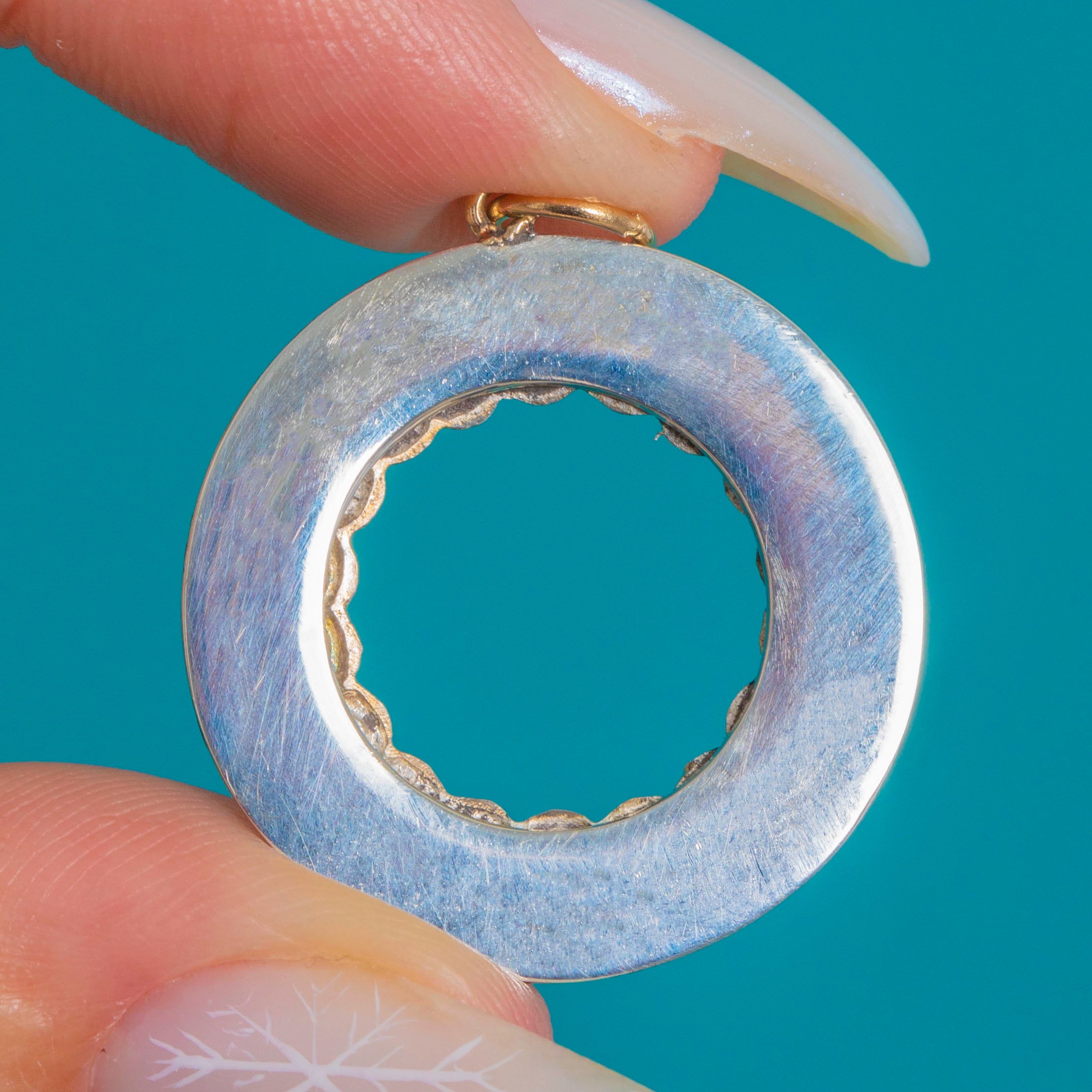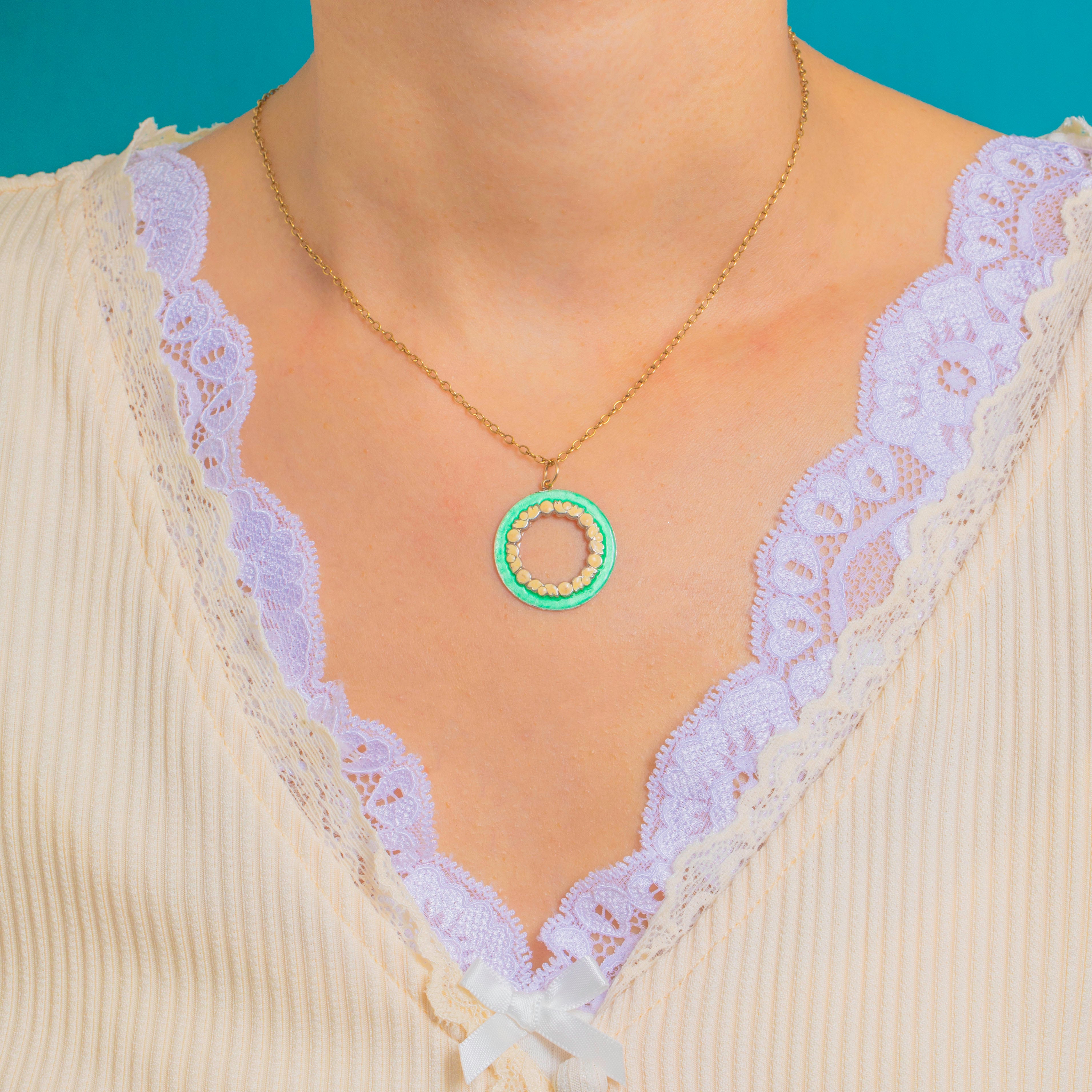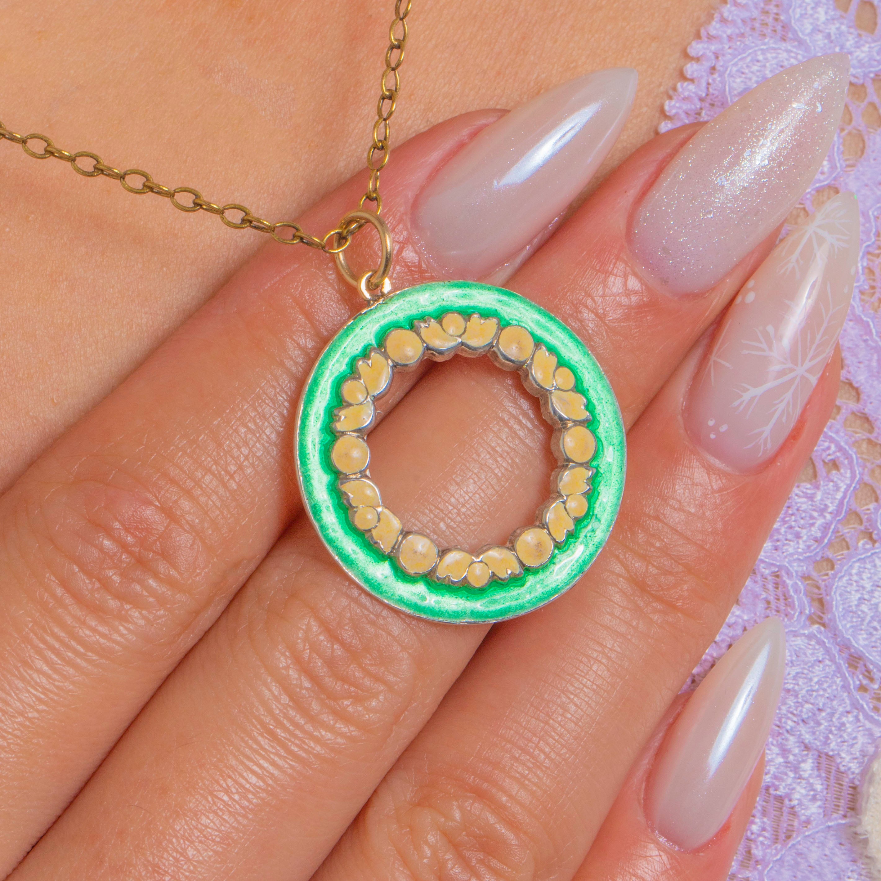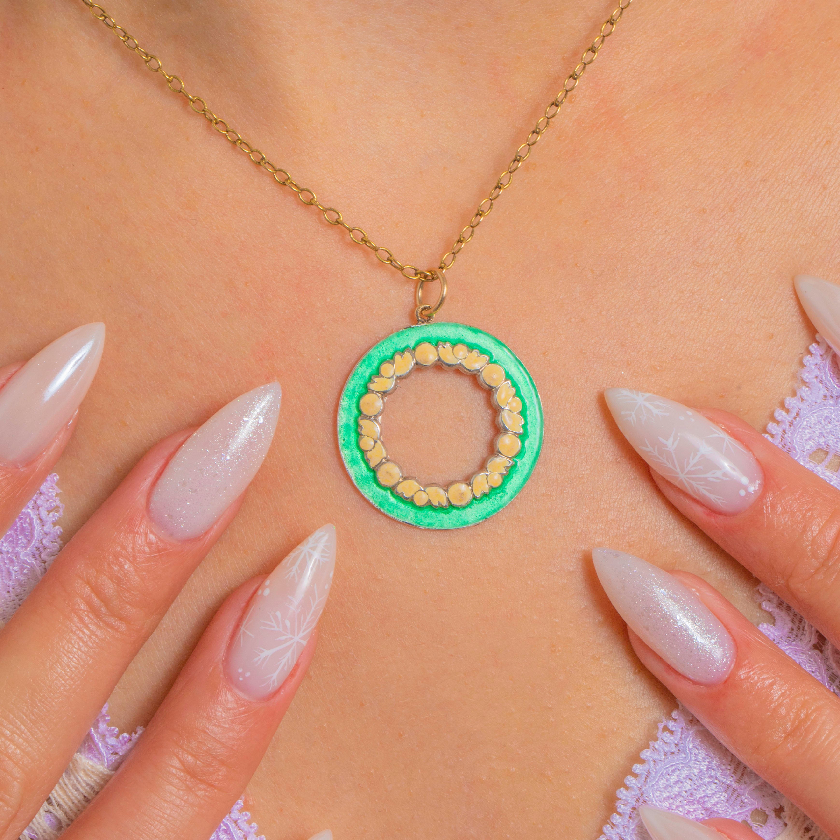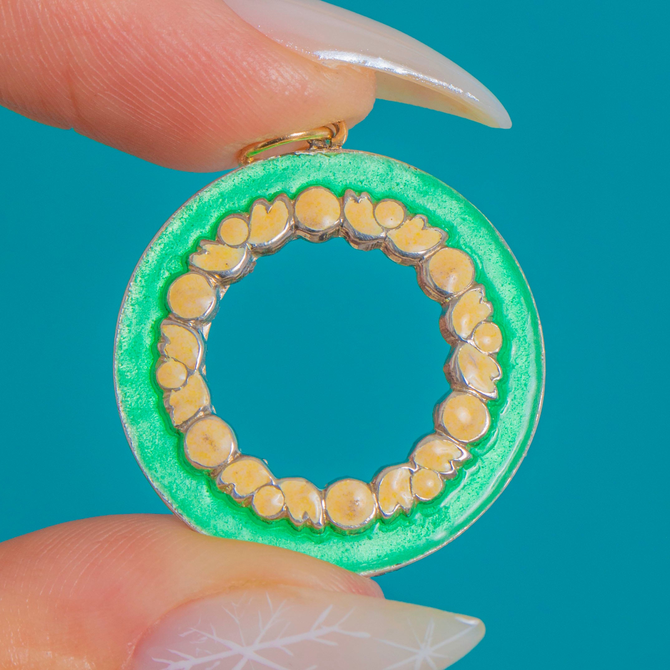 A vivid Victorian roundel pendant with a luminous green Enamel halo encircling a continuous wreath of tiny pale yellow Enamel details. Crafted in Silver, the crisp openwork and glossy Enamel create a delicate, graphic silhouette with beautiful antique character.