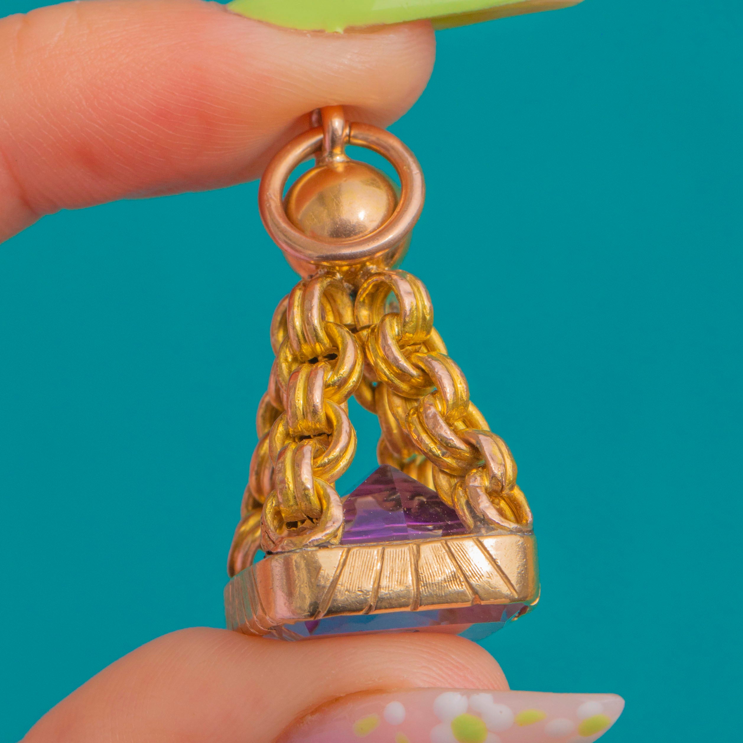 Sculptural and soulful, this antique Portuguese fob seal pendant pairs rich Gold with a beautifully Amethyst intaglio that reads “Emanar” — “to live with feeling”. The design is wonderfully architectural: a polished orb finial leads to three petite chain drops that gather at a low, engraved bezel, framing the vibrant purple gem with elegant detail.