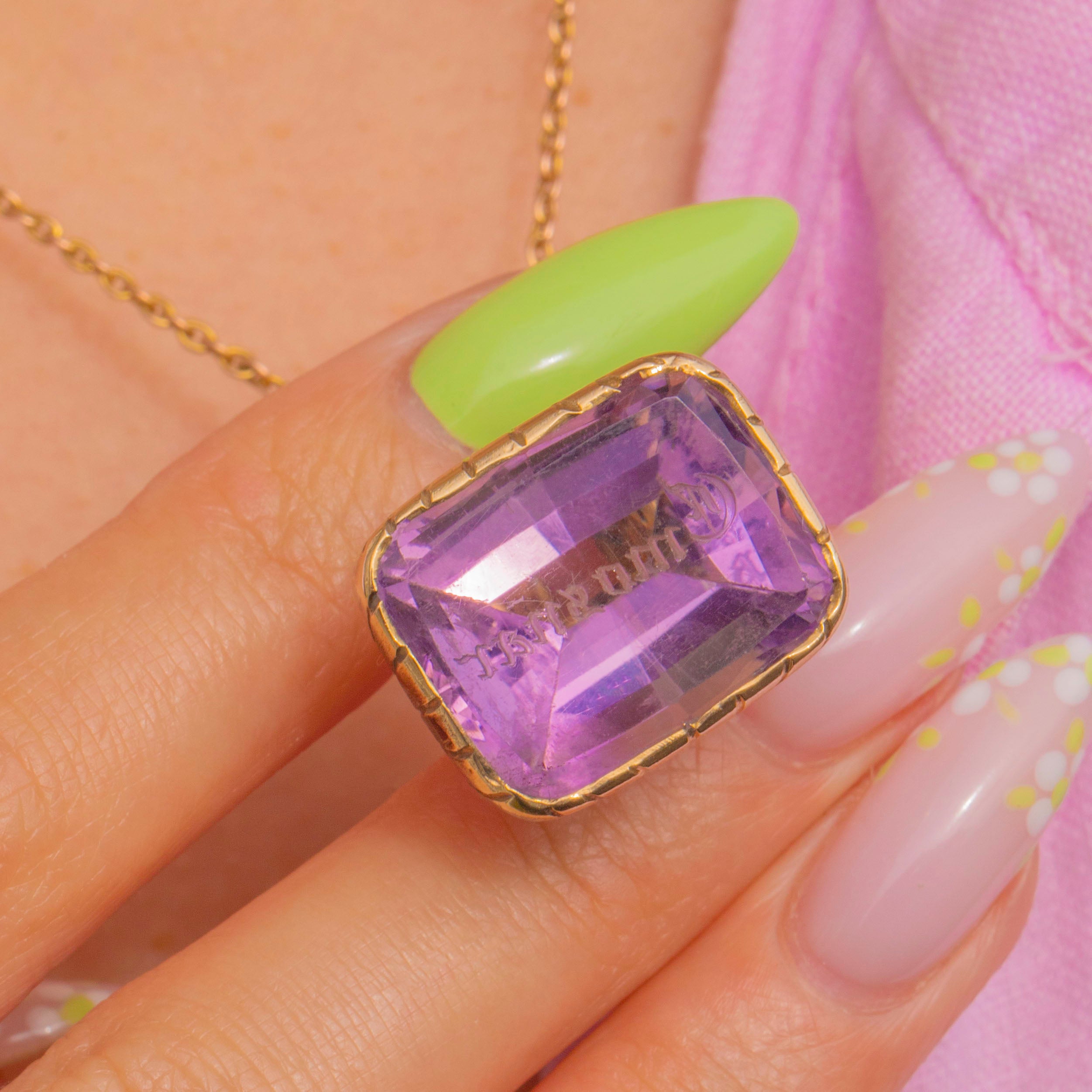 VERY GOOD: The Amethyst presents beautifully and is securely set, with no damage observed; only light natural surface marks visible under close inspection. The Gold setting and chain bail segments show gentle surface wear and high-point rubbing commensurate with age, with minor soldering irregularities at the joins from original manufacture. Overall, the piece has been well cared for and wears wonderfully.
