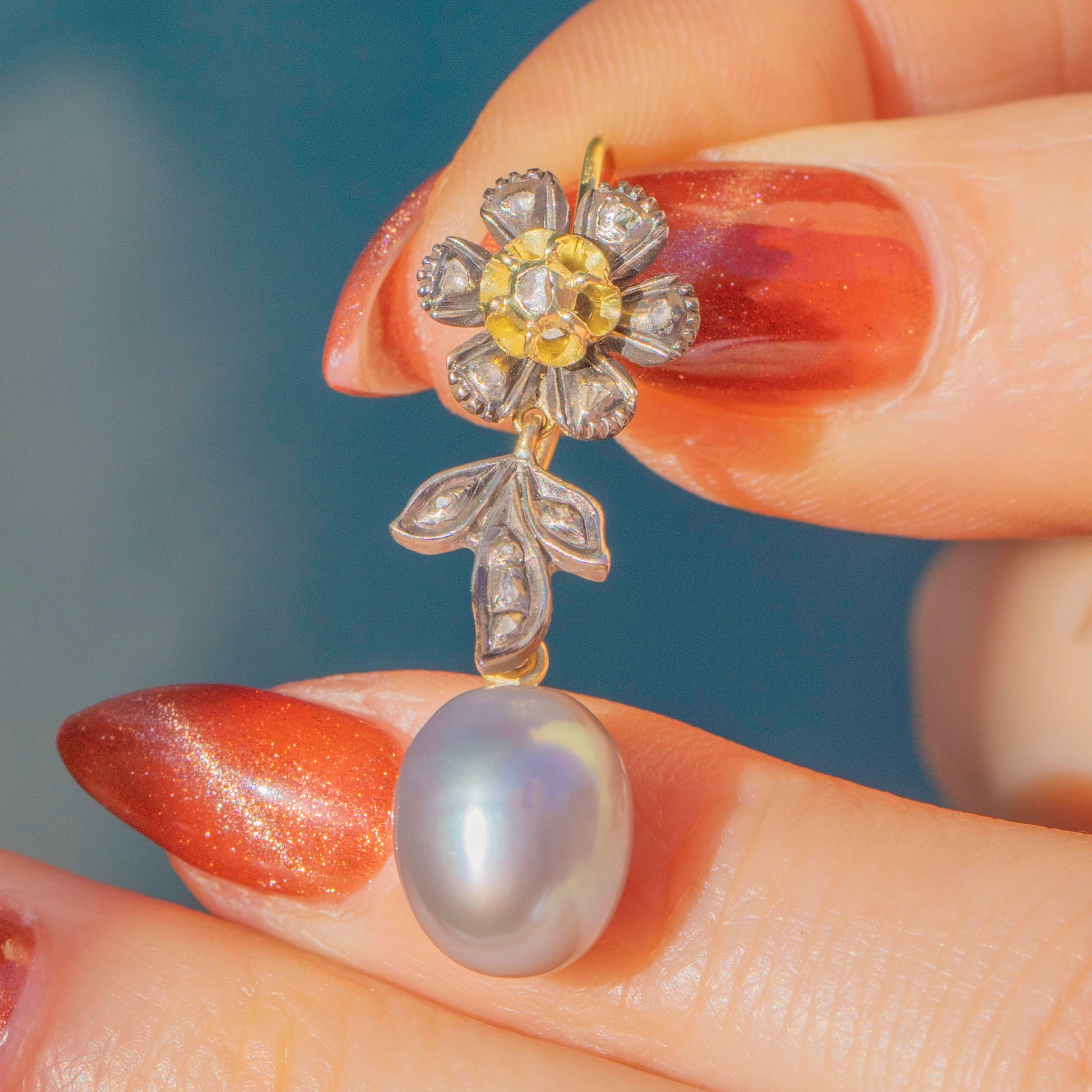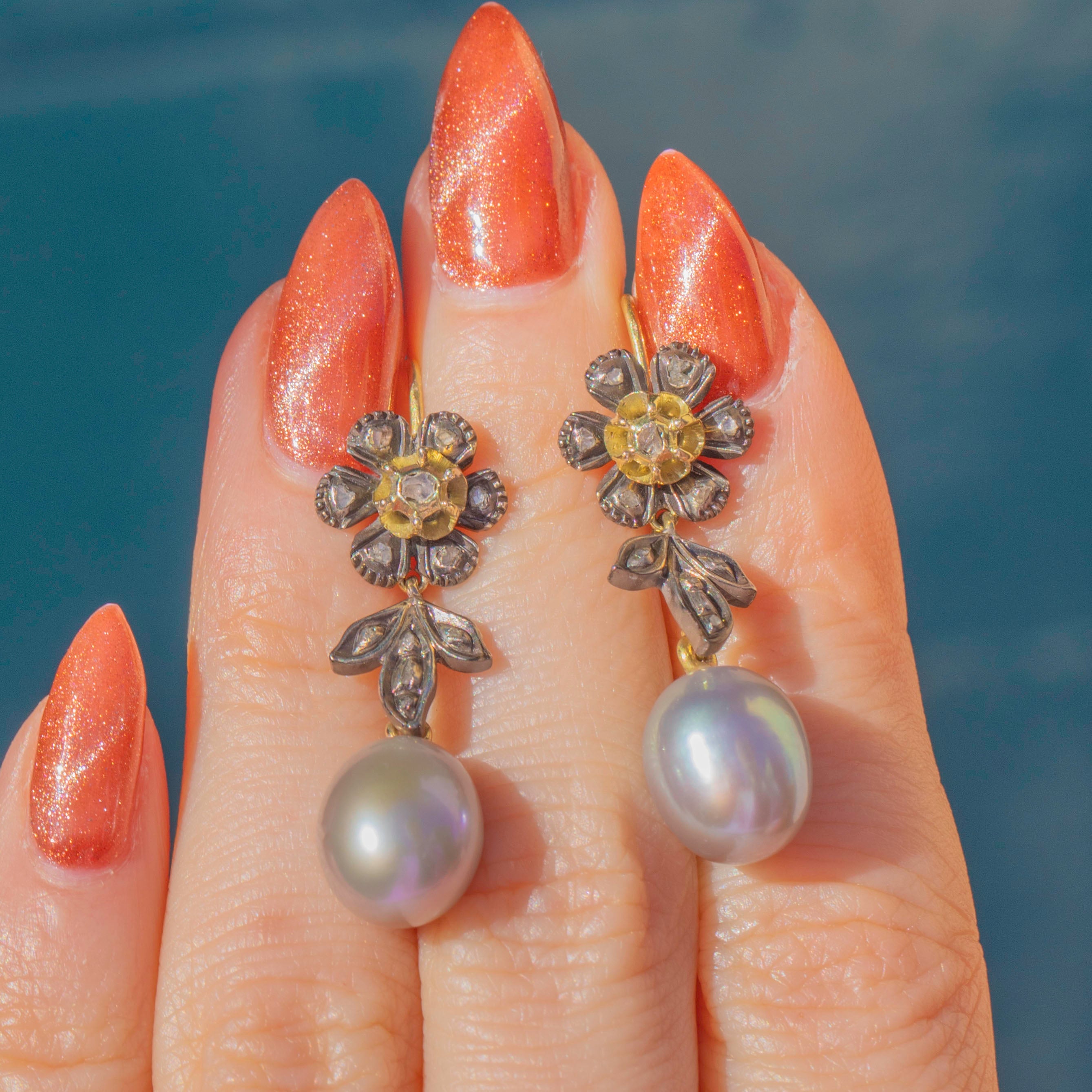 VERY GOOD-EXCELLENT. These Victorian rose-cut Diamond flower Pearl drop earrings are in superb condition. Each component is securely affixed and the hooks are robust, providing comfortable and secure wear. The Diamonds are all present with only minor wear on the floral settings, but they all remain securely set. The Silver has accrued an admirable patina giving the earrings a dramatic finish and highlighting the brilliance of the Diamonds. The Pearls are radiant and smooth, free from visible signs of surface wear, and securely connected. With so much beauty to admire, these antique Diamond Pearl earrings will look resplendent suspended from your lobes!