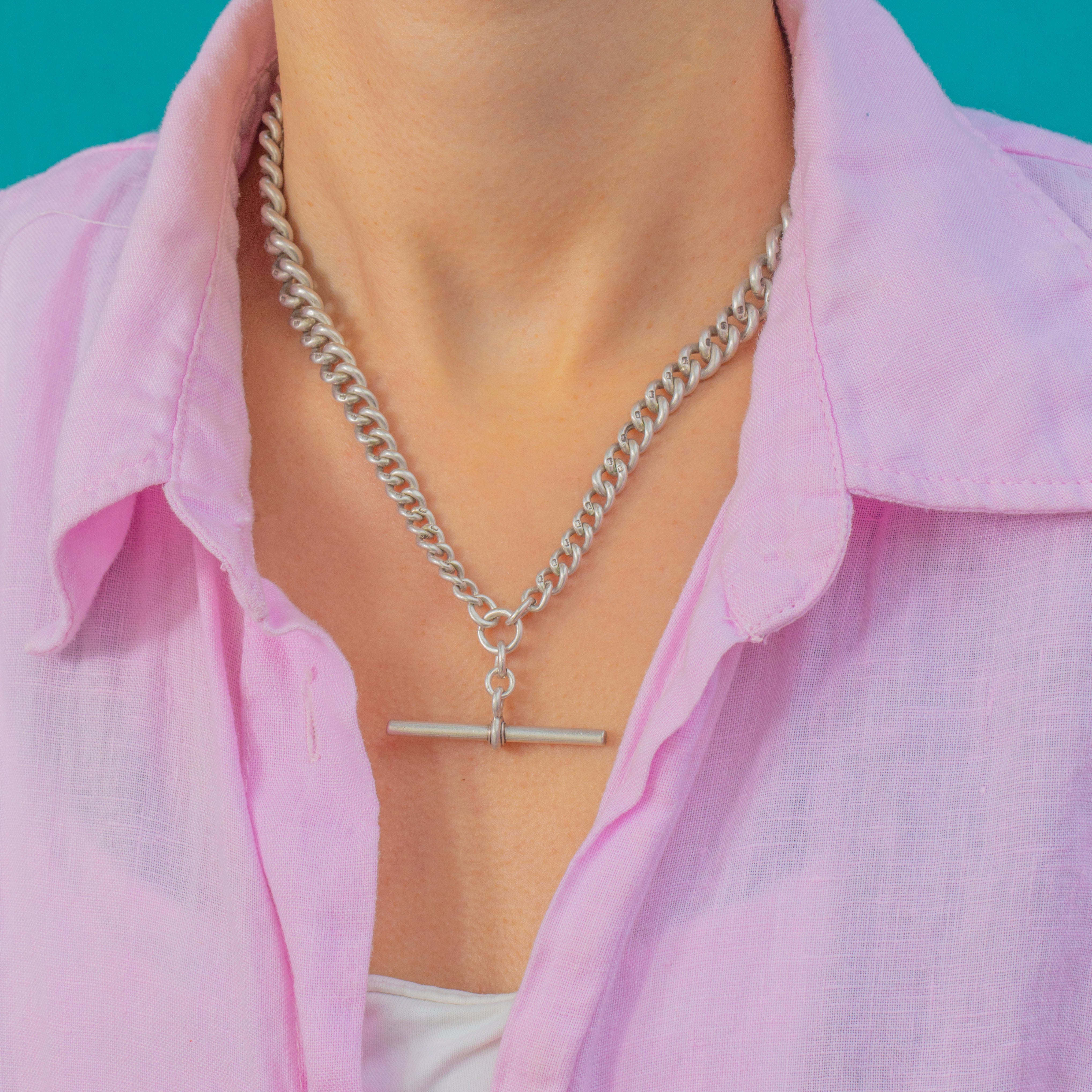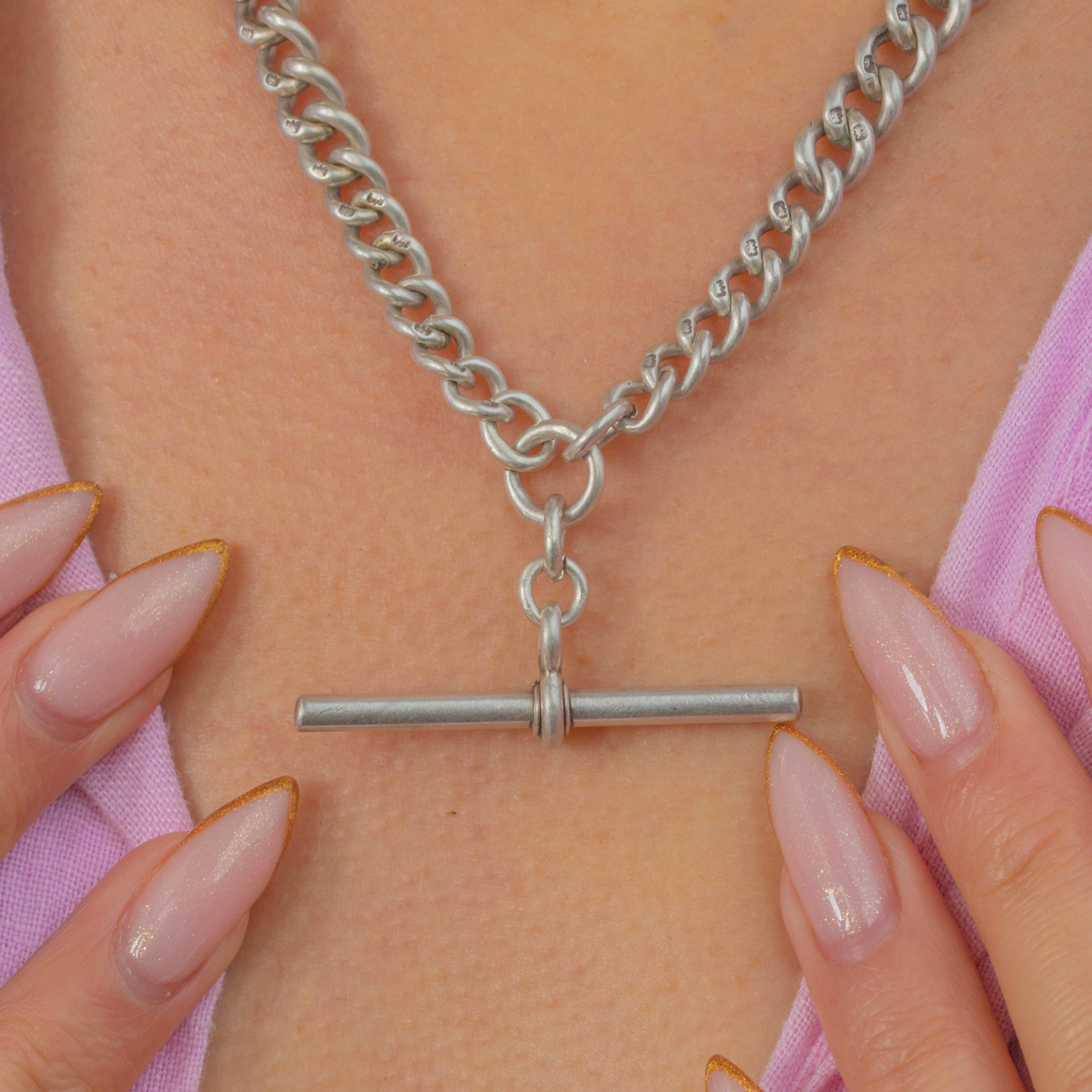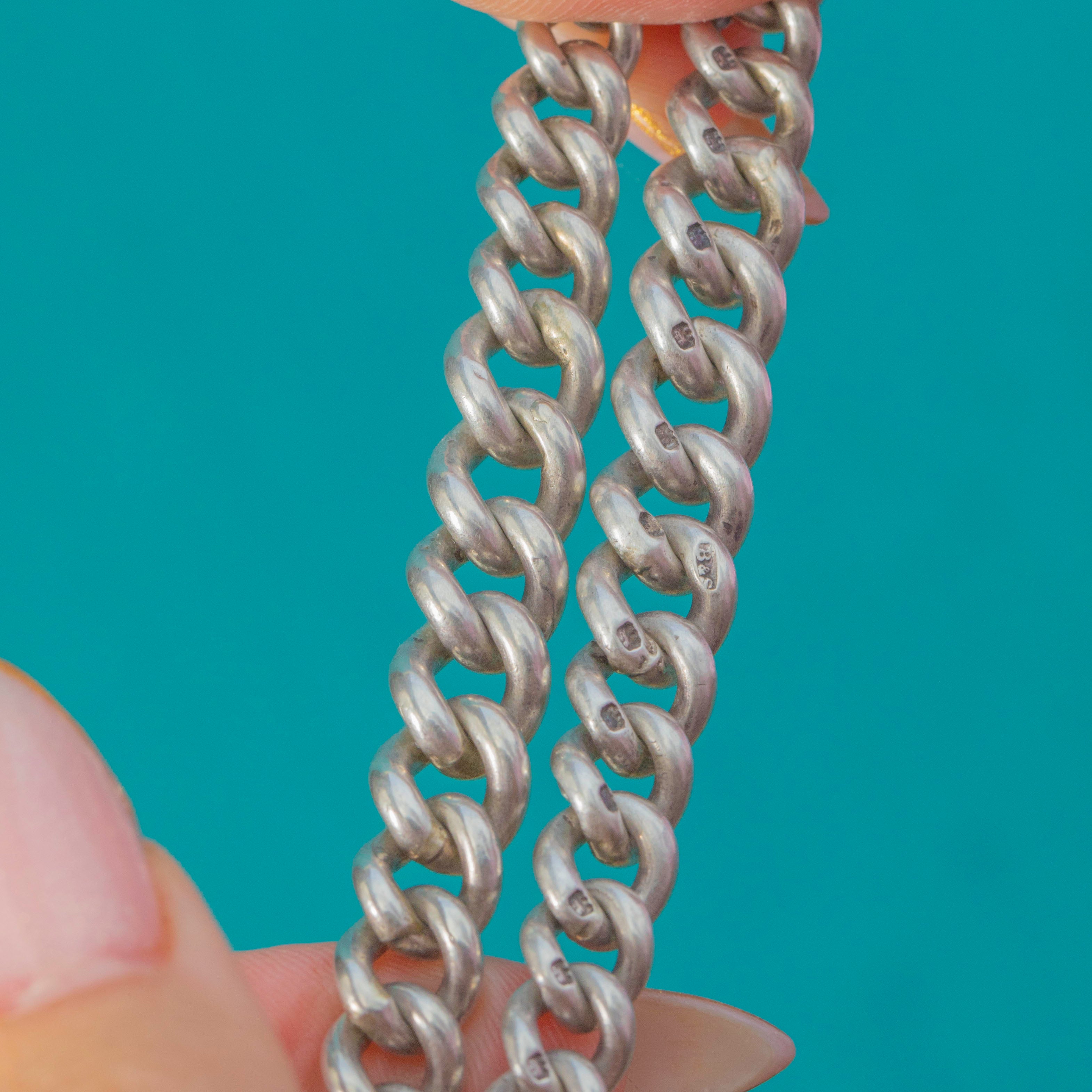 This antique Victorian Sterling Silver Albert chain is a beautifully made piece, featuring matching dog-clips, a classic T-bar, and crisp English hallmarks throughout. The graduating curb links give it a wonderfully substantial look, enhanced by its rich antique patina.