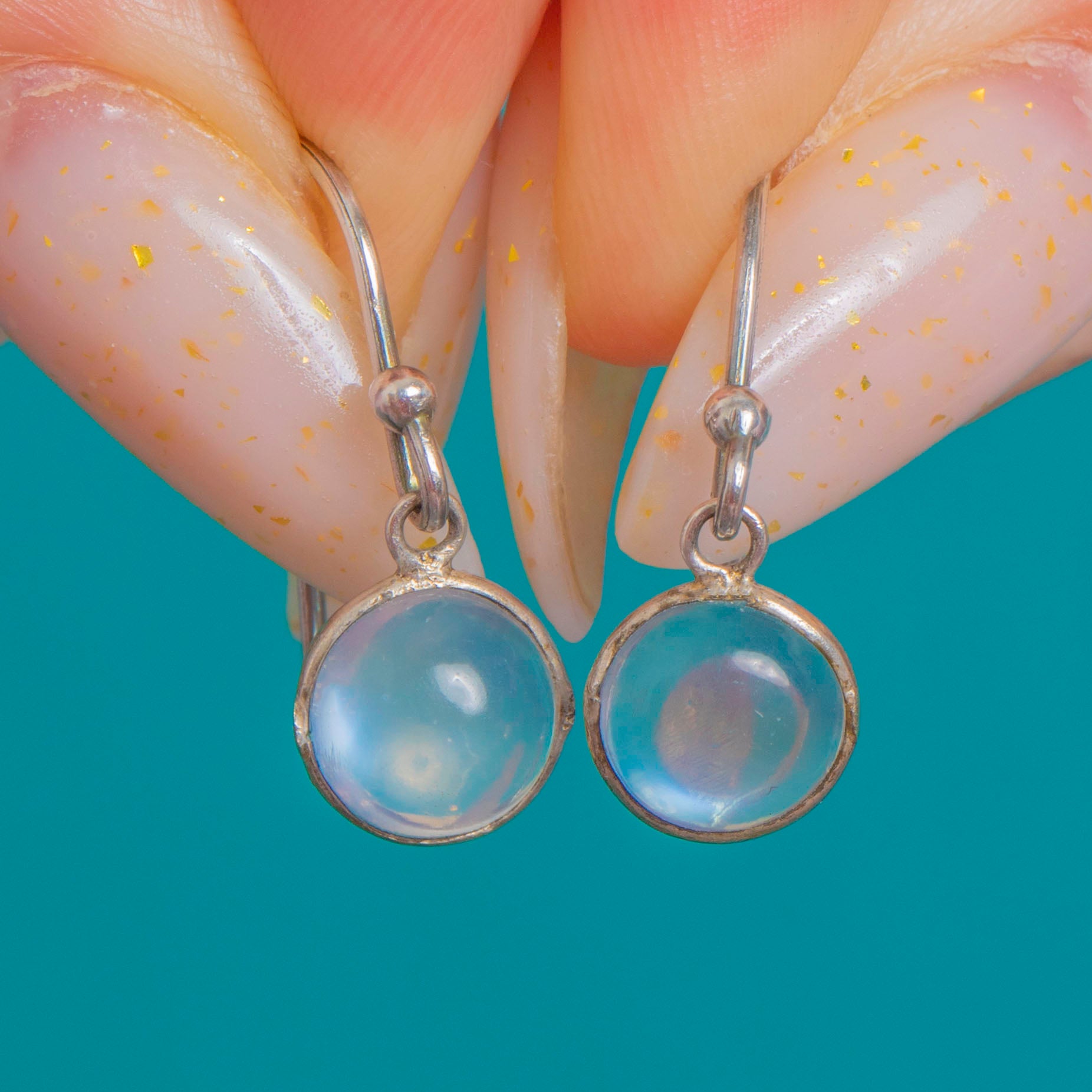 Ethereal and elegant, these Edwardian Moonstone drops capture the dreamy glow collectors adore. Each round cabochon shows a soft milky body with a vivid blue adularescent flash, set in sleek closed bezels and suspended from classic French hooks for effortless sway.