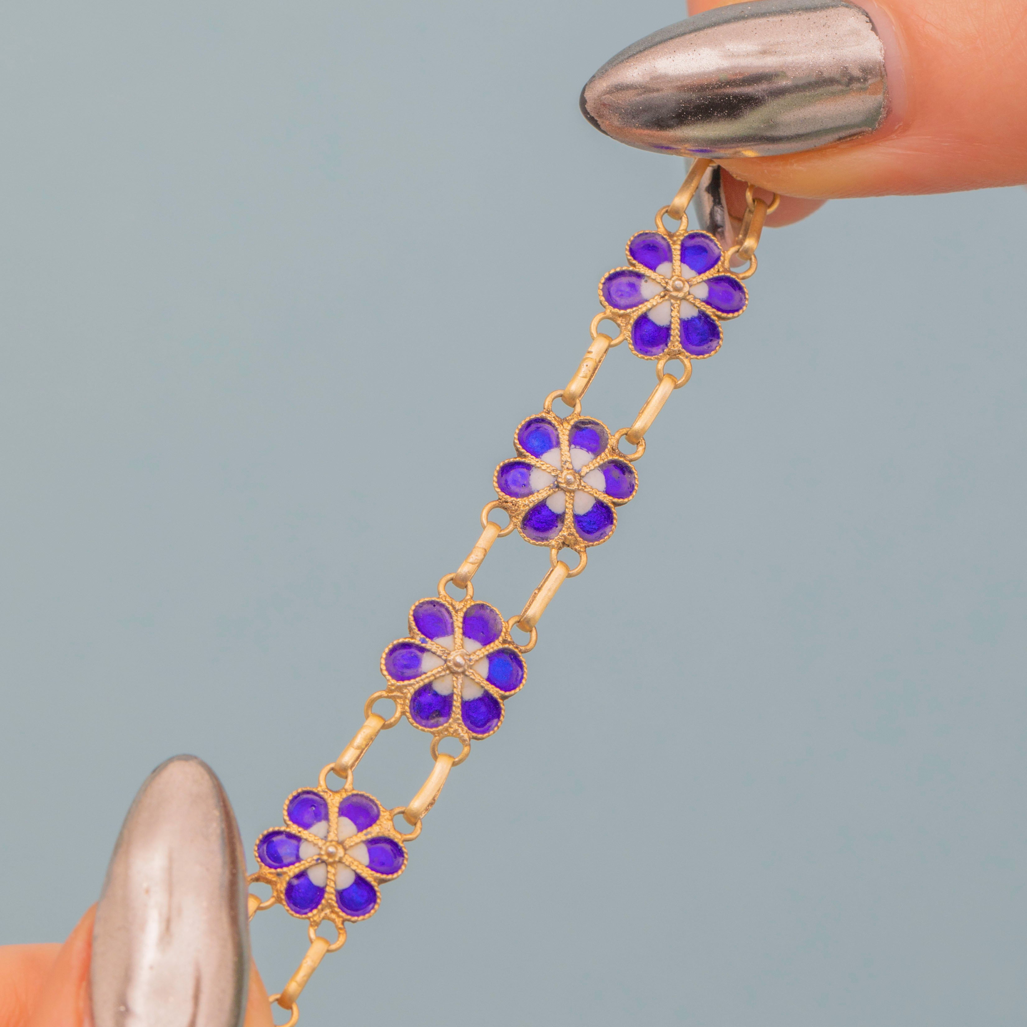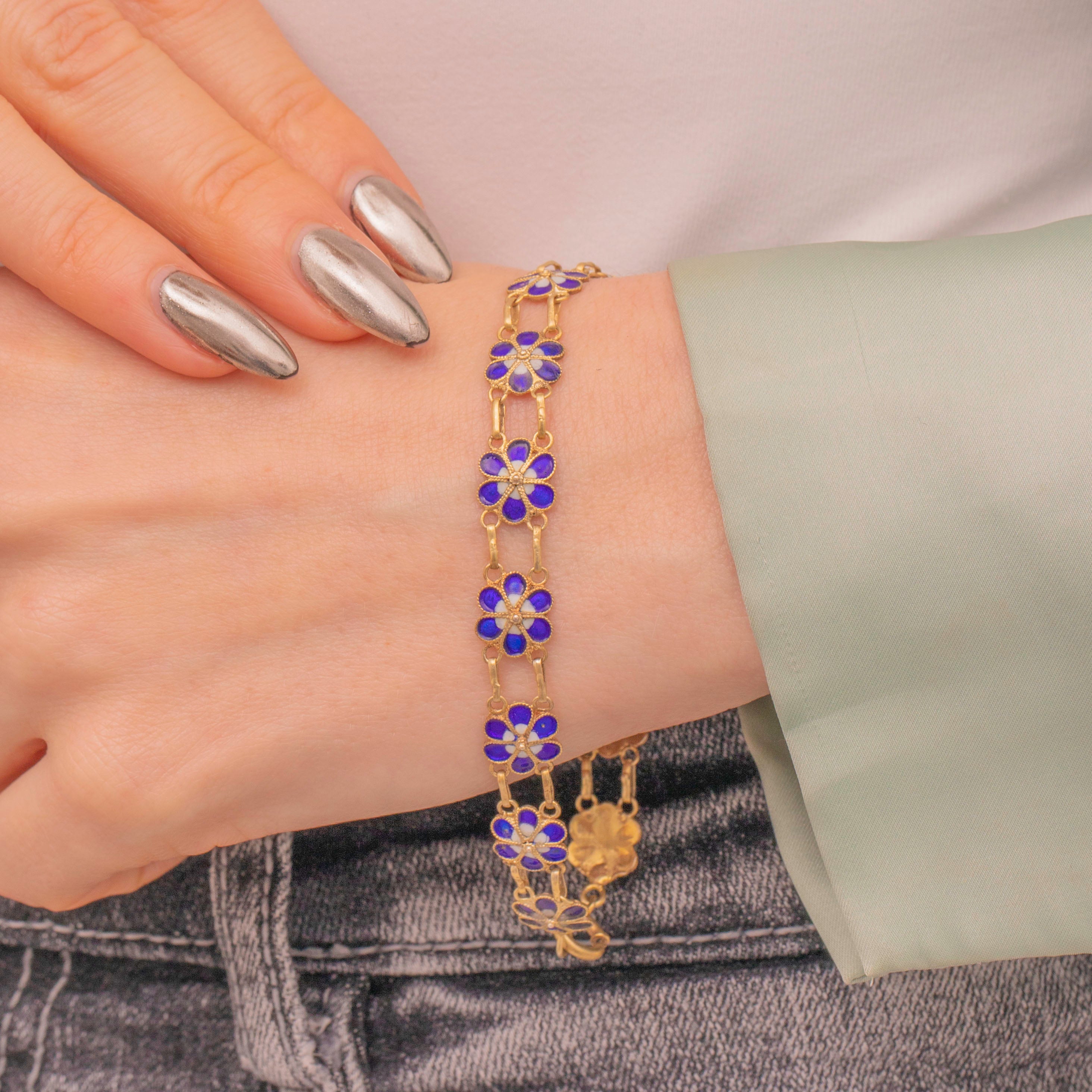VERY GOOD. This antique Silver blue Enamel forget-me-not bracelet is in very good condition. The links are securely connected and the Enamel has a lovely hue with only minor surface wear throughout. The bolt ring is in perfect working condition, allowing you to wear this eye-catching antique Enamel flower bracelet with absolute confidence!