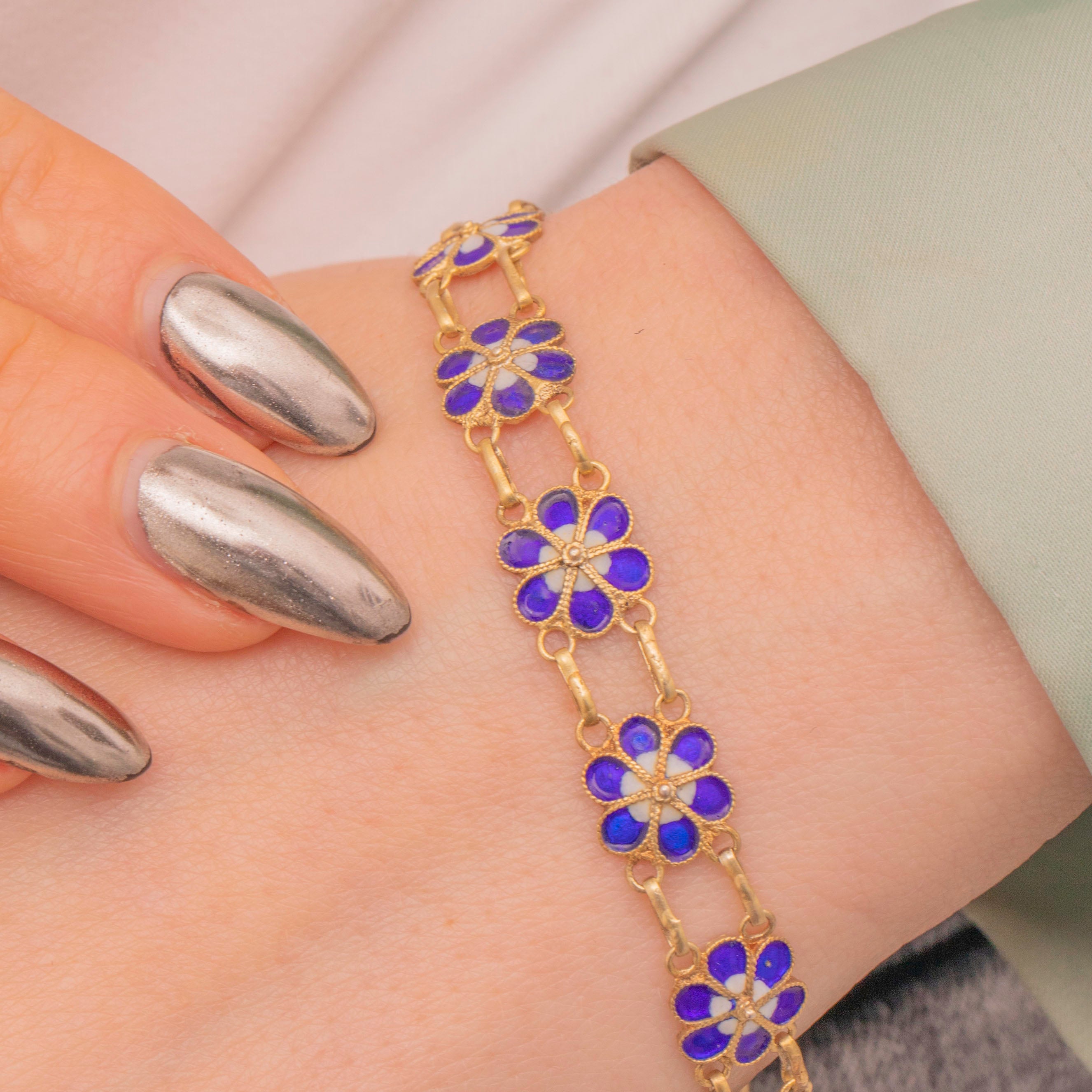 This pretty antique Silver blue Enamel forget-me-not bracelet will bring a lovely pop of colour to your wrist! Exquisitely crafted from Silver, each ornate flower has been inlaid with vibrant blue Enamel giving depth and character to this romantic piece.