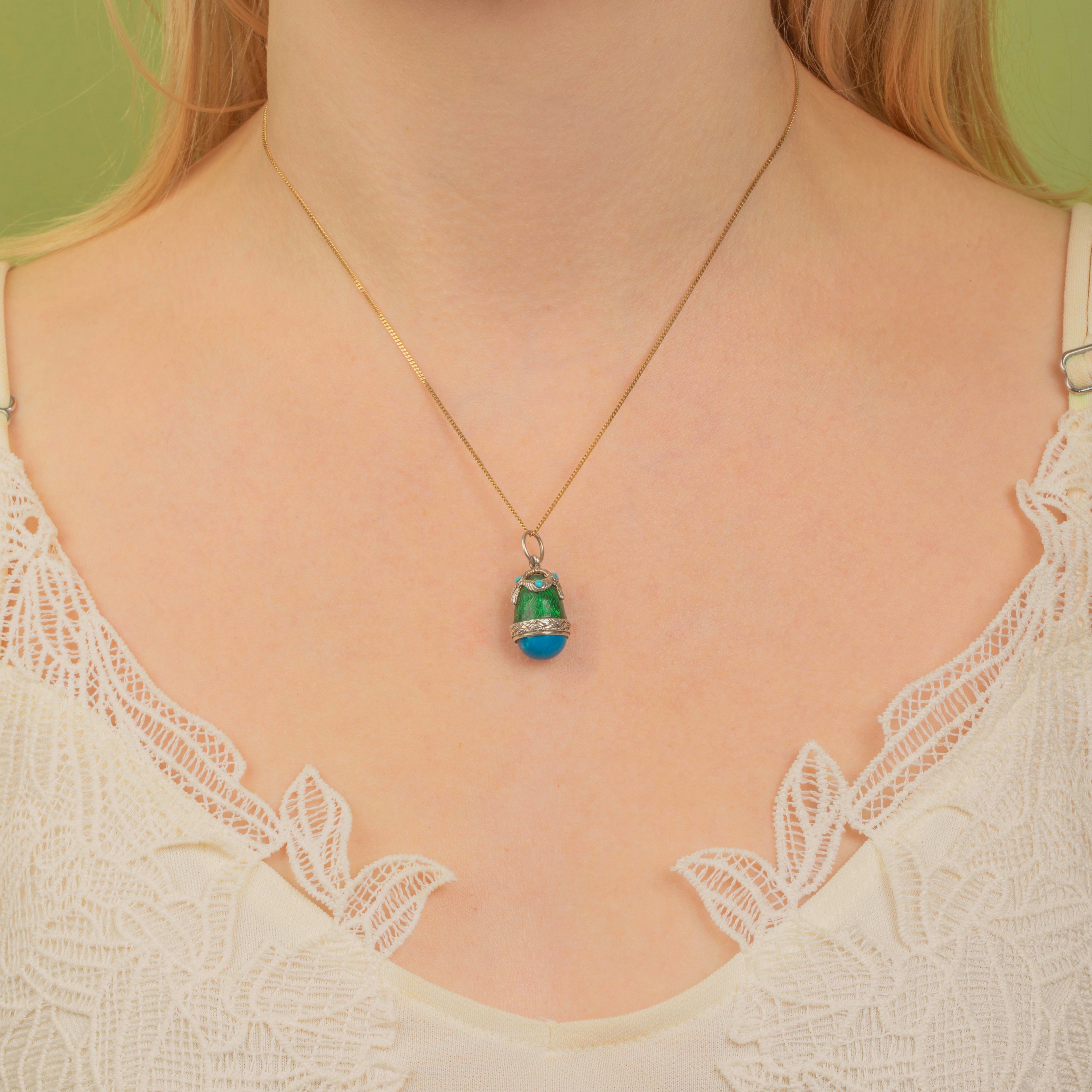 EXCELLENT. This antique Silver Blue & Green Enamel egg pendant is in excellent condition. The vibrant Green and Blue Enamel is free from chips or cracks, while the Silver band features well-defined engravings. The bale and setting exhibit a lovely light patina. Overall, this pendant is a beautifully preserved piece ready to be enjoyed.