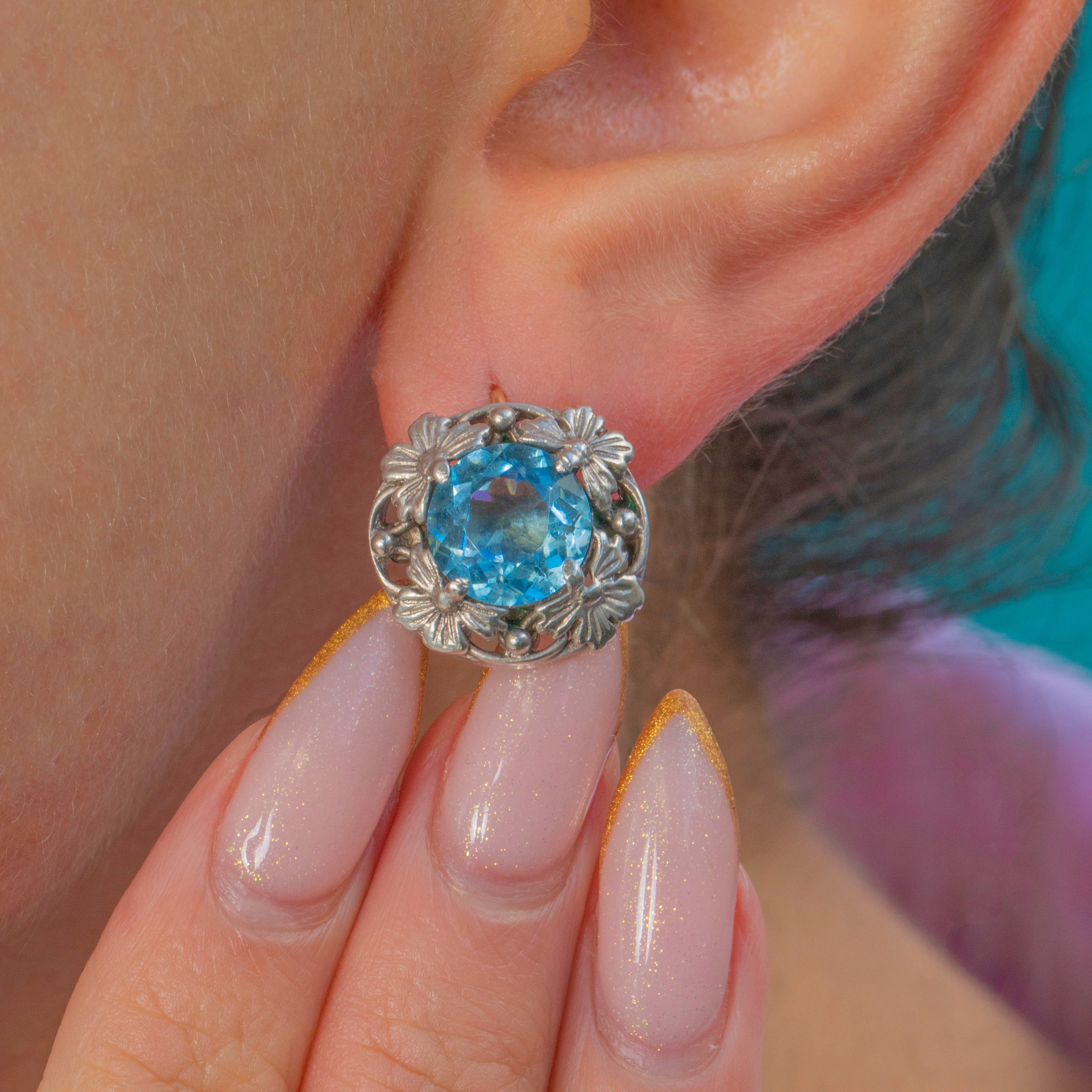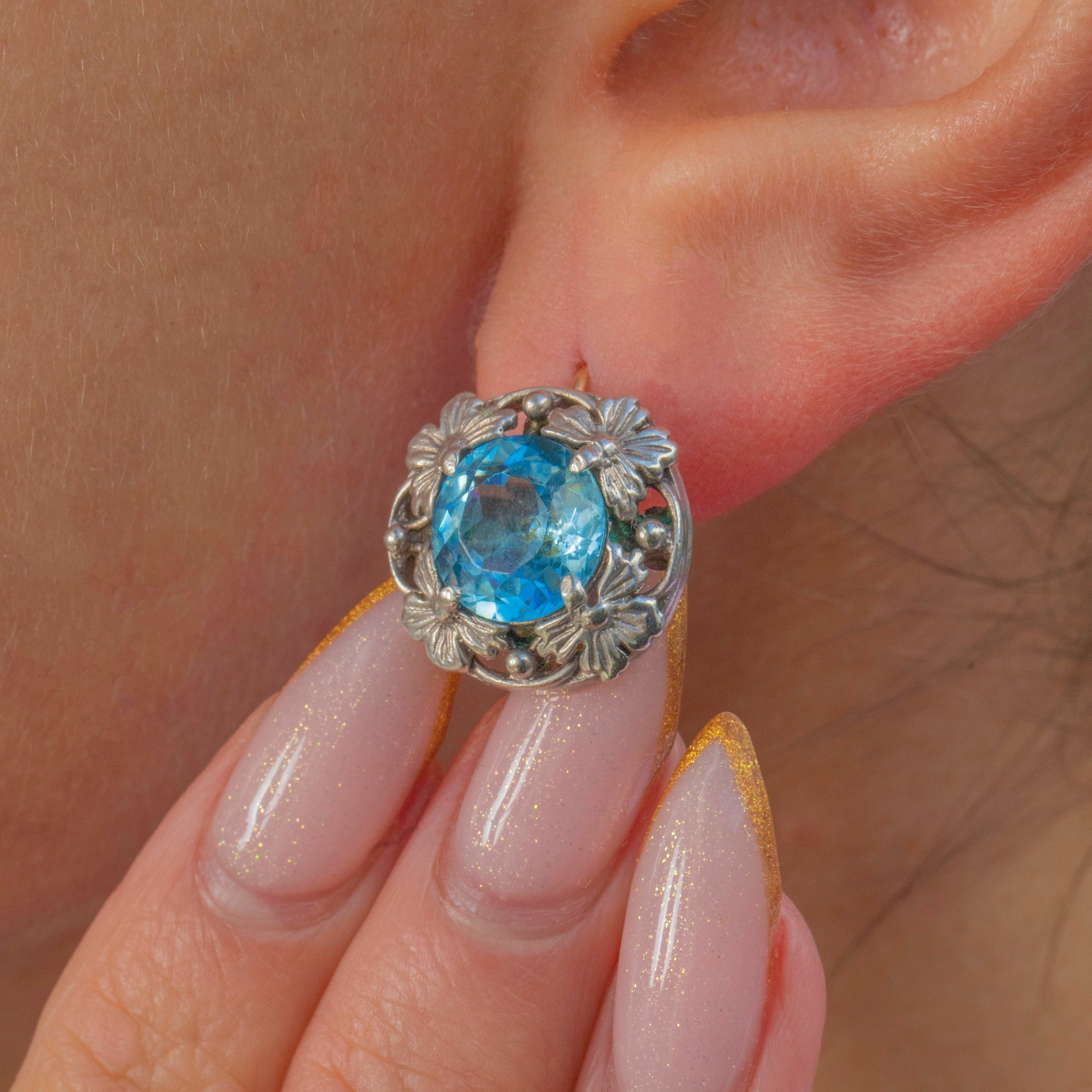 These Edwardian Silver earrings feature sparkling Blue Paste stones framed by a beautifully detailed openwork floral surround. The vivid blue stones capture the light beautifully, giving them the appearance of bright Aquamarines and adding an elegant pop of colour.