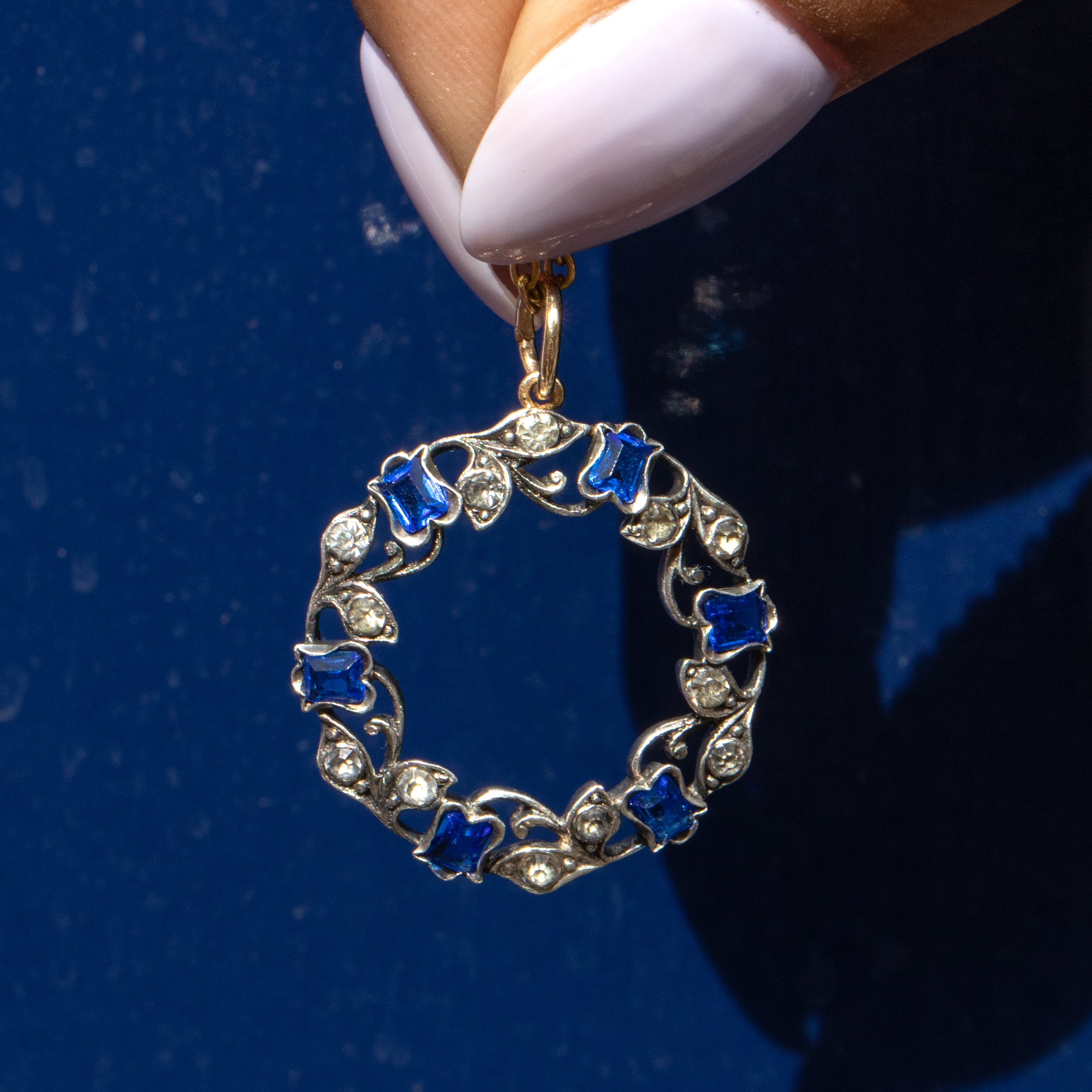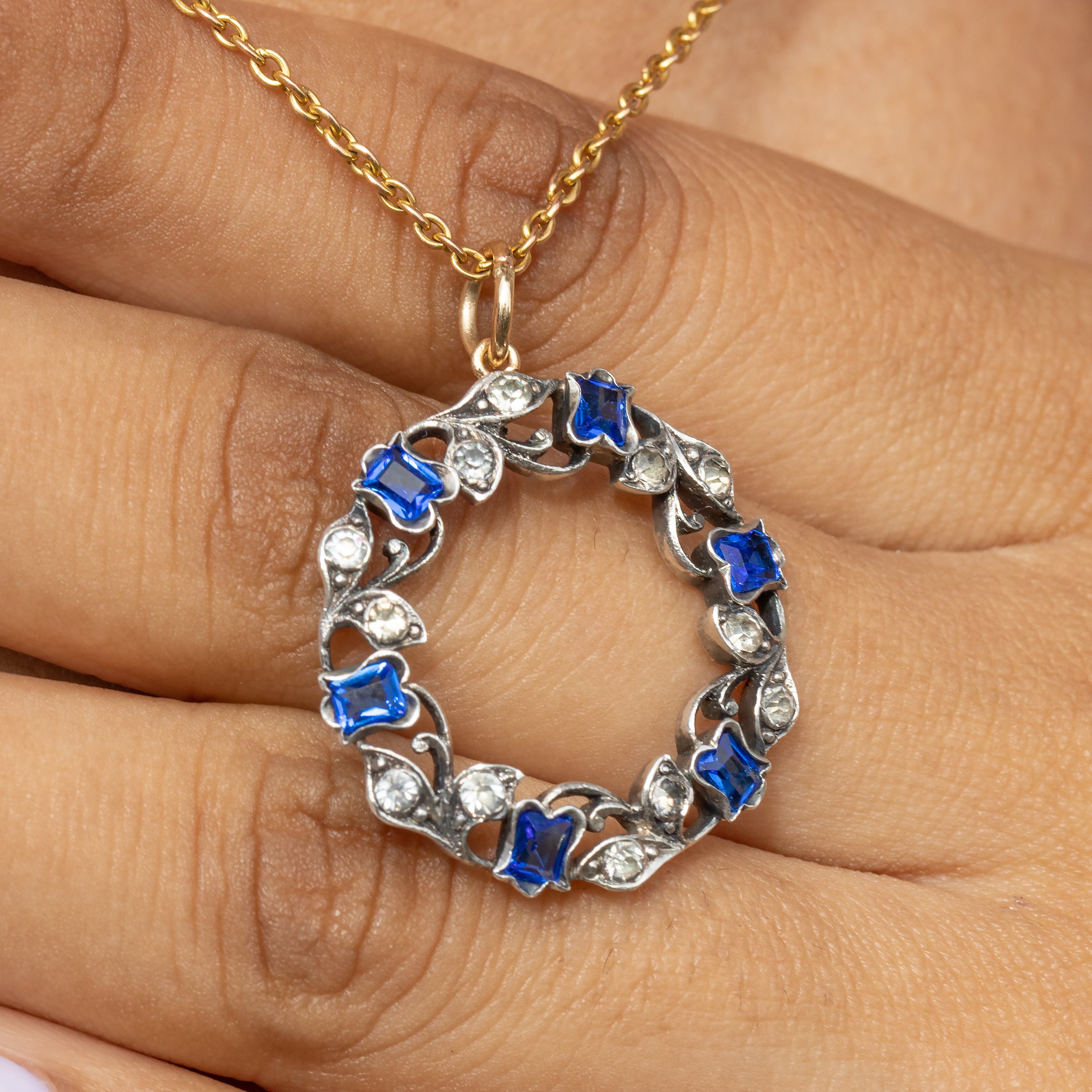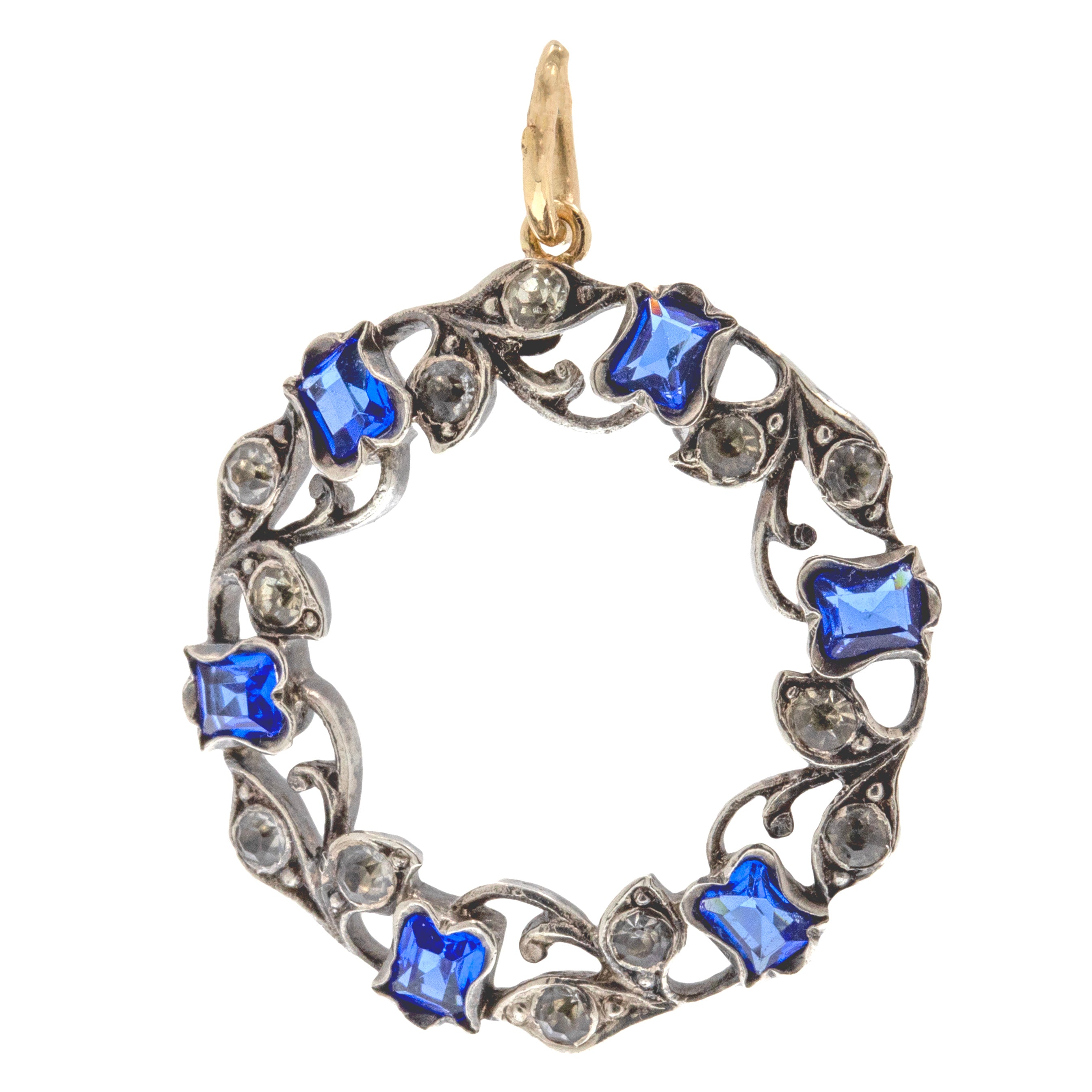 This antique Silver blue Paste roundel pendant captures the exquisite craftsmanship of the Victorian era, with intricate details forming the captivating roundel! Crafted from Sterling Silver, this antique pendant boasts blue Paste tulips surrounded by white Paste leaves to create this ethereal wreath.