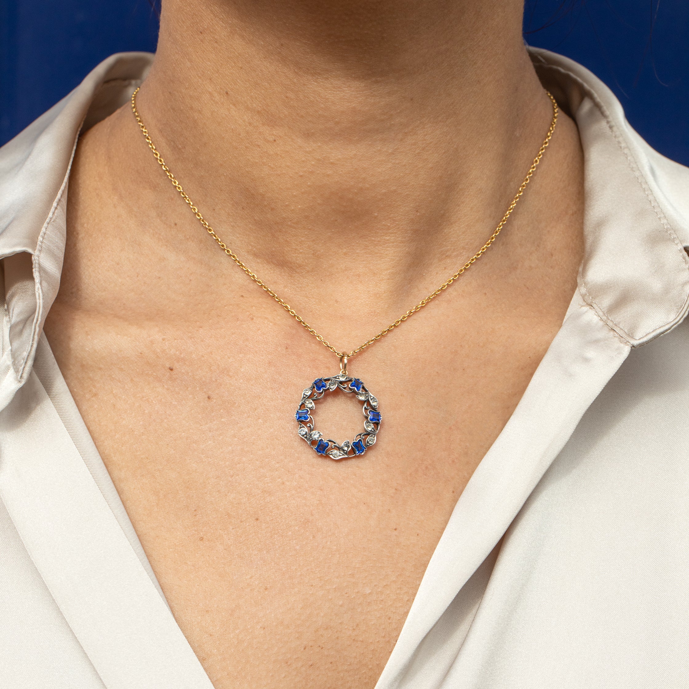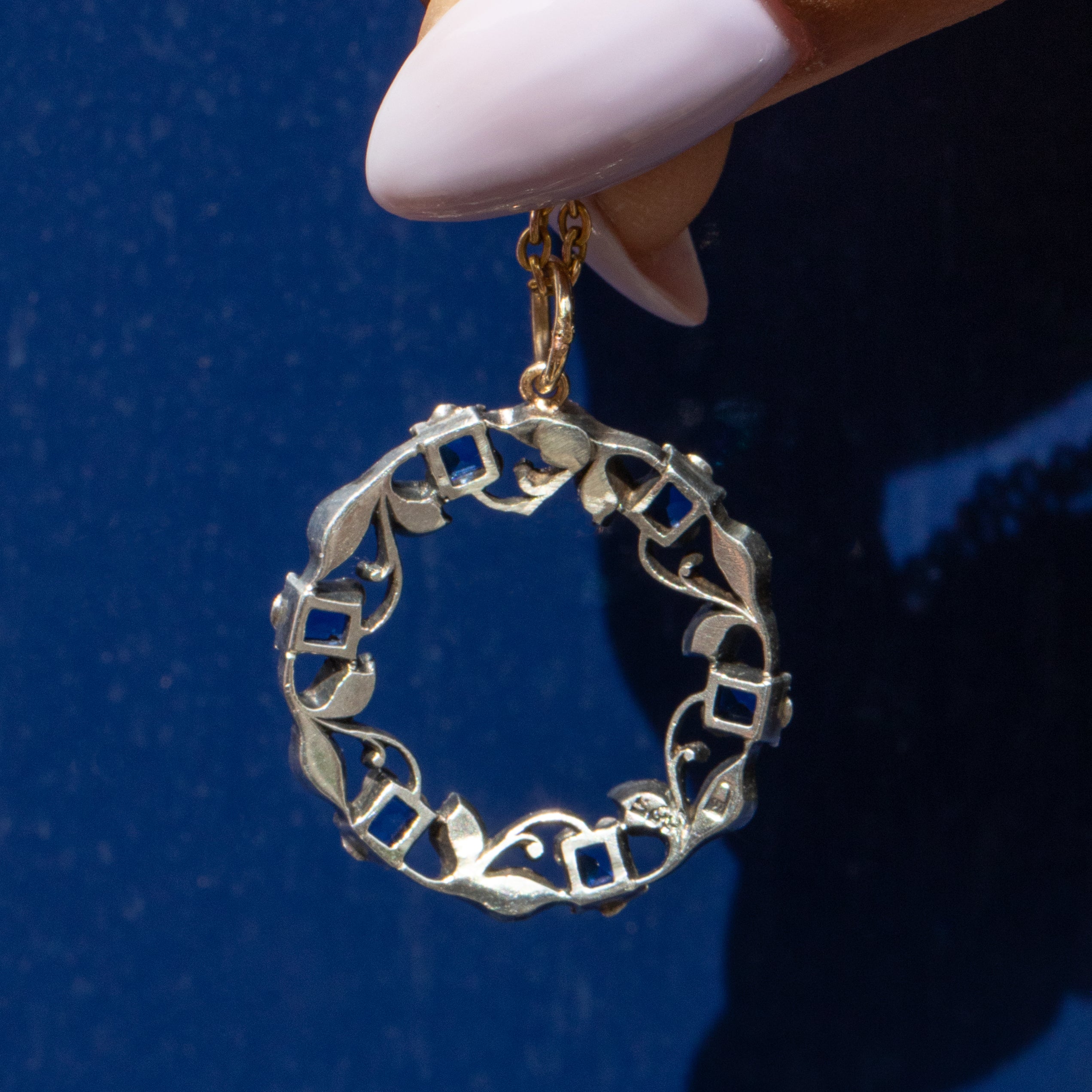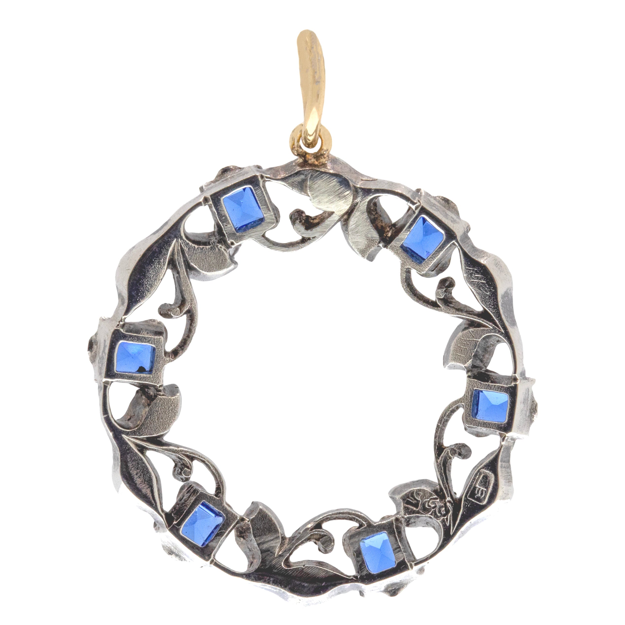 This antique Silver blue Paste roundel pendant captures the exquisite craftsmanship of the Victorian era, with intricate details forming the captivating roundel! Crafted from Sterling Silver, this antique pendant boasts blue Paste tulips surrounded by white Paste leaves to create this ethereal wreath.