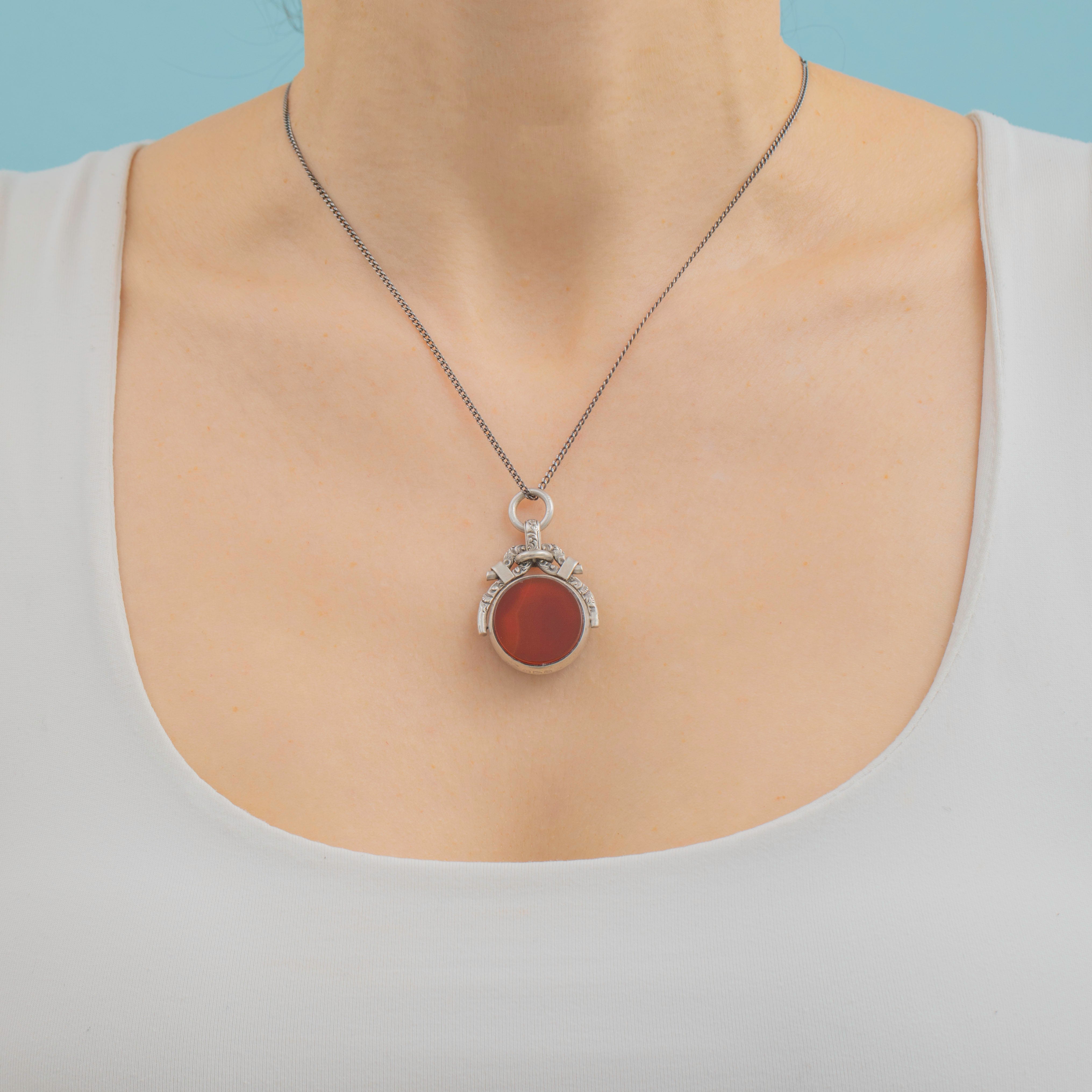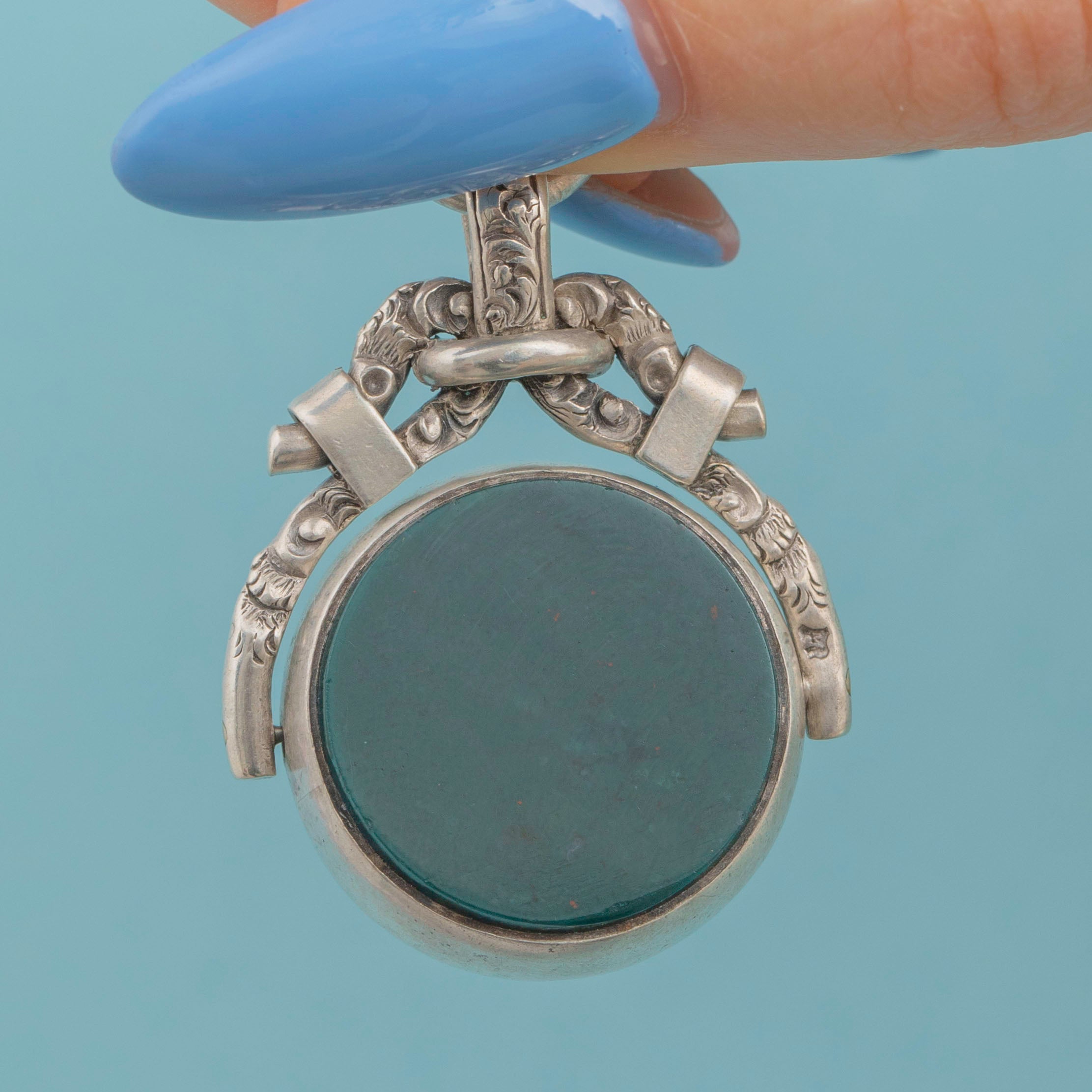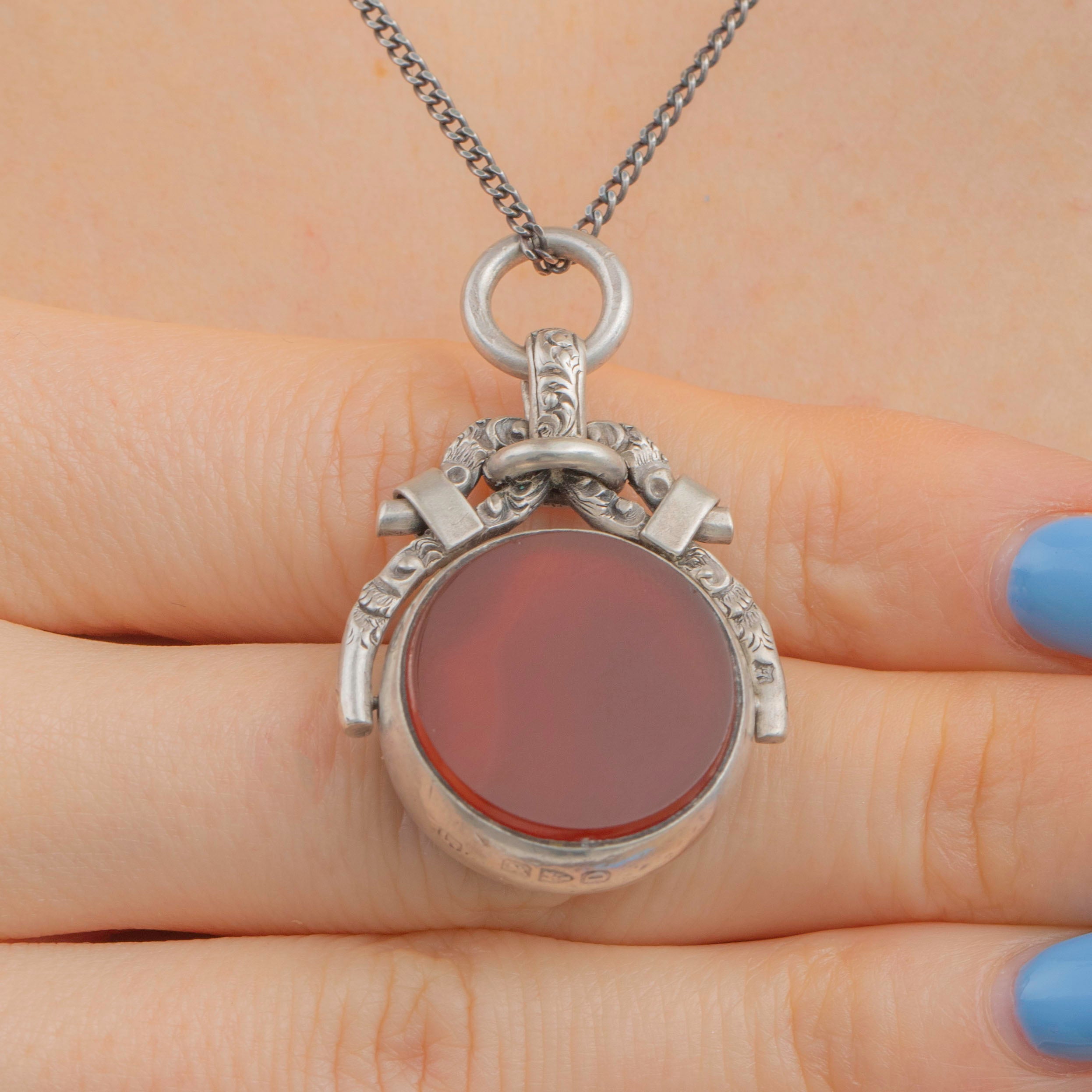 VERY GOOD-EXCELLENT. This antique Silver Engraved Bloodstone Carnelian swivel fob is in excellent condition. The Bloodstone and Carnelian are secure within their setting, with only some minor surface wear commensurate with age. The Silver is bright and has accrued a light patina within the engraved details adding to the pendant's antique charm!