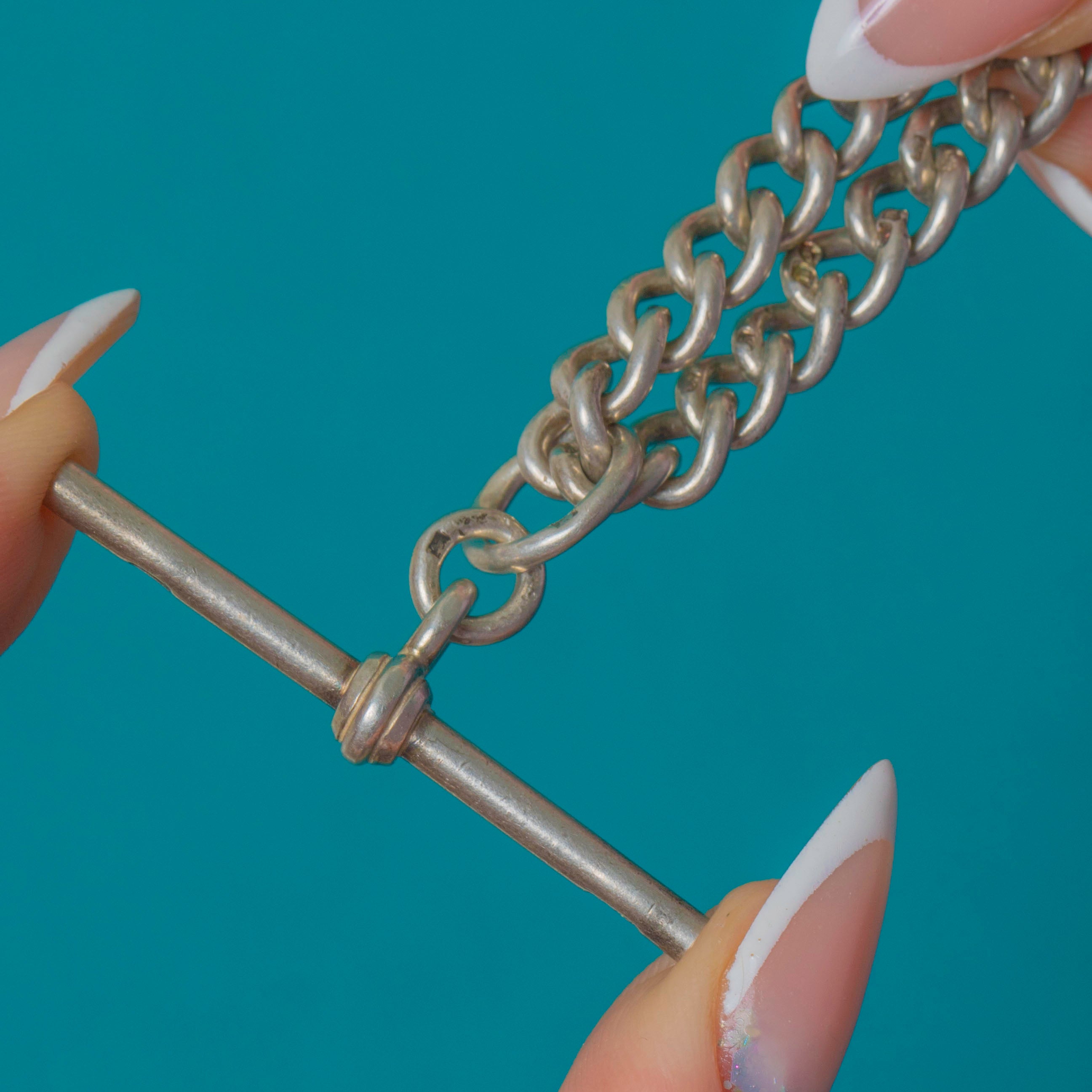 Albert Chains are a must-have for any collector and this Edwardian Silver graduating Albert chain is no exception! This antique curb chain is centred by a suspended t-bar pendant, but you could choose to style the chain with the desirable double dog-clips as the focal point, providing you with space to affix a charm or pendant.