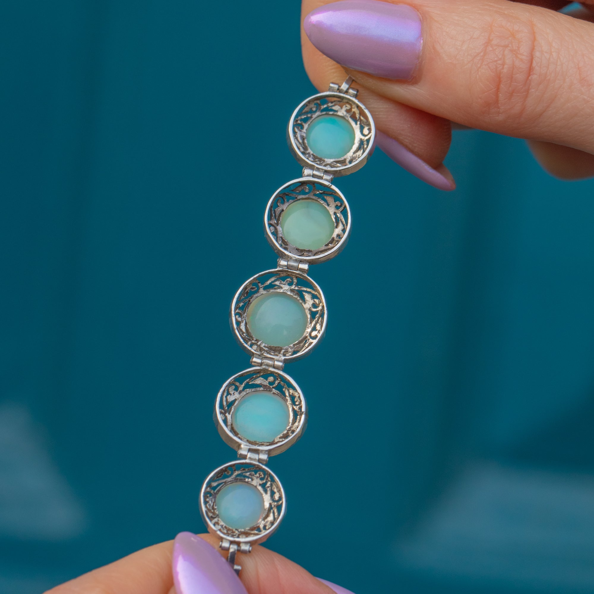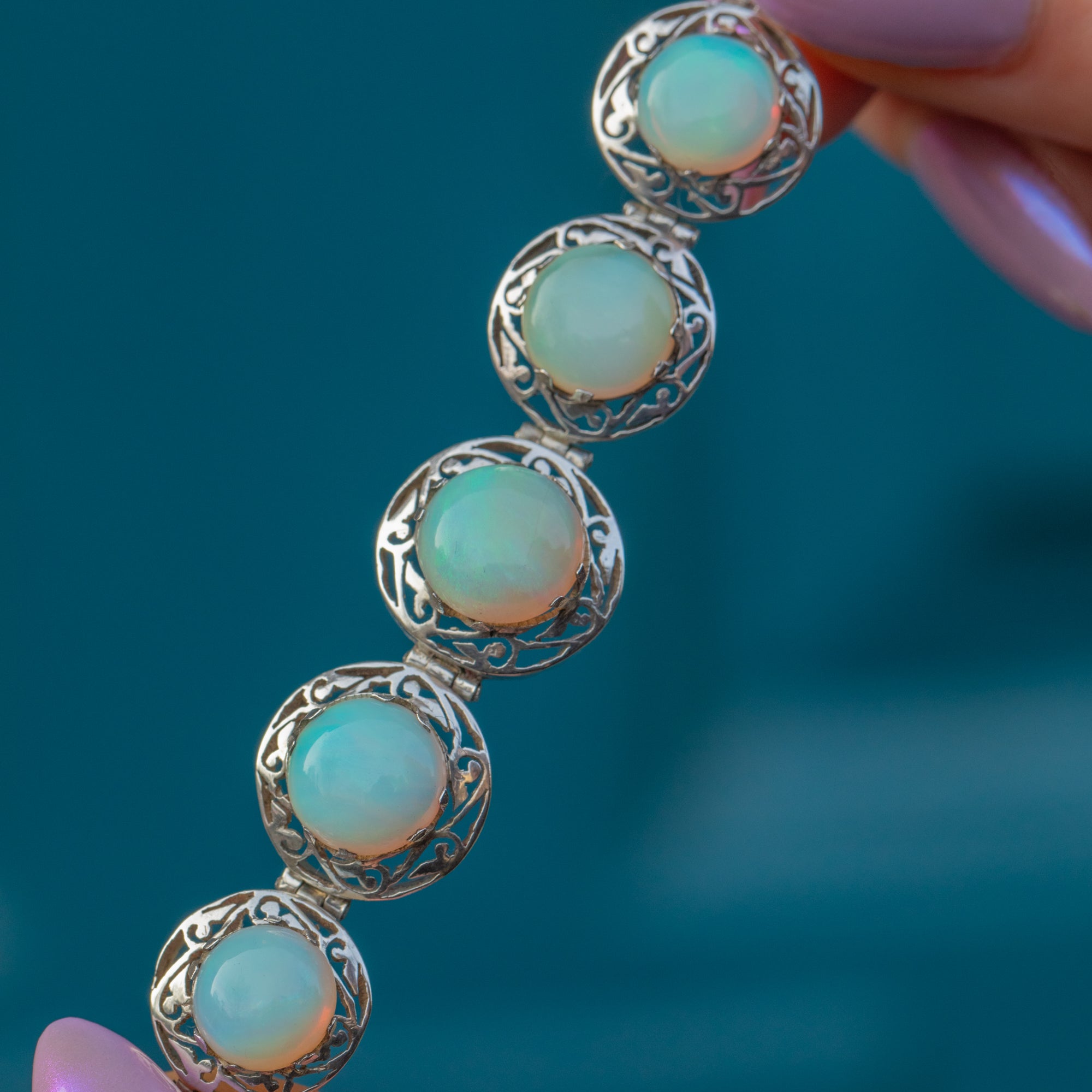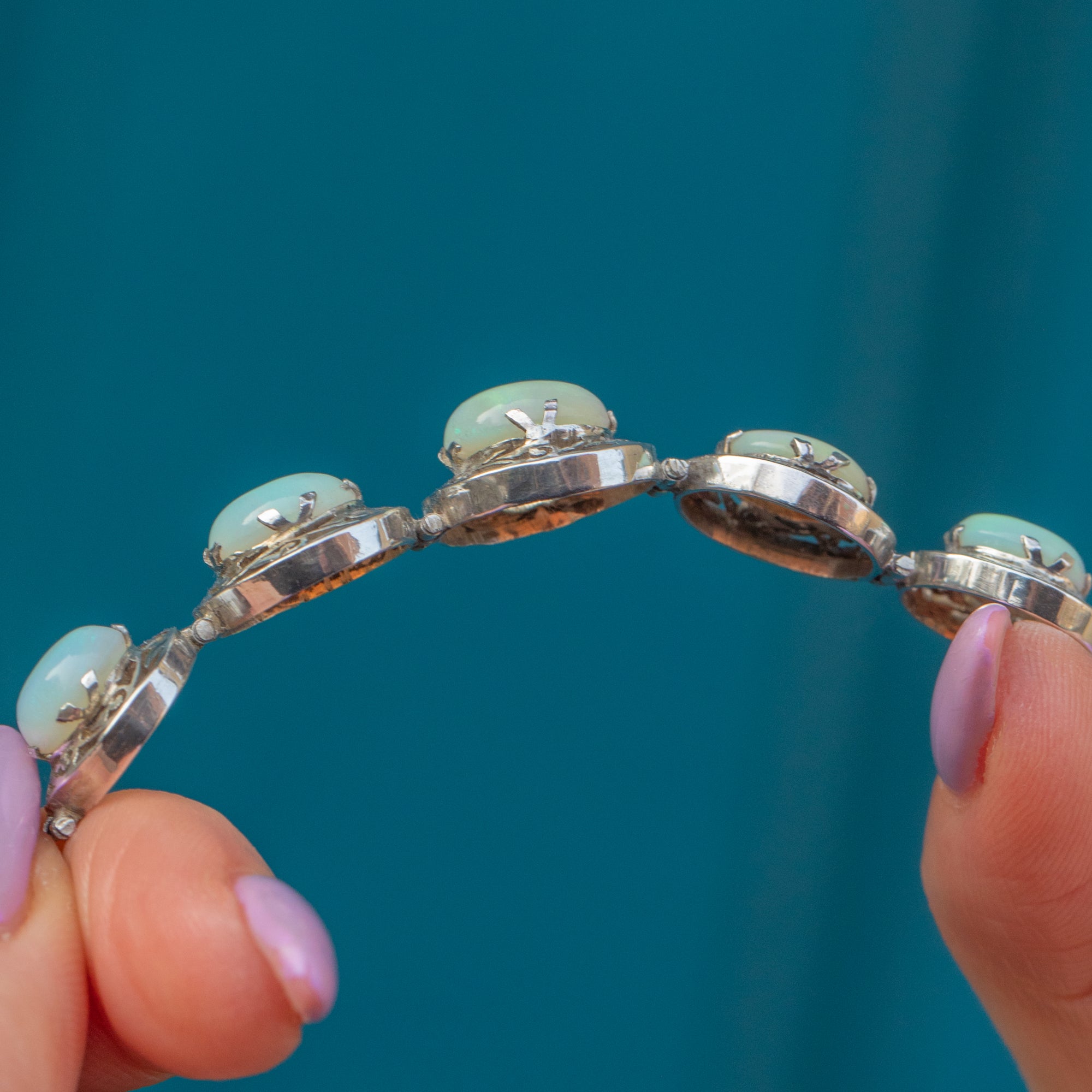 This antique Silver graduating Opal cabochon bracelet is delightful! This exquisite early 20th-century antique Silver bracelet features five mesmerising natural solid Opal cabochons, elegantly set atop intricate openwork silver.