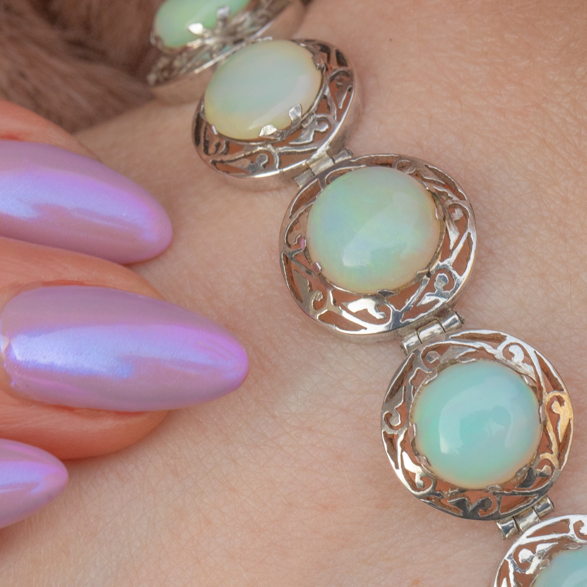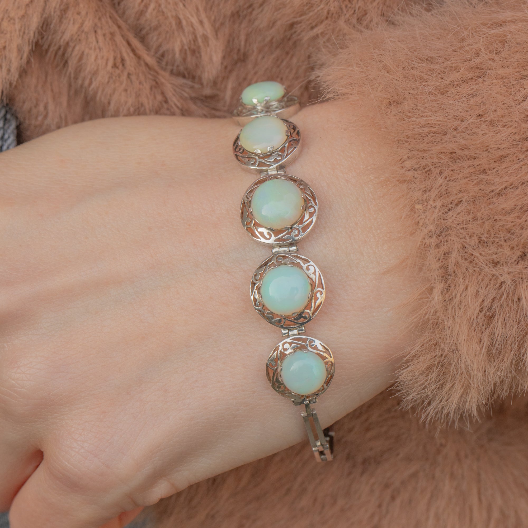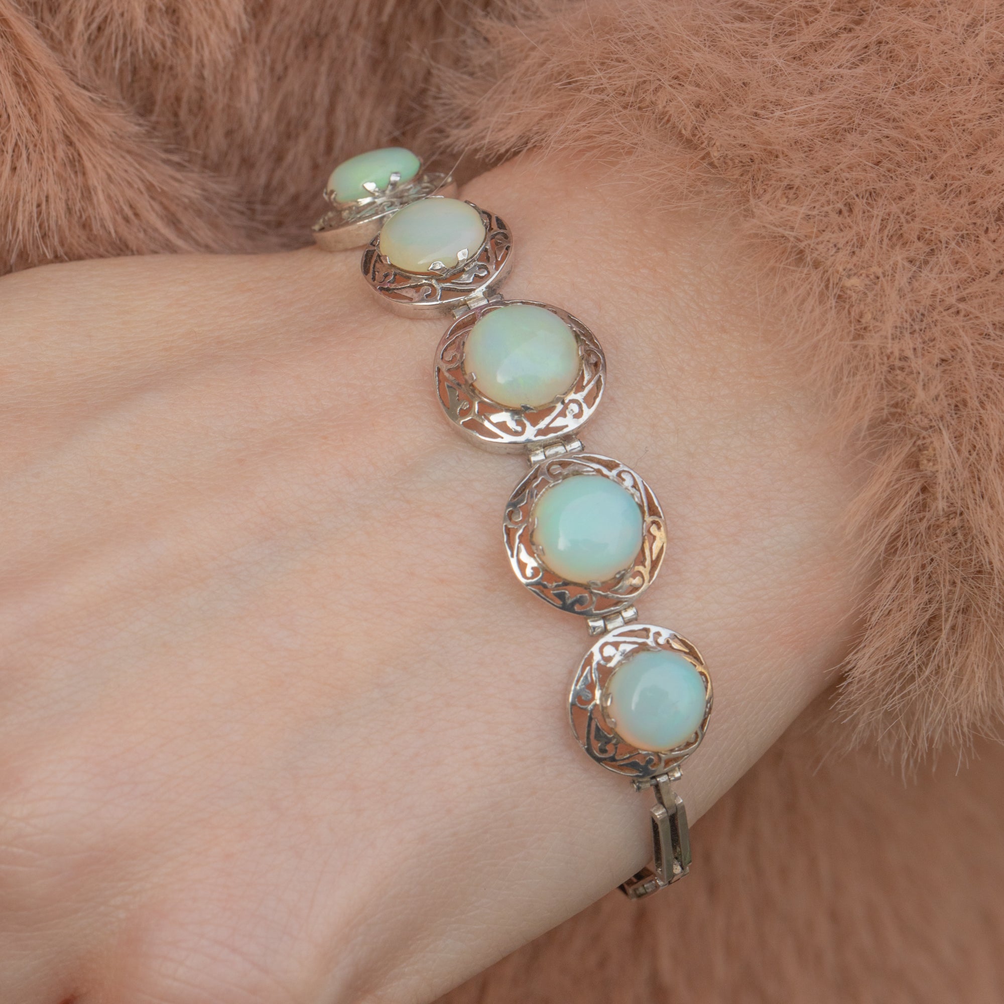This antique Silver graduating Opal cabochon bracelet is delightful! This exquisite early 20th-century antique Silver bracelet features five mesmerising natural solid Opal cabochons, elegantly set atop intricate openwork silver.