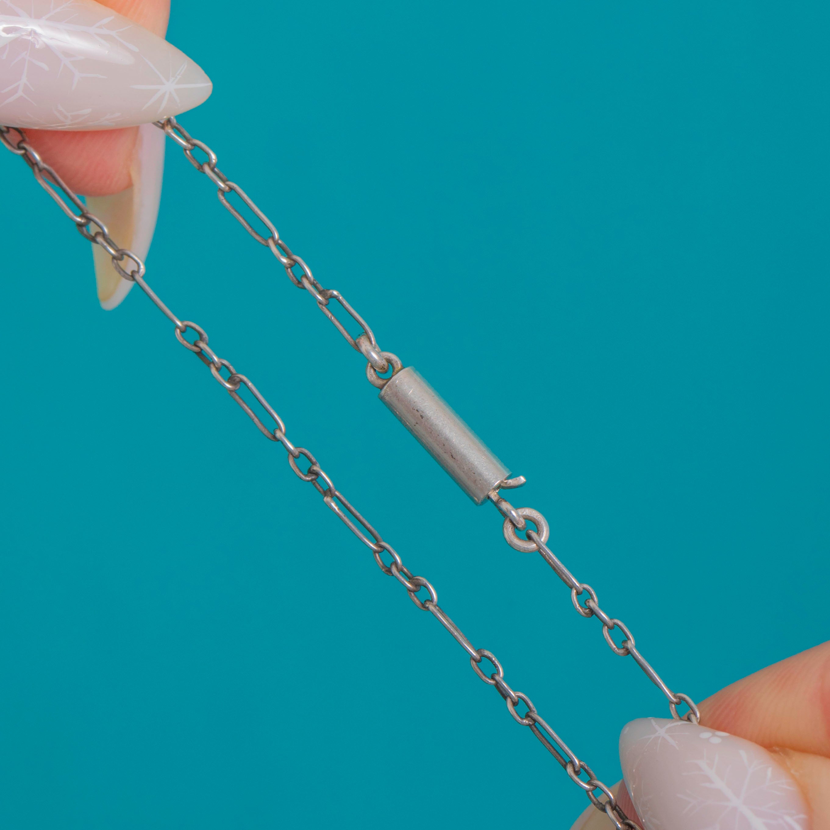 The articulated front is anchored to a fine elongated link chain and fastens with a barrel clasp, all with a graceful, time-worn patina. A striking yet delicate piece from the 1920s that brings joyful colour and elegant sparkle to any look.