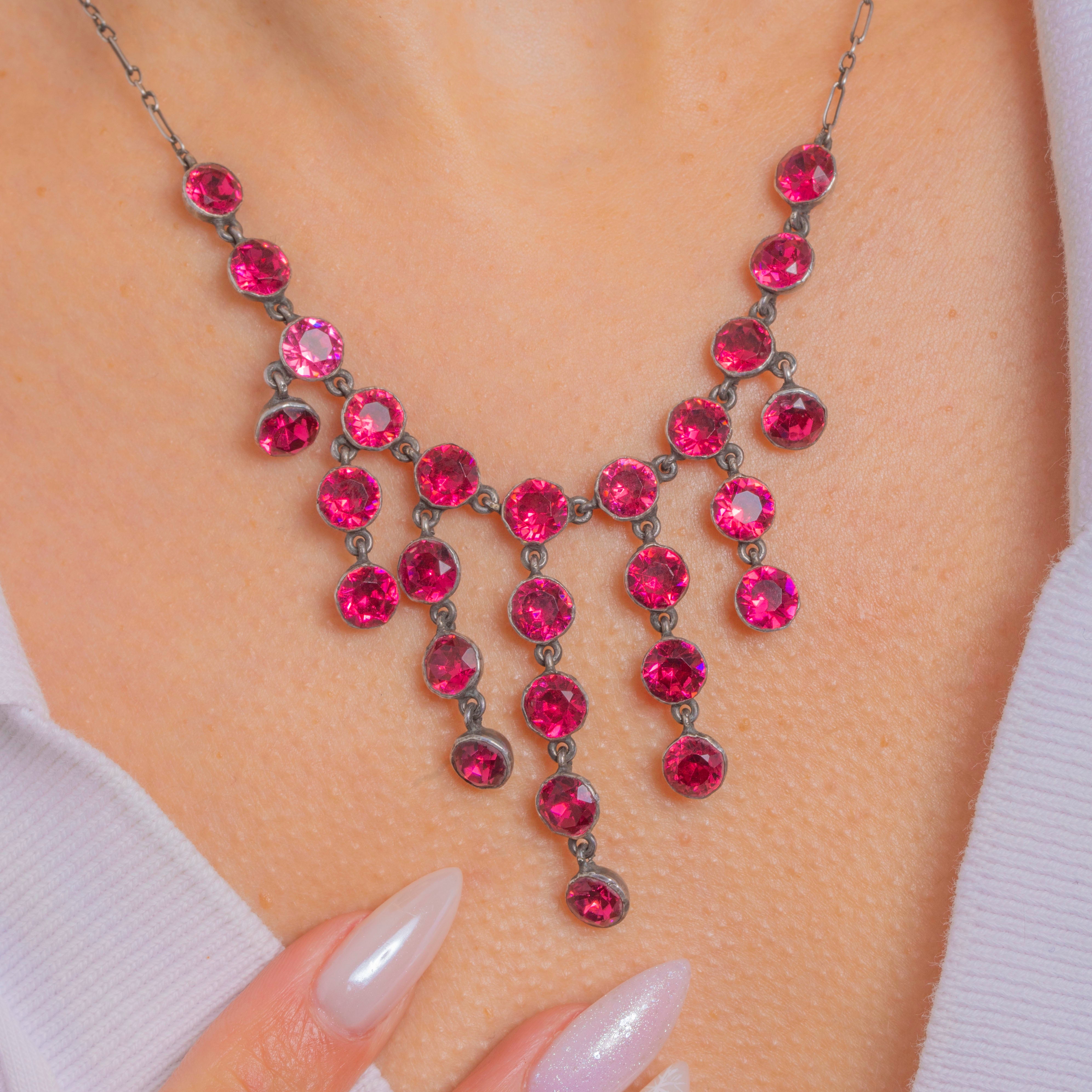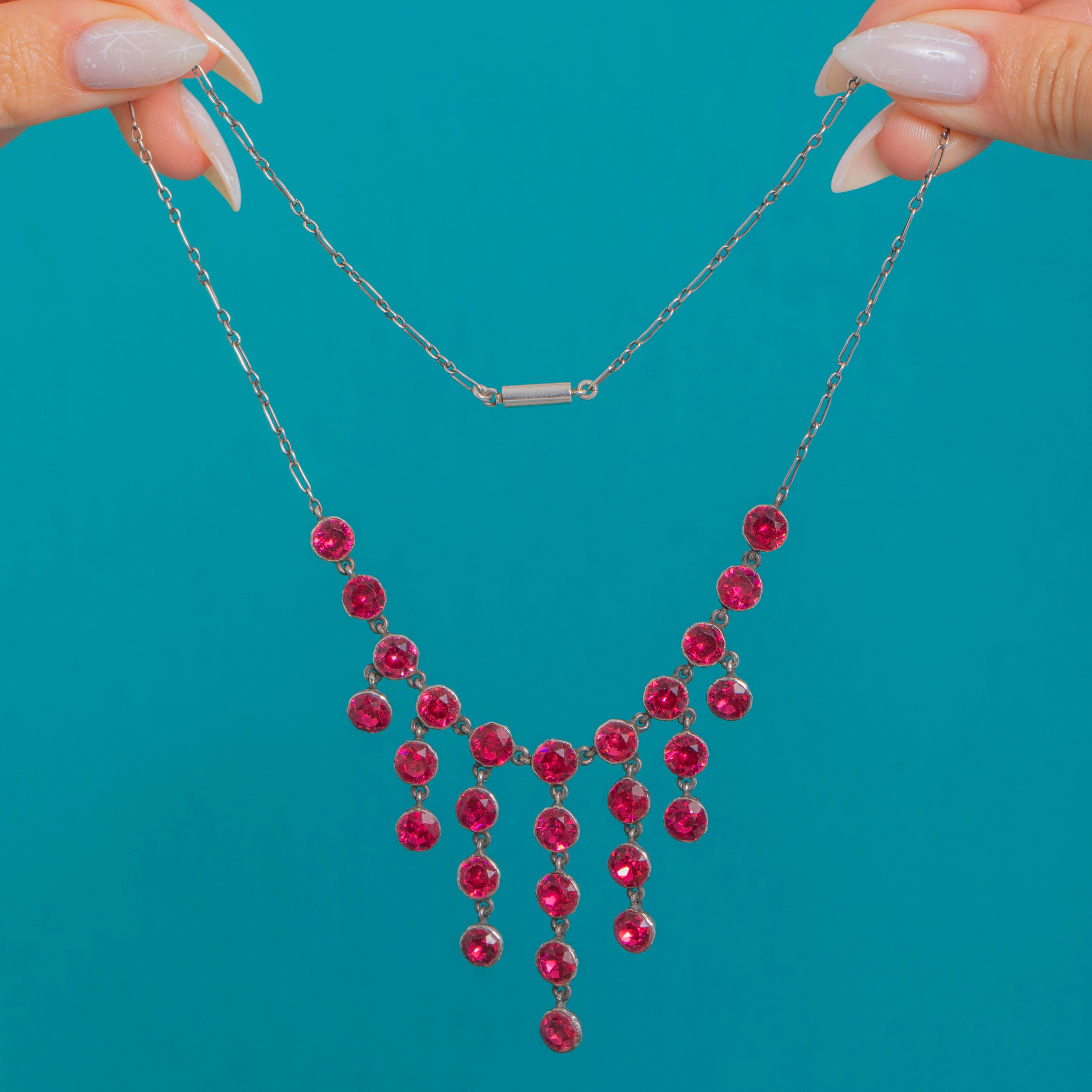 Vivid and vivacious, this Art Deco cascade necklace dazzles with a rivière of hot pink Paste stones culminating in five graduated fringe drops. Each round, faceted jewel is cradled in Silver bezel settings and linked for beautiful fluidity and movement. Orange foils beneath the stones lend a warm, sunset glow, amplifying the fuchsia hue for an undeniably glamorous finish.