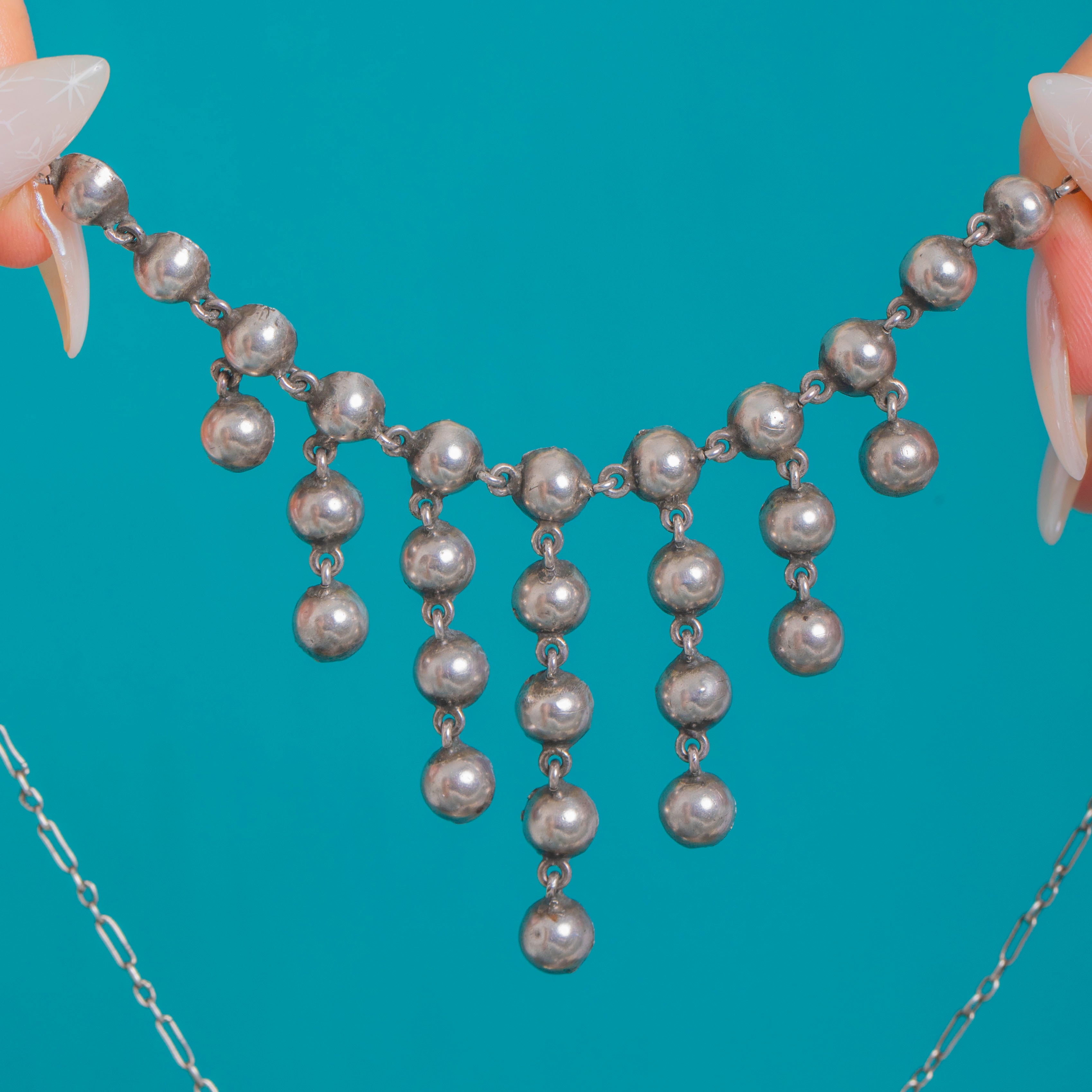 EXCELLENT: The Paste stones are bright and well-matched with only minor facet wear visible under close inspection. Bezel settings, links, and clasp are secure with a pleasing, even patina to the Silver. No signs of repair, and overall the necklace has been very well cared for.