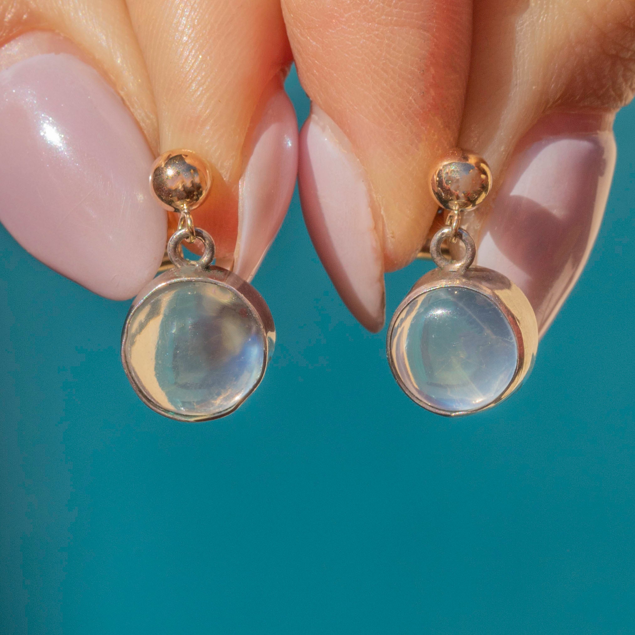 Moonstones are 7.5mm in diameter, weighing approx. 1.16ct combined.