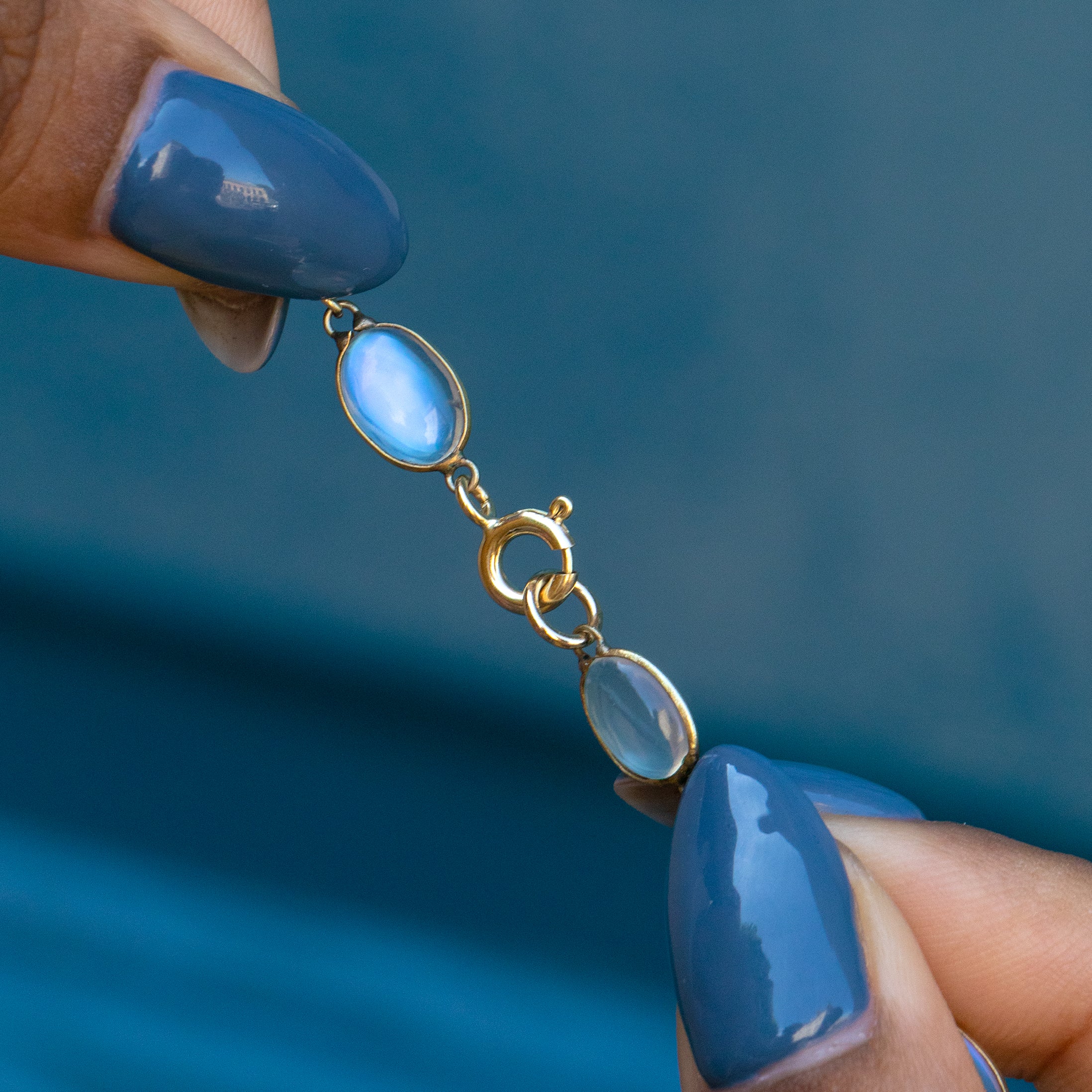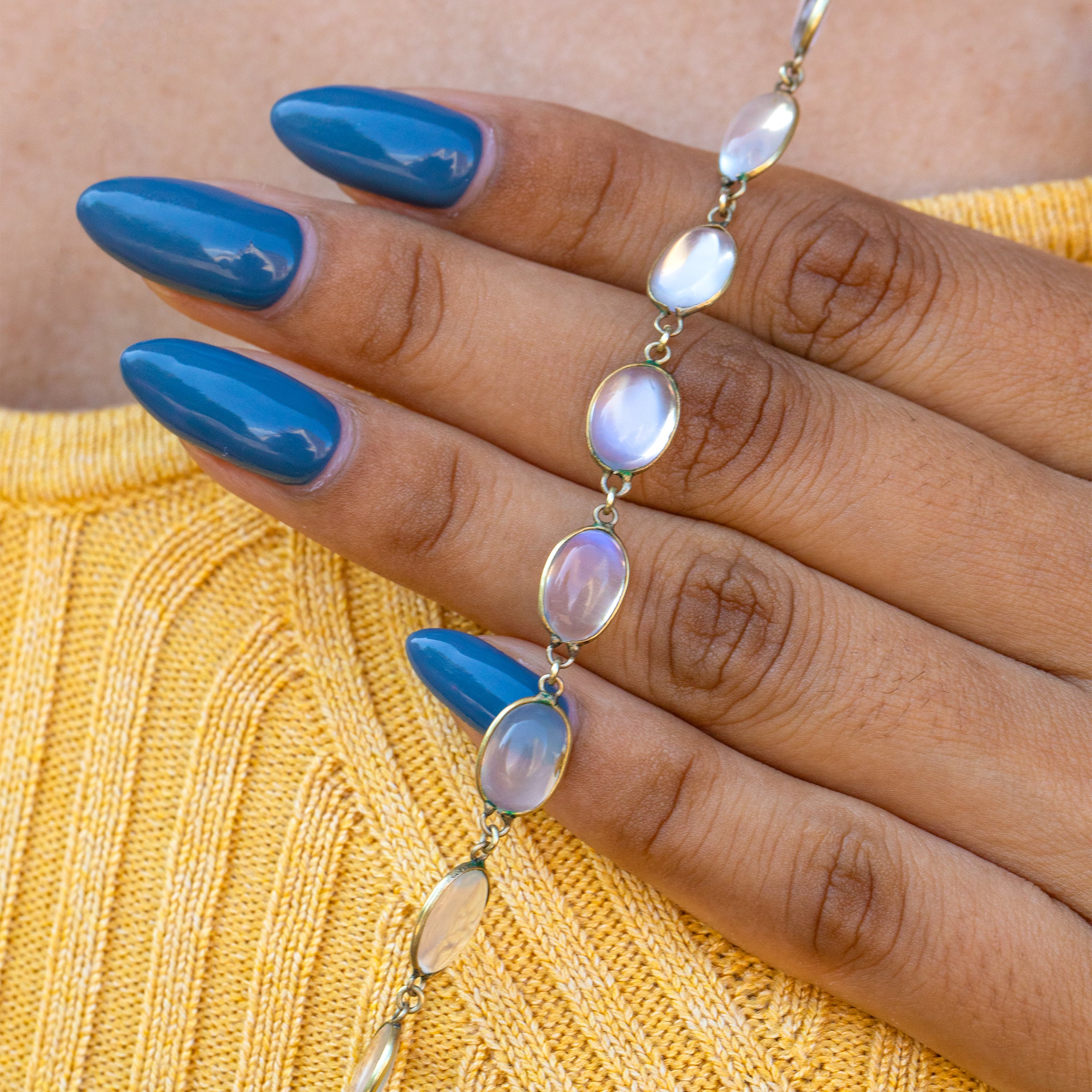 What an antique Silver Moonstone Riviere necklace! Each Moonstone is unique, but they all share their bright and luminous finish.