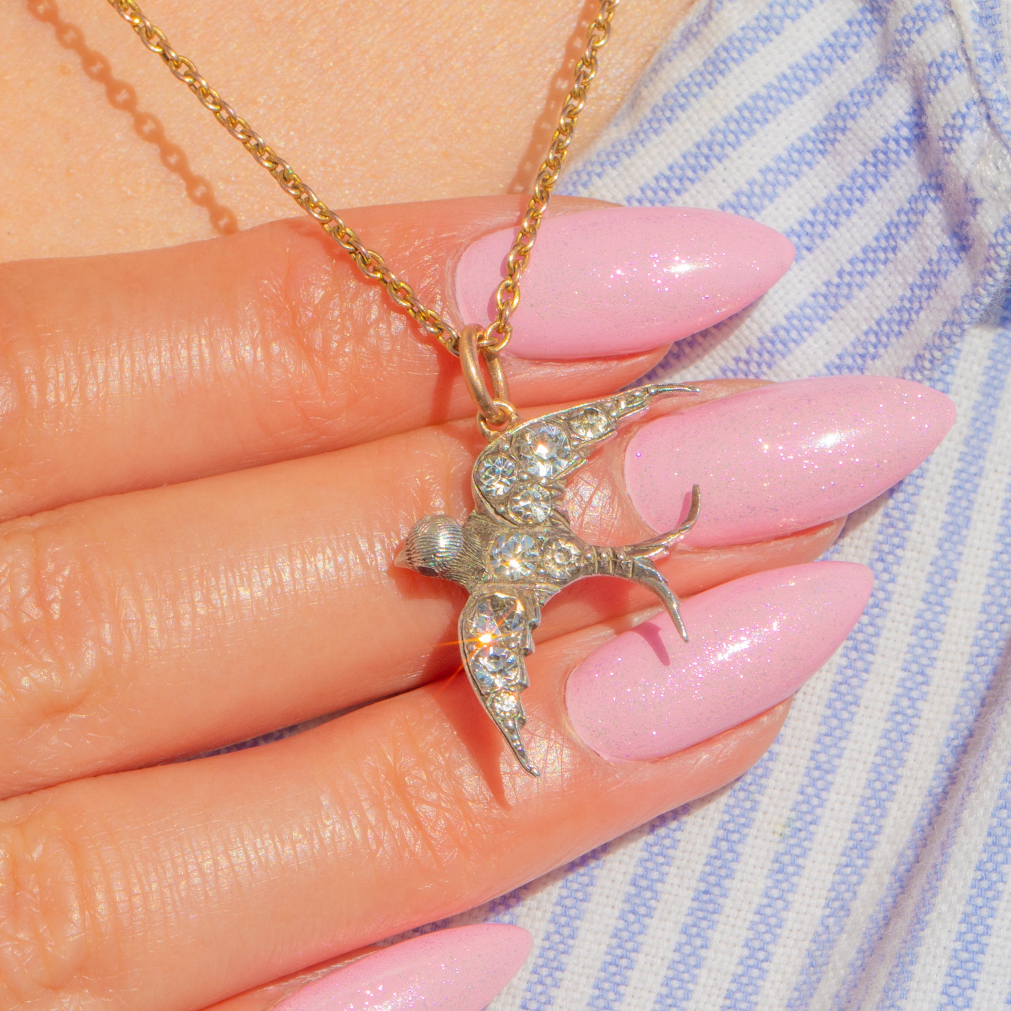 A charming Victorian Paste swallow pendant, finely crafted in bright 900 Silver with delicate pavé-set Paste that shimmer across the wings and body. The silhouette is graceful and compact, with crisp relief and subtle texturing that bring this little bird to life.