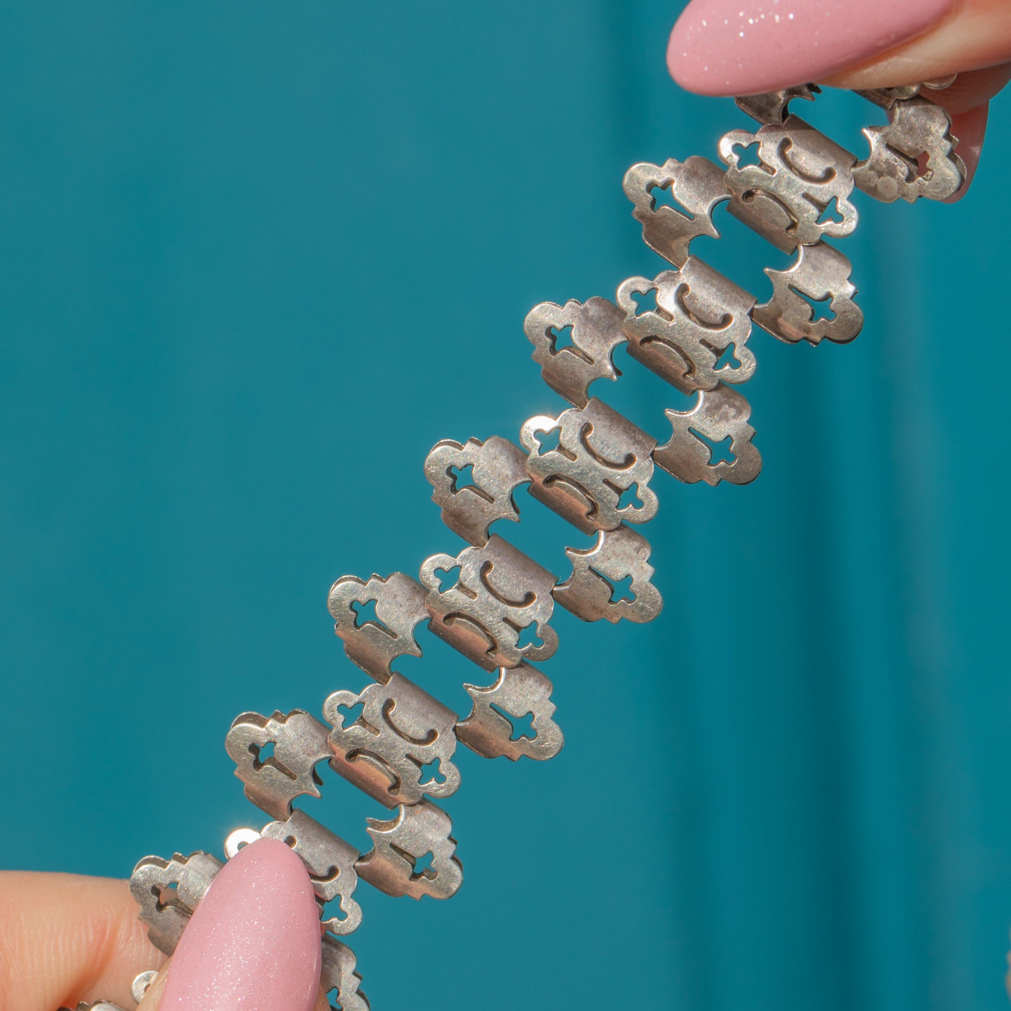 A striking example of Victorian Aesthetic design, this antique Silver pierced book chain is the ultimate statement piece!